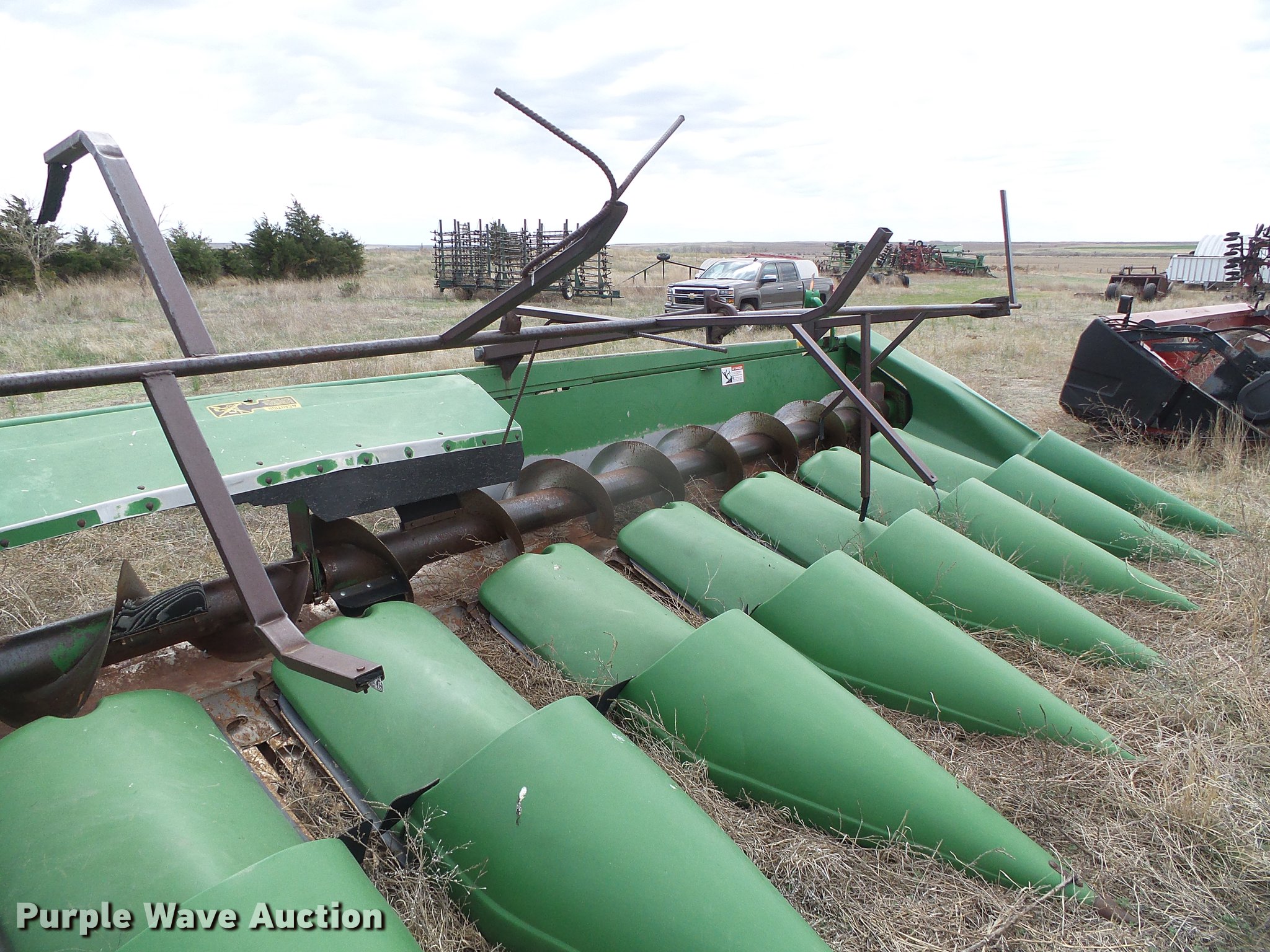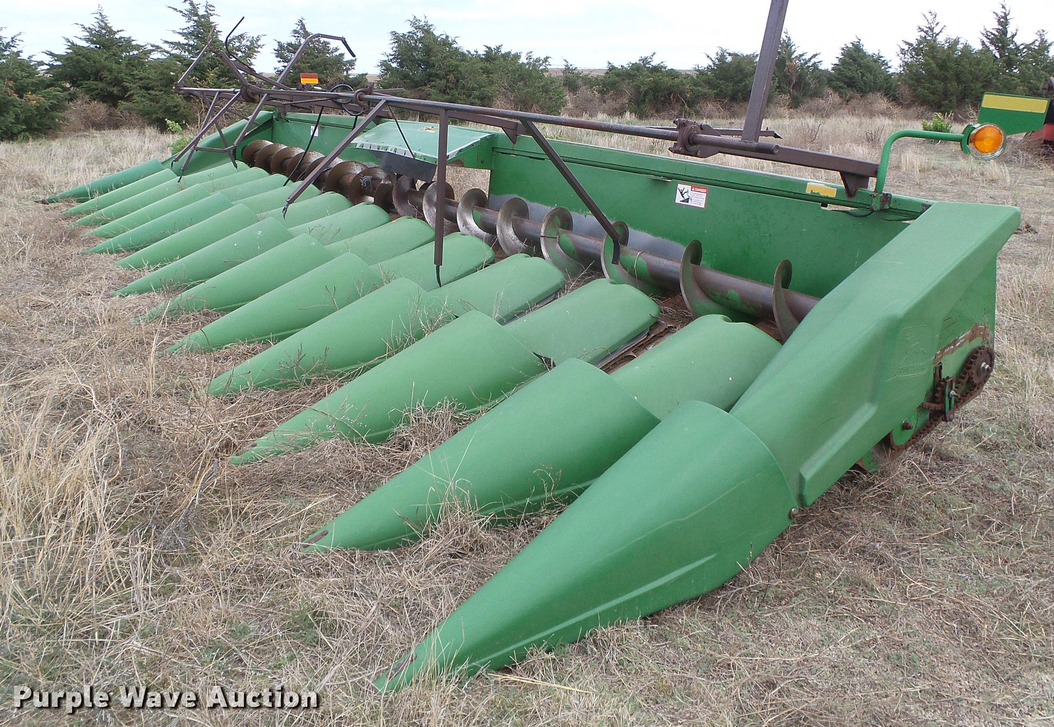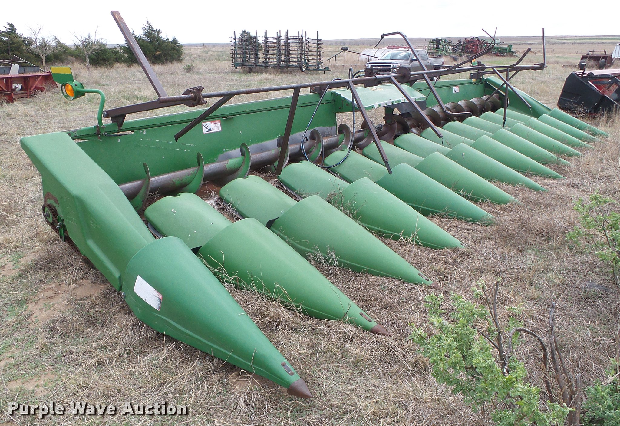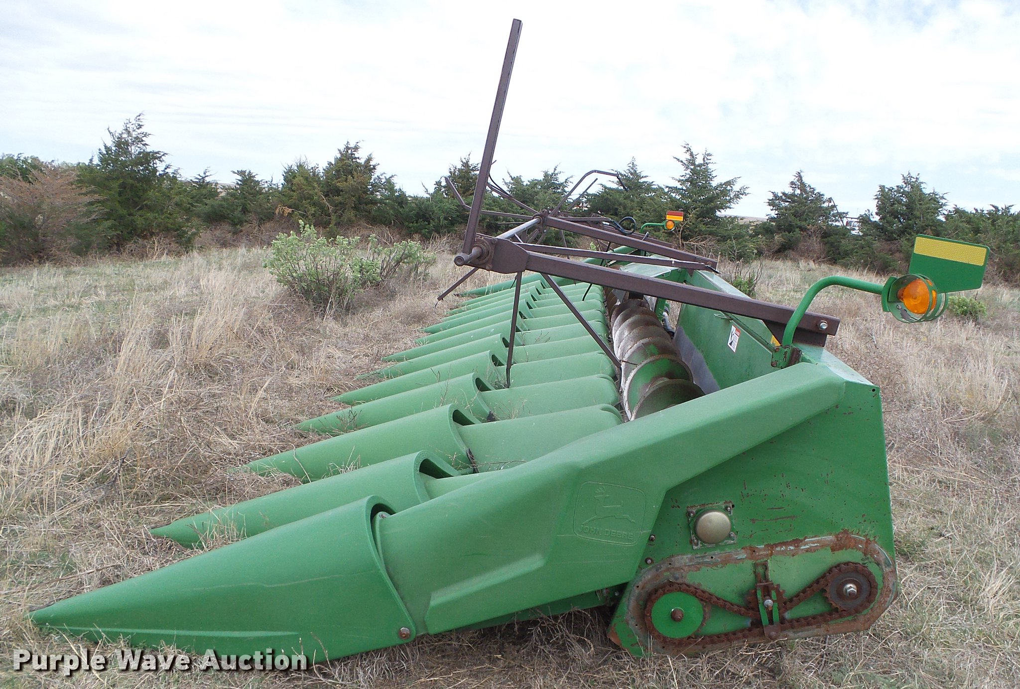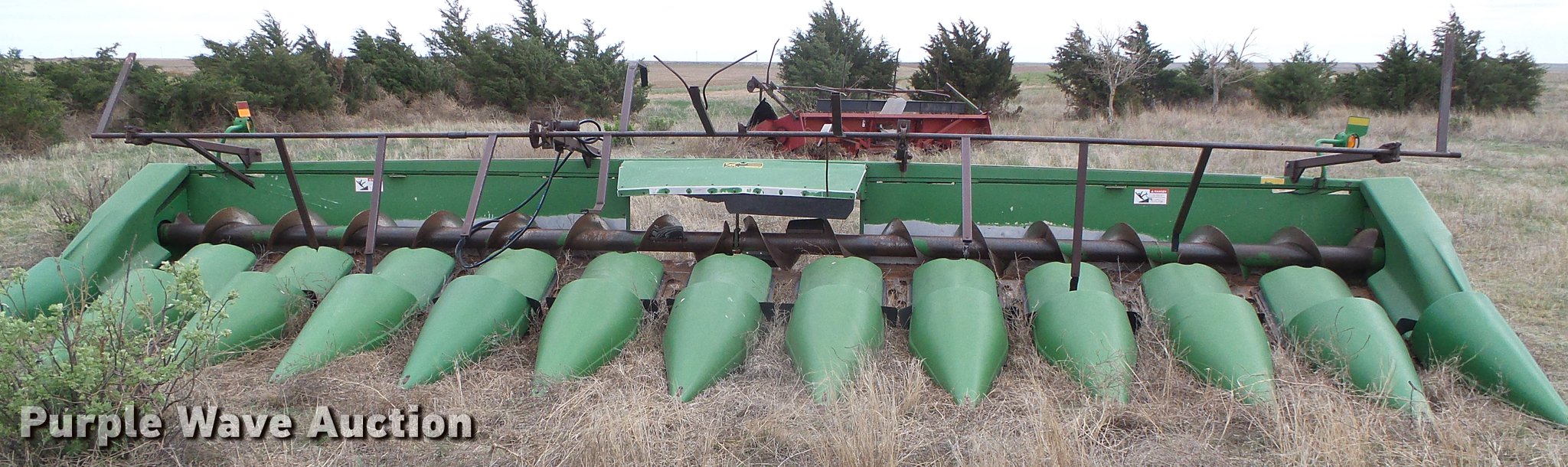 Purple Wave is selling a used Corn or Row Head in Kansas. This item is a John Deere 1243 corn head with the following: 12 rows, 30" row spacing, Hydraulic reel, Poly snouts, Transport lights, Dual drivelines, Serial H01243X650756