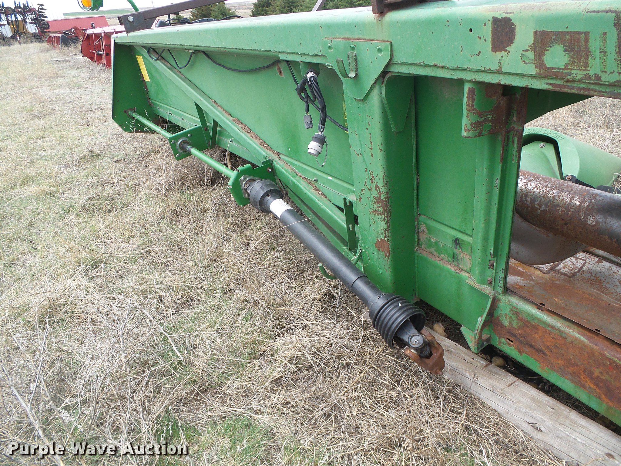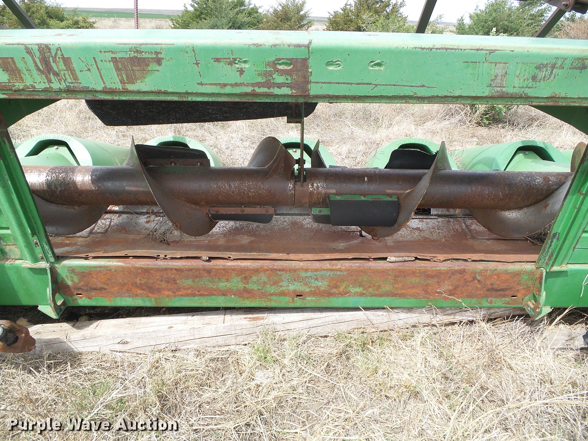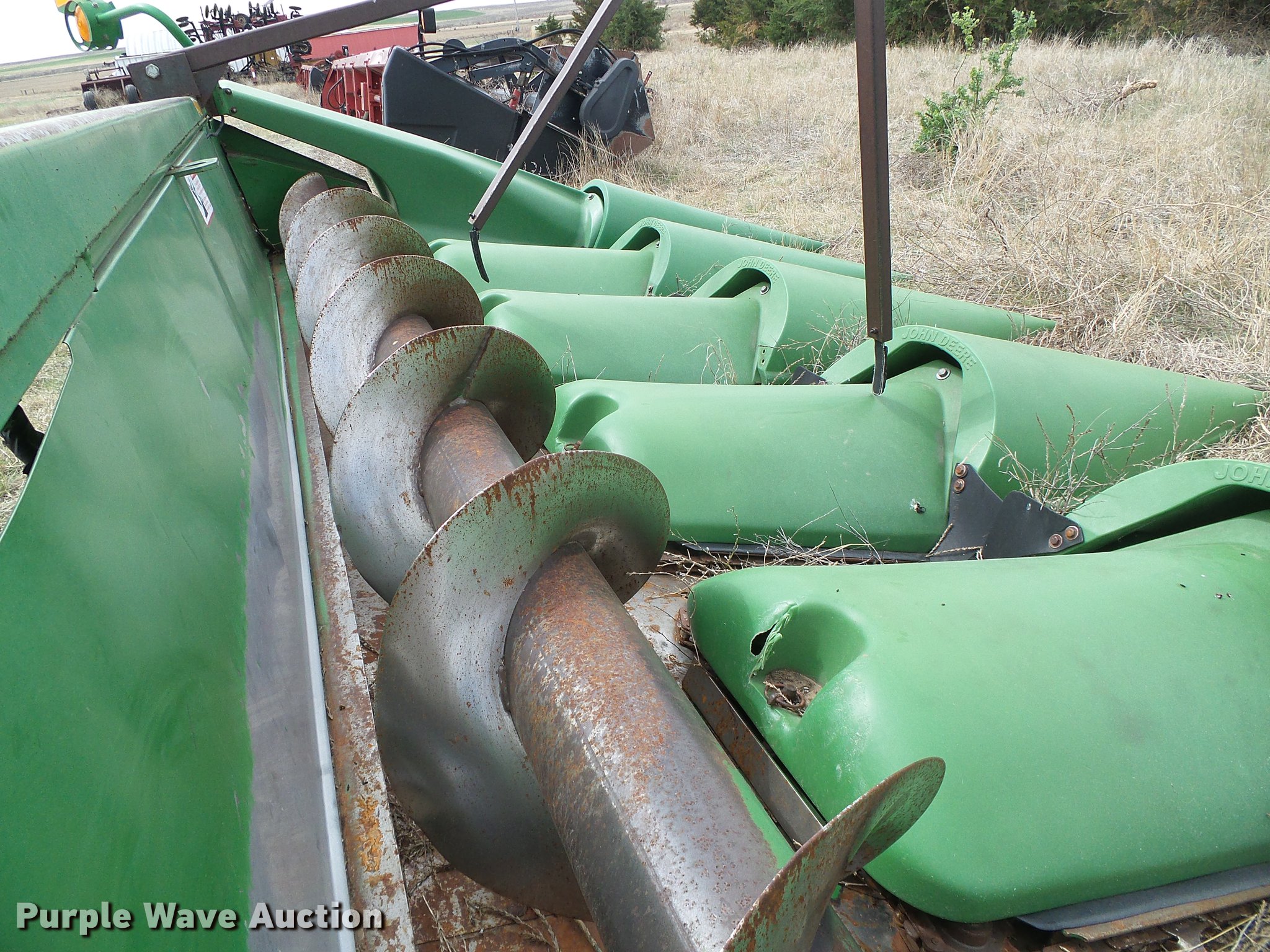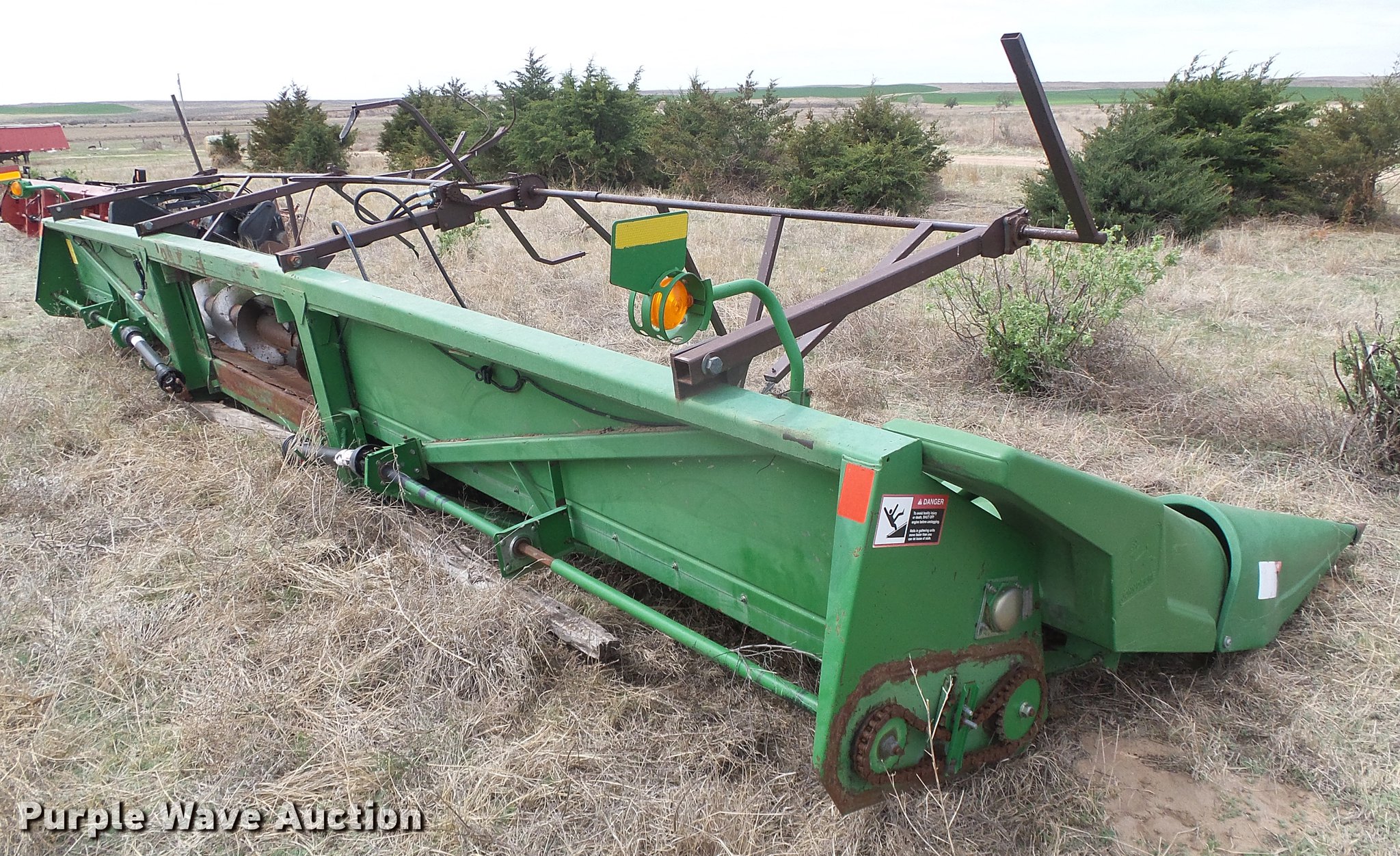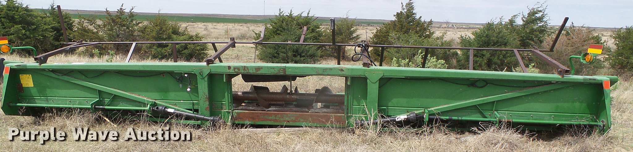 Purple Wave is selling a used Corn or Row Head in Kansas. This item is a John Deere 1243 corn head with the following: 12 rows, 30" row spacing, Hydraulic reel, Poly snouts, Transport lights, Dual drivelines, Serial H01243X650756