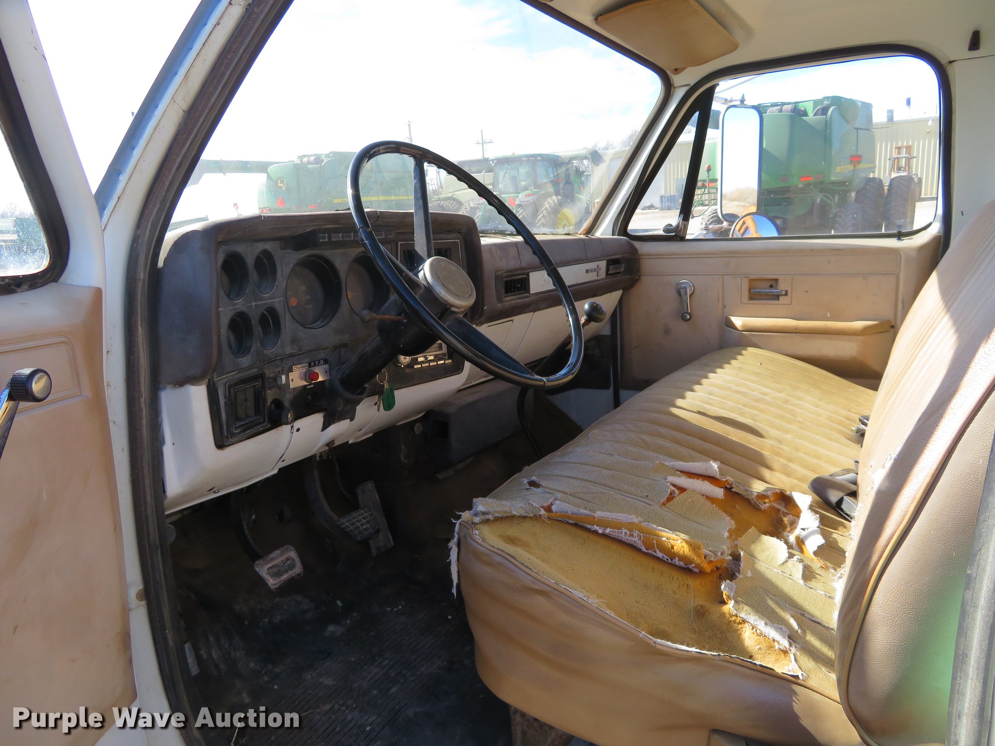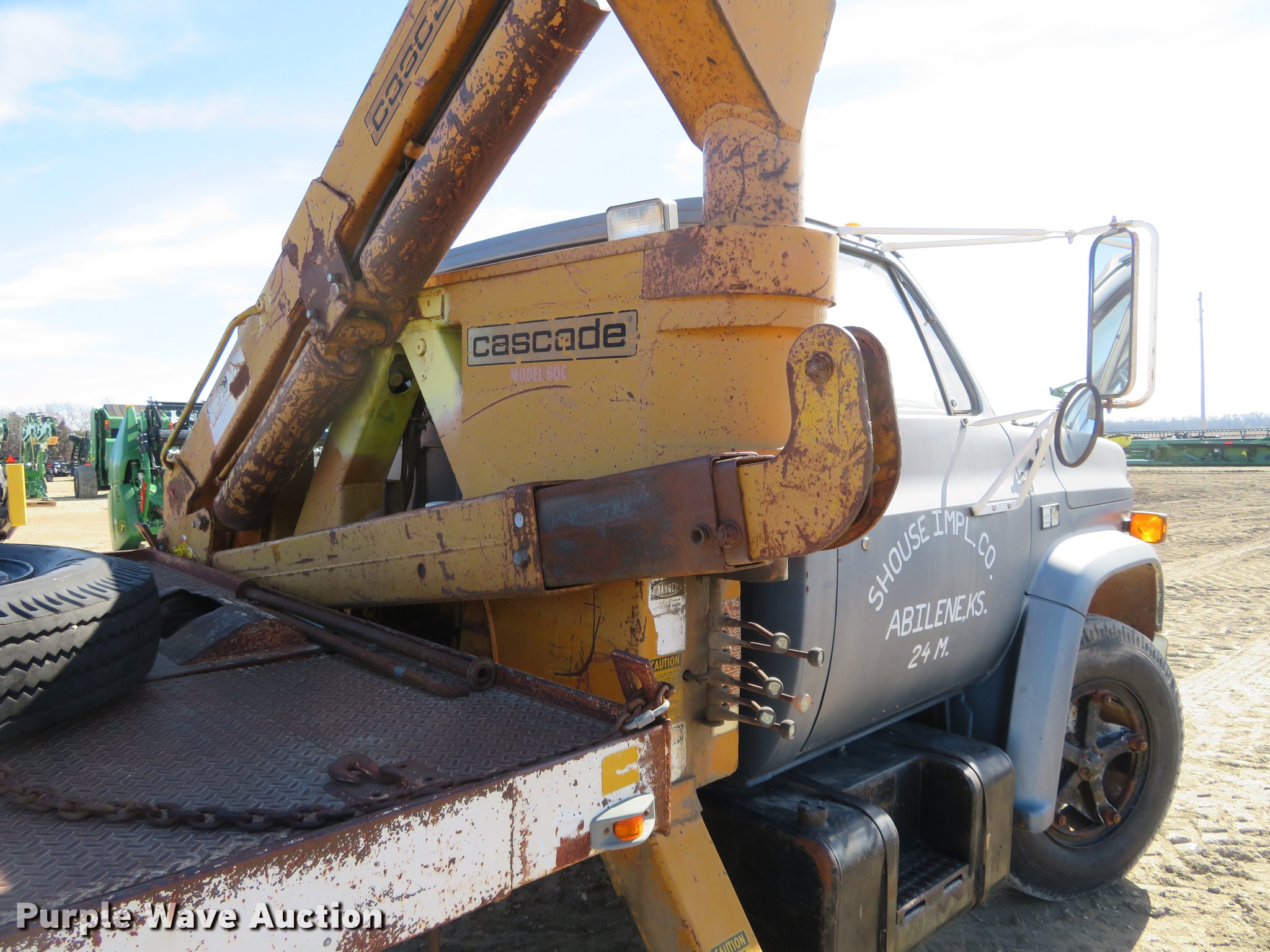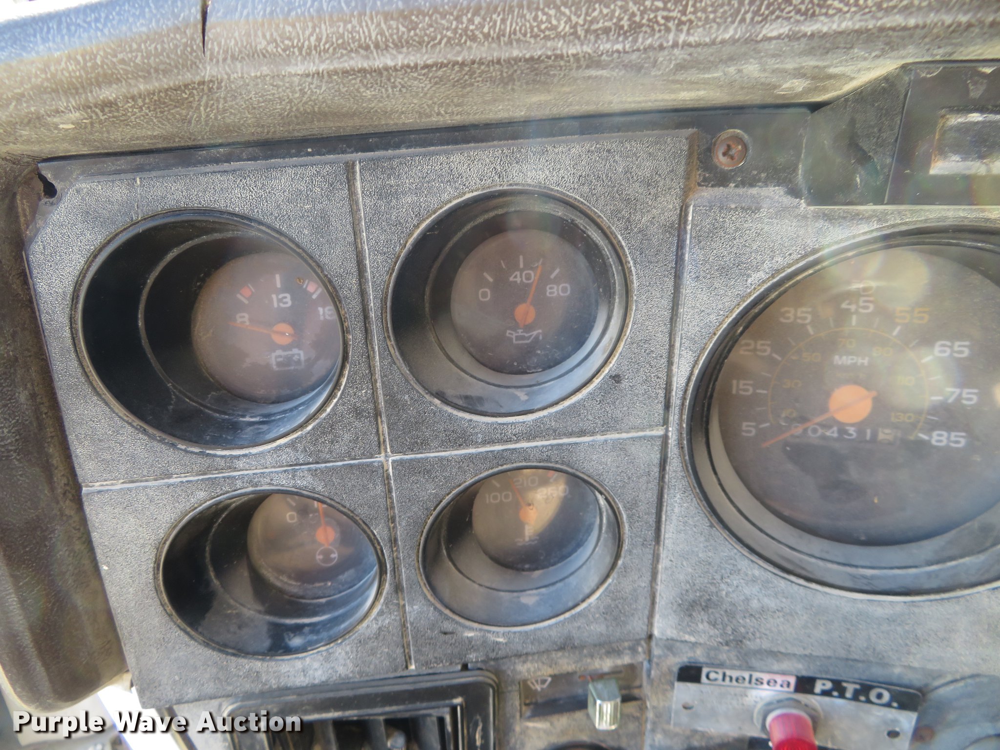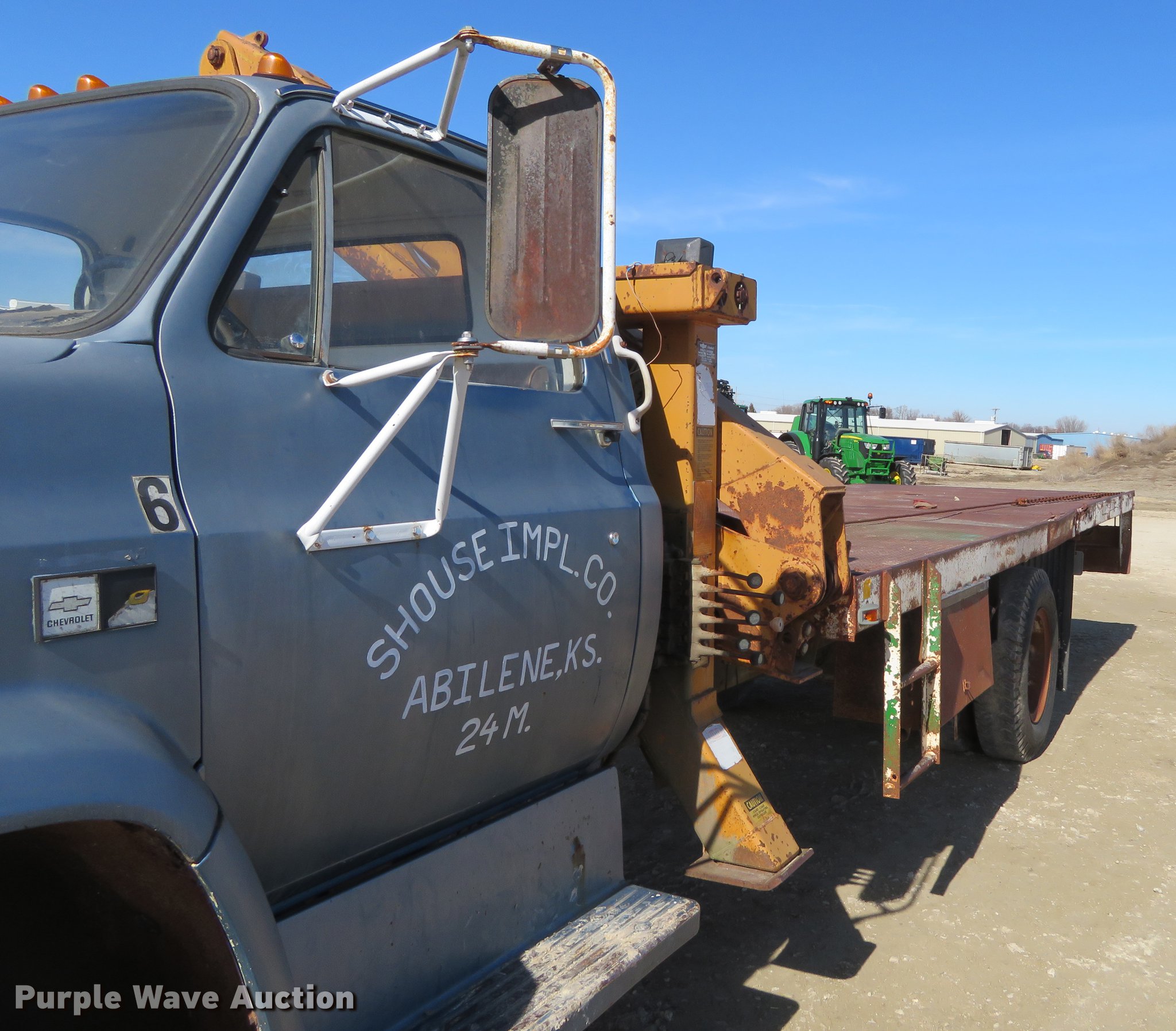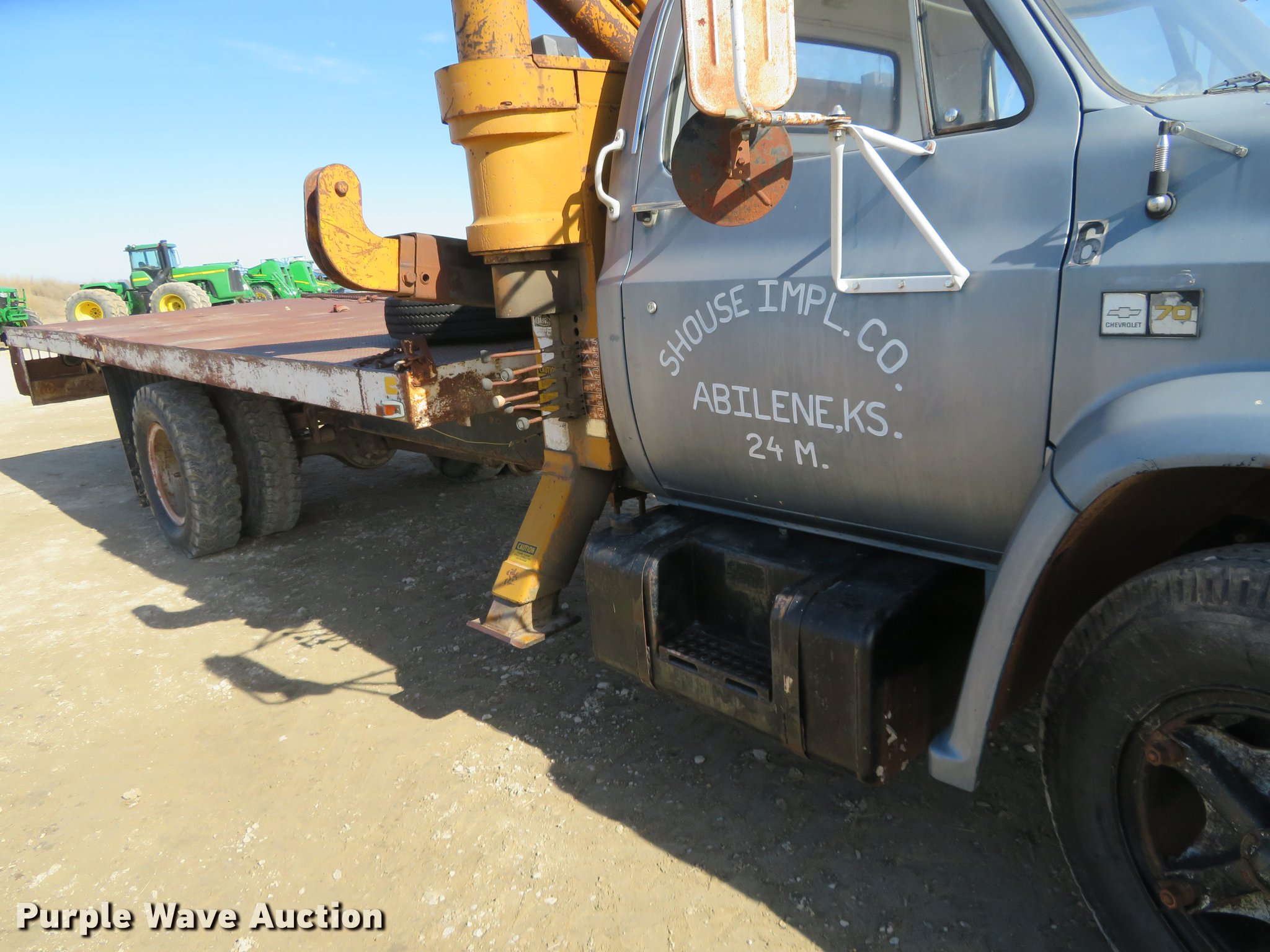 Purple Wave is selling a used Flat Bed Truck in Kansas. This item is a 1985 Chevrolet C70 flatbed truck with crane with the following: 90,431 miles on odometer, 6.0L V8 gas engine, Five speed manual transmission, 20'7"L x 8'W steel flatbed, 24"L dovetail, Chain driven winch, Cascade 60C compact knuckle boom, 9,650 lbs capacity, 9.00-20 tires