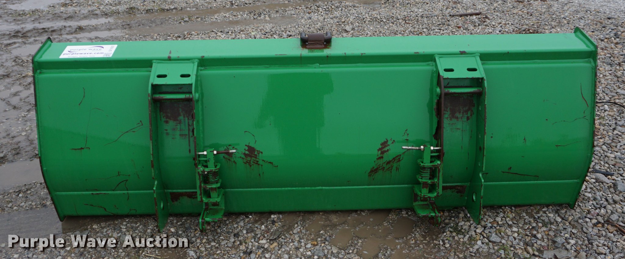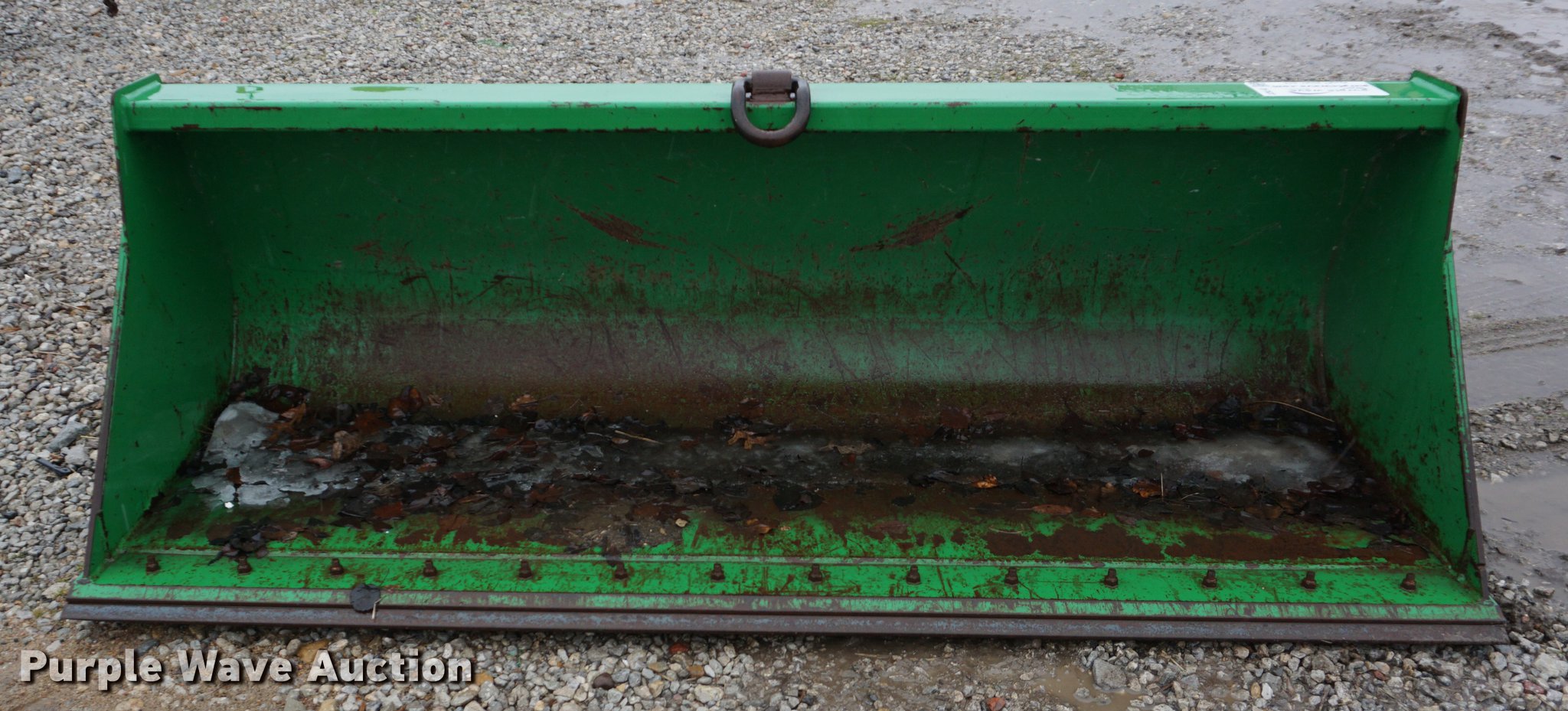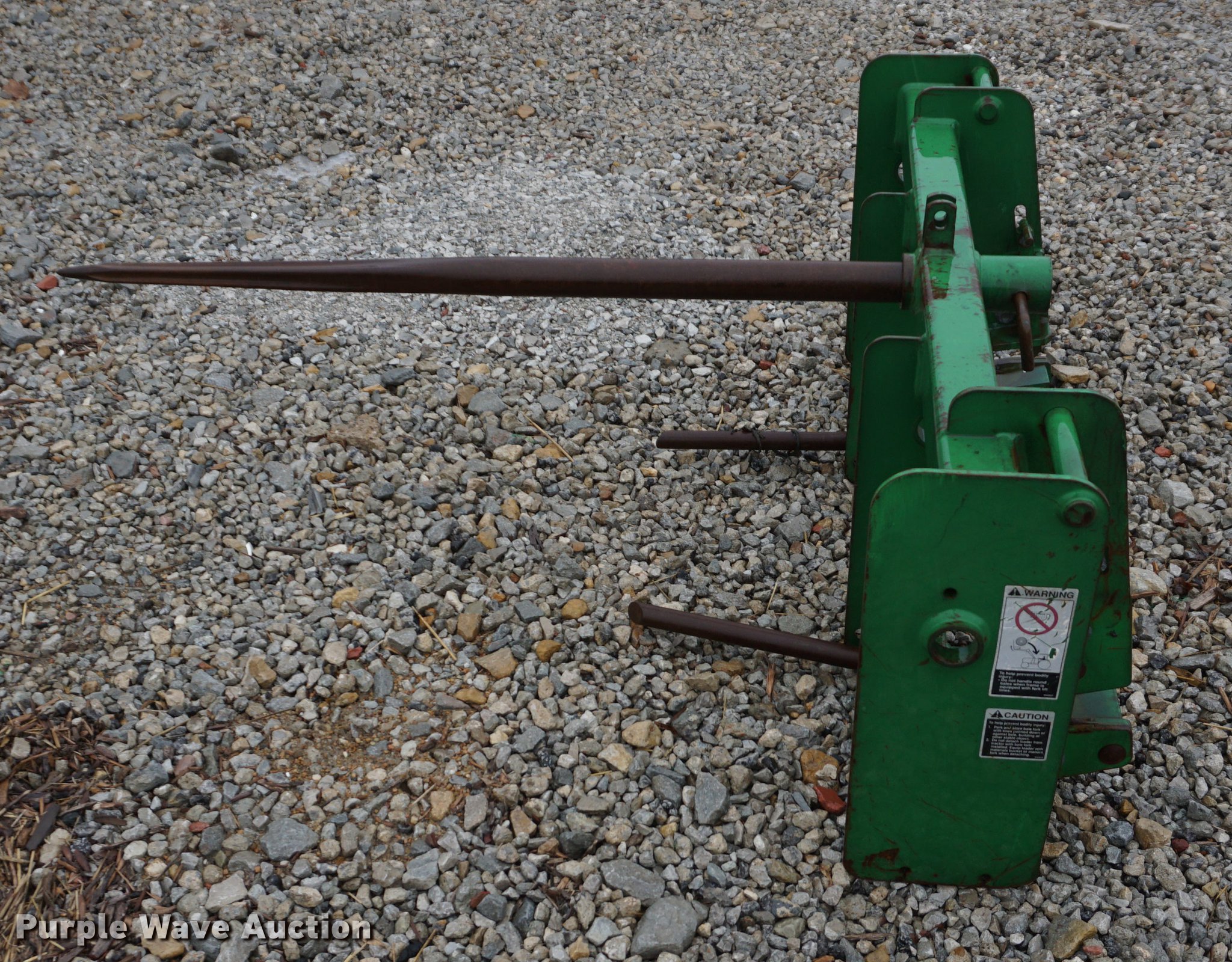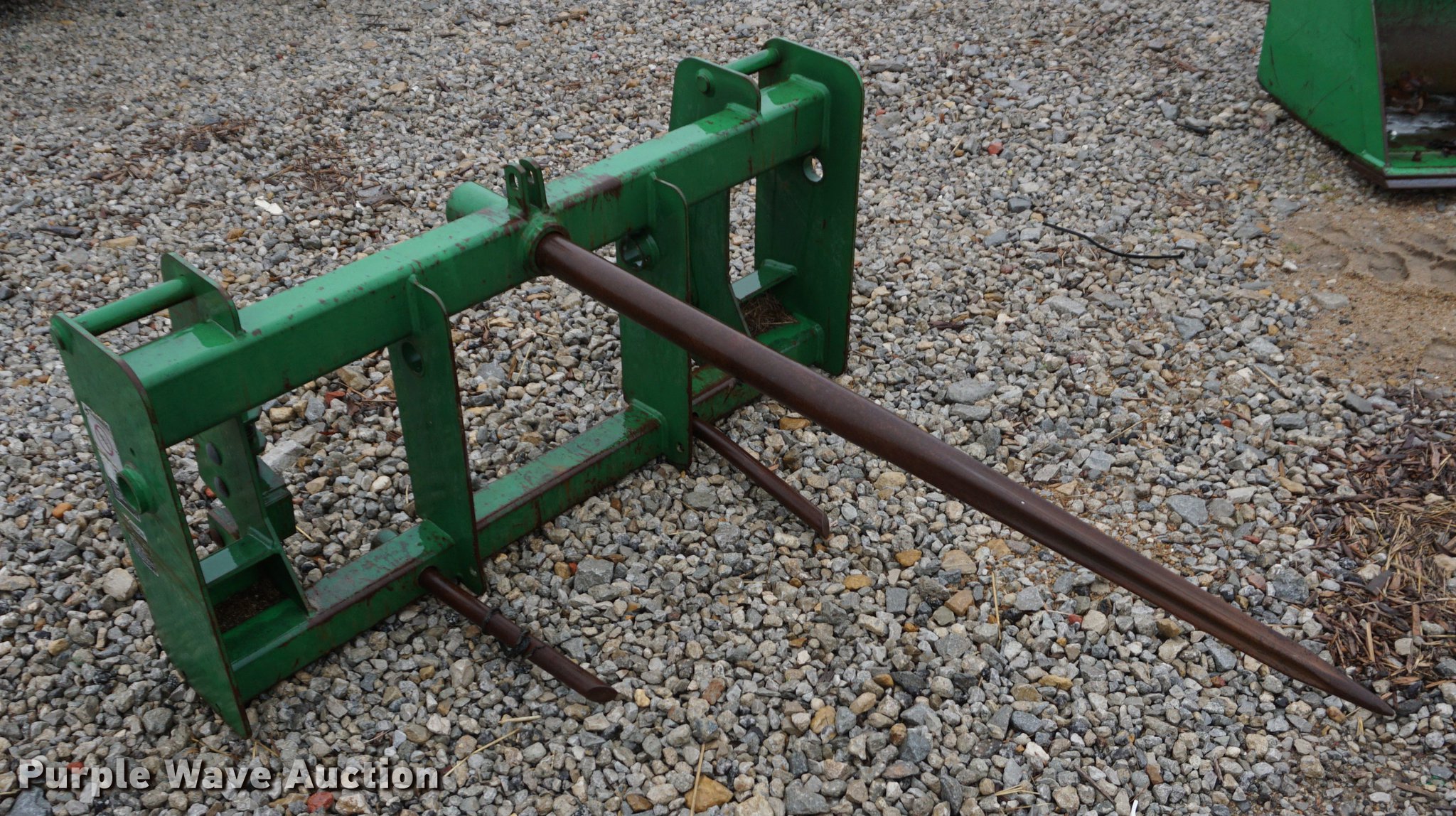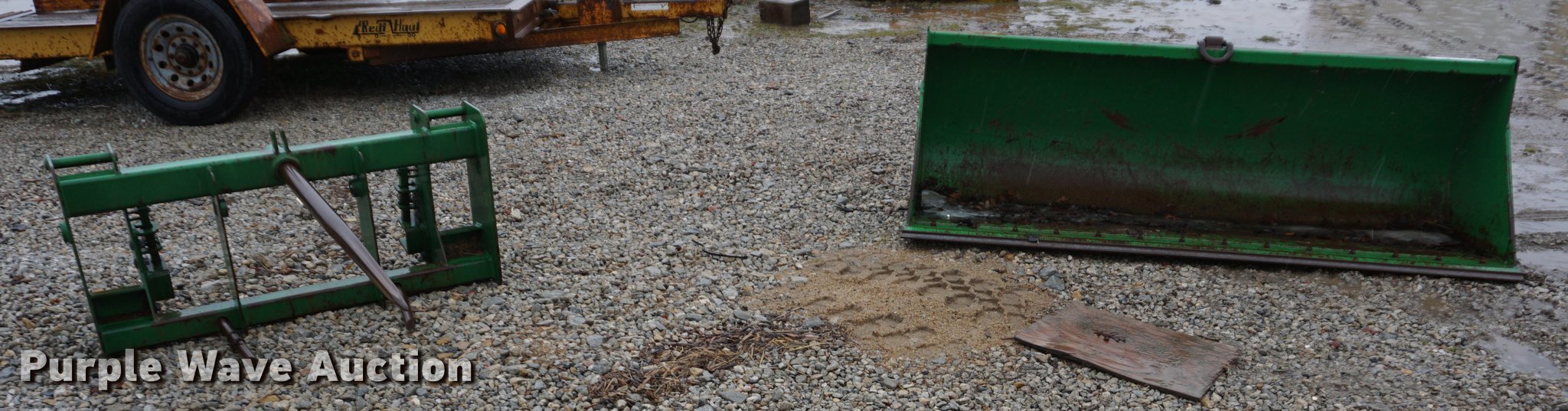 Purple Wave is selling a used Ag Tractor Loader or Attach. in Kansas. This item is a (2) John Deere loader attachments with the following: John Deere loader bucket, 87"W, Bolt-on cutting edge, John Deere bale spear, 48" spear