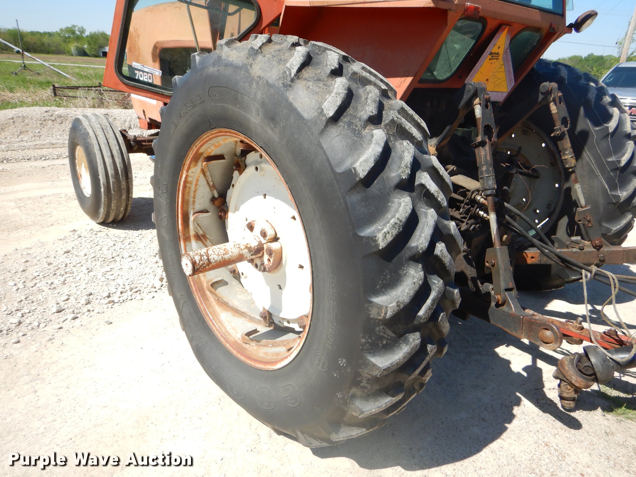 Purple Wave is selling a used Tractor in Kansas. This item is a 1978 Allis Chalmers 7020 tractor with the following: 6,589 hours on meter, Six cylinder diesel engine, Power director powershift transmission, 16F-4R gears, AC and heat, AM/FM, Three point, 1000 PTO, (3) rear hydraulic remote sets, (9) suitcase weights, 108" wheelbase, 11.00-16 front tires, 18.4-38 rear tires, Non-operational set of rear hydraulic remotes, Non-operational AC, Low tire, Serial 12534