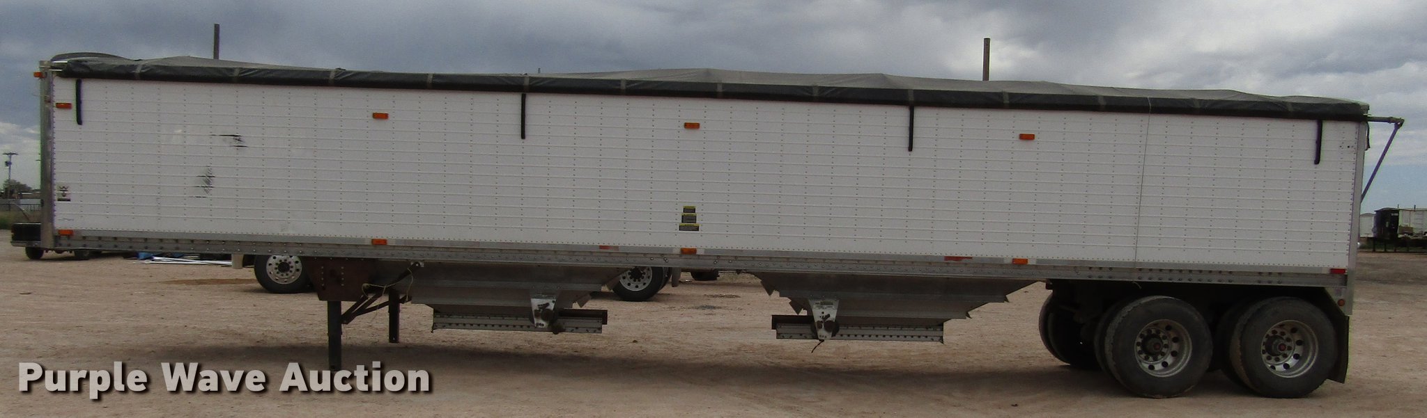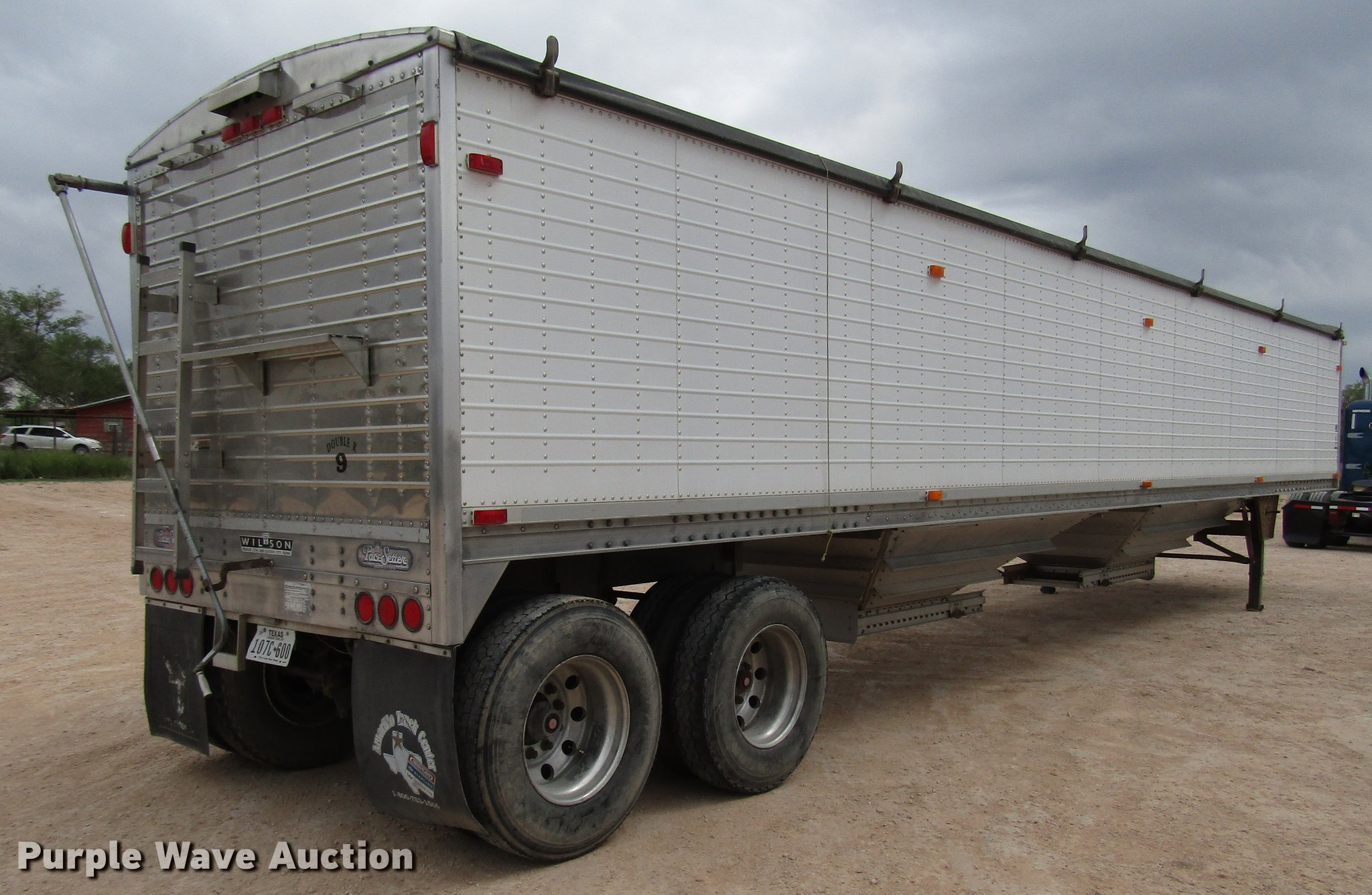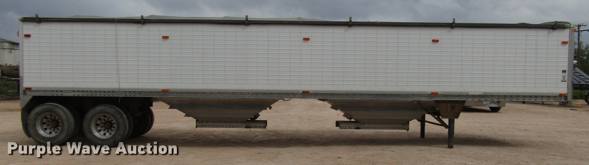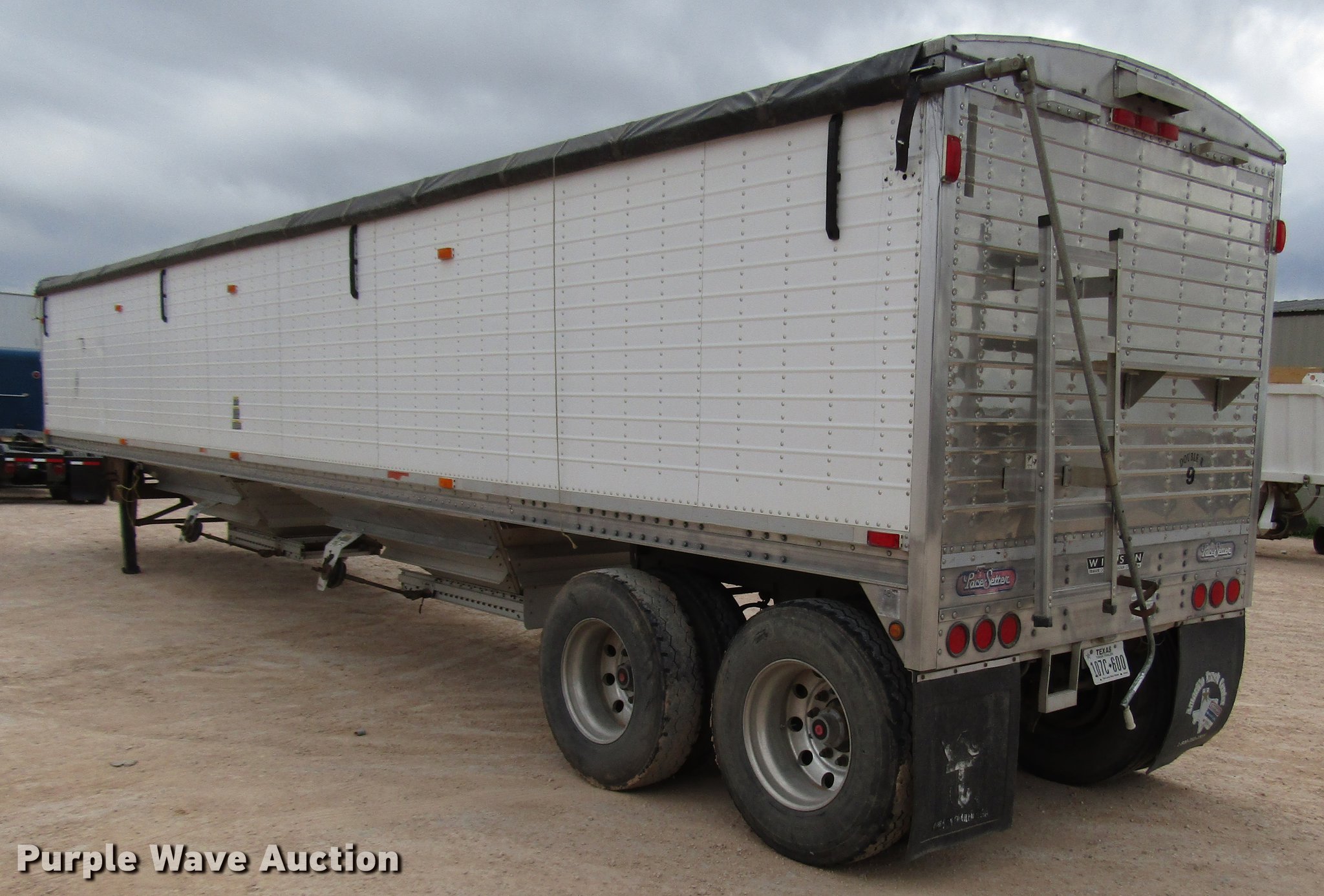 Purple Wave is selling a used Grain or Commodity Trailer in Texas. This item is a 2005 Wilson Pace Setter double hopper bottom grain trailer with the following: 42'L x 92"W overall, 68" side height, Manual trap gates, Front and rear ladders, Front and rear platforms, Roll tarp, Aluminum construction, Dual leg landing gear, Spring suspension, Air brakes, Tandem axle, Aluminum wheels, 11R22.5 tires, Tarp damaged