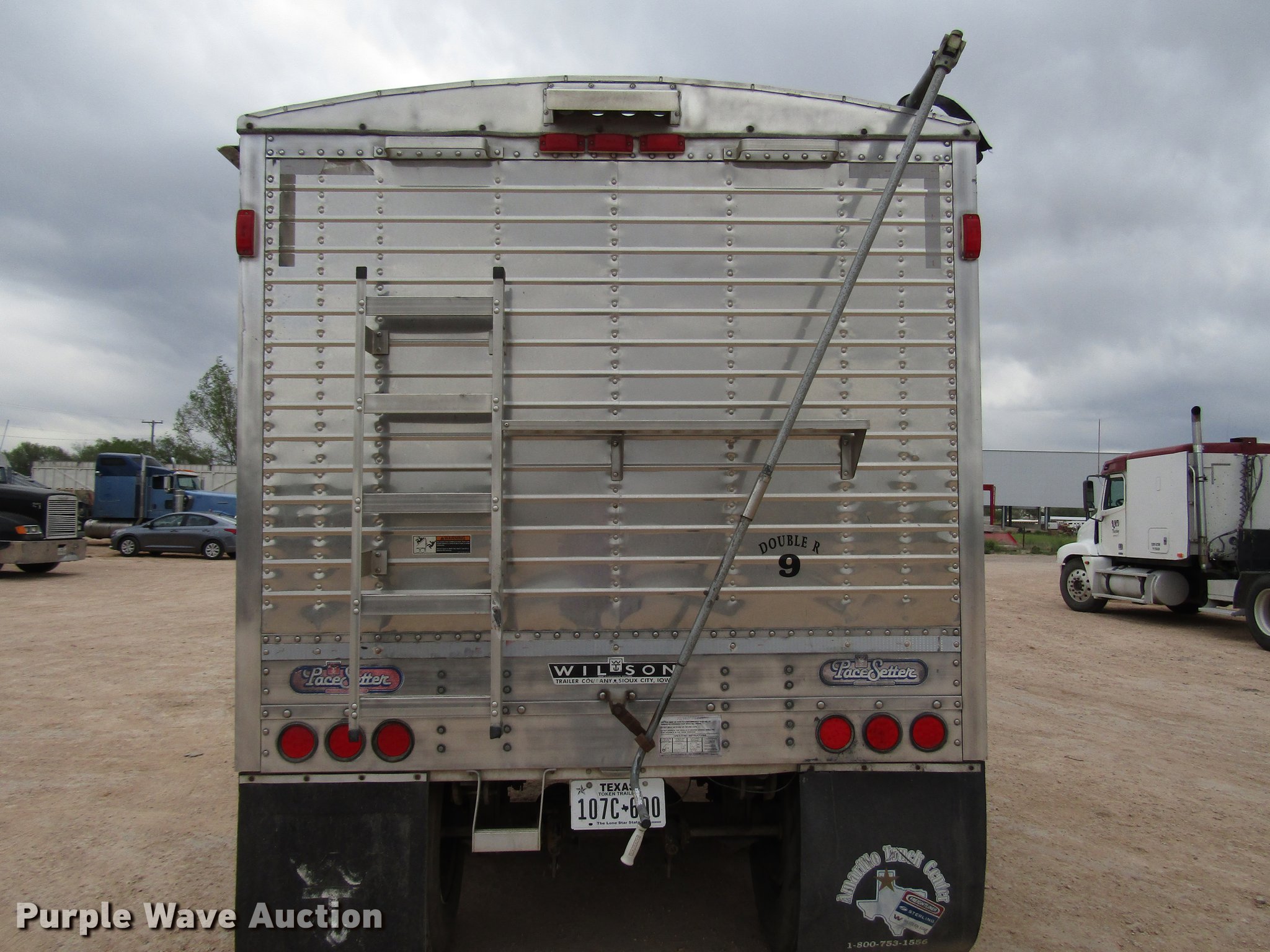 2005 Wilson Pace Setter double hopper bottom grain trailer. 42'L x 92"W overall, 68" side height, Manual trap gates, Front and rear ladders, Front and rear platforms, Roll tarp, Aluminum construction, Dual leg landing gear, Spring suspension, Air brakes, Tandem axle, Aluminum wheels, 11R22.5 tires, Tarp damaged. Texas title. Title has a lien that will be released following the close of the auction. Title distribution may be delayed up to 30 days from verification of funds. 1W1MBF1W45A240080. Double R Trucking. 207 Grand Ave. Hereford, TX 79045