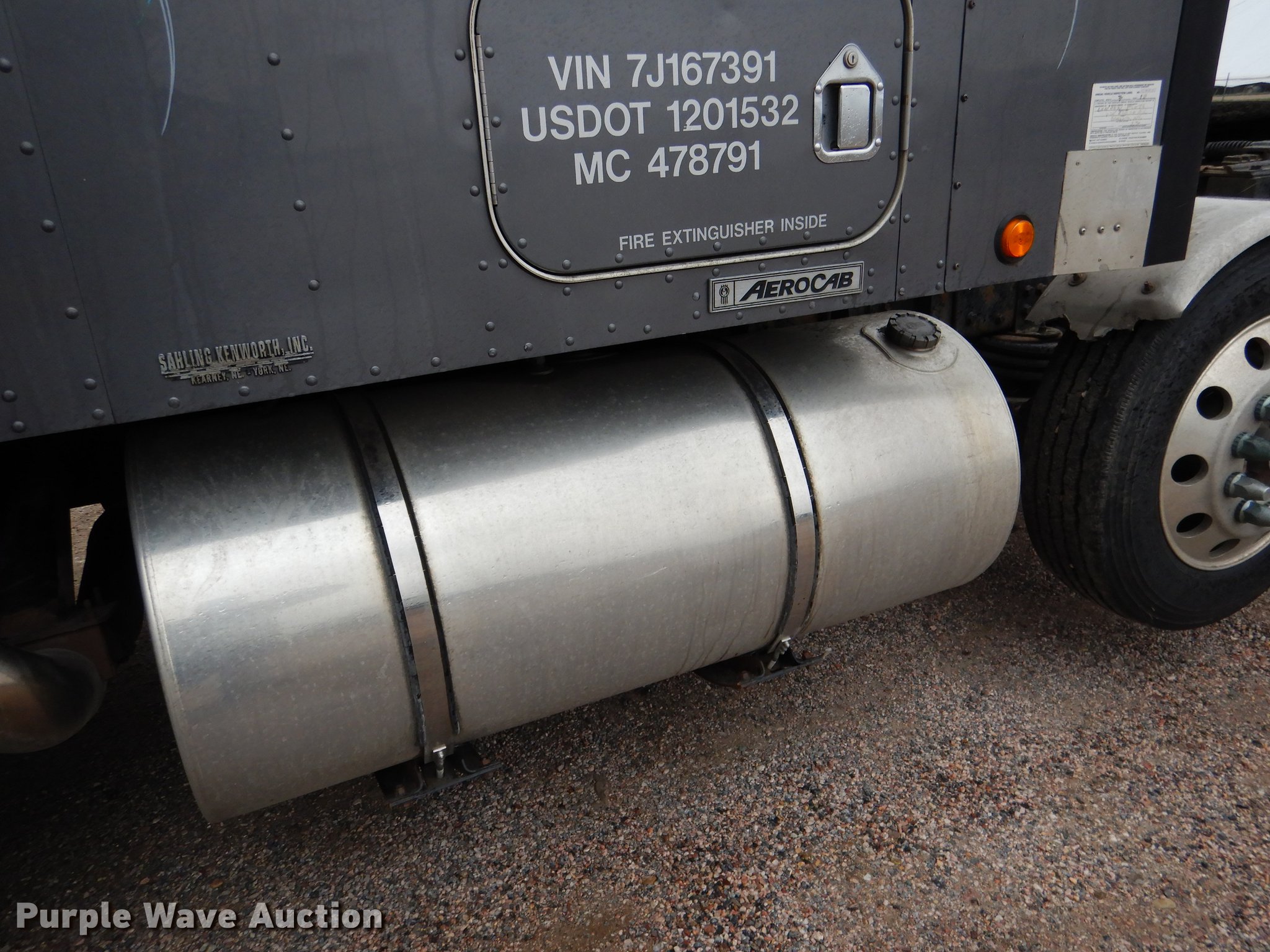 Purple Wave is selling a used Truck Tractor in Nebraska. This item is a 2007 Kenworth W900 semi truck with the following: 1,104,991 miles on odometer, Cummins ISX 14.9L L6 diesel engine, 530 HP, Serial 79162821, Eaton Fuller 18 speed manual transmission, Triple axle, Steerable pusher lift axle, Inter-axle differential lock, AC and heat, AM/FM/CD, Power locks, Heated mirrors, Air suspension seat, Sleeper, 60"L, Single bed, Storage cabinets, Aluminum deck plate, Air operated fifth wheel plate, Aluminum headache rack, Dual fuel tanks, Air suspension, Air brakes, 280" wheelbase, 11R24.5 tires, 225/70R22.5 pusher axle tires, FAWR 12,000 lbs, IAWR 18,000 lbs, RAWR 18,000 lbs