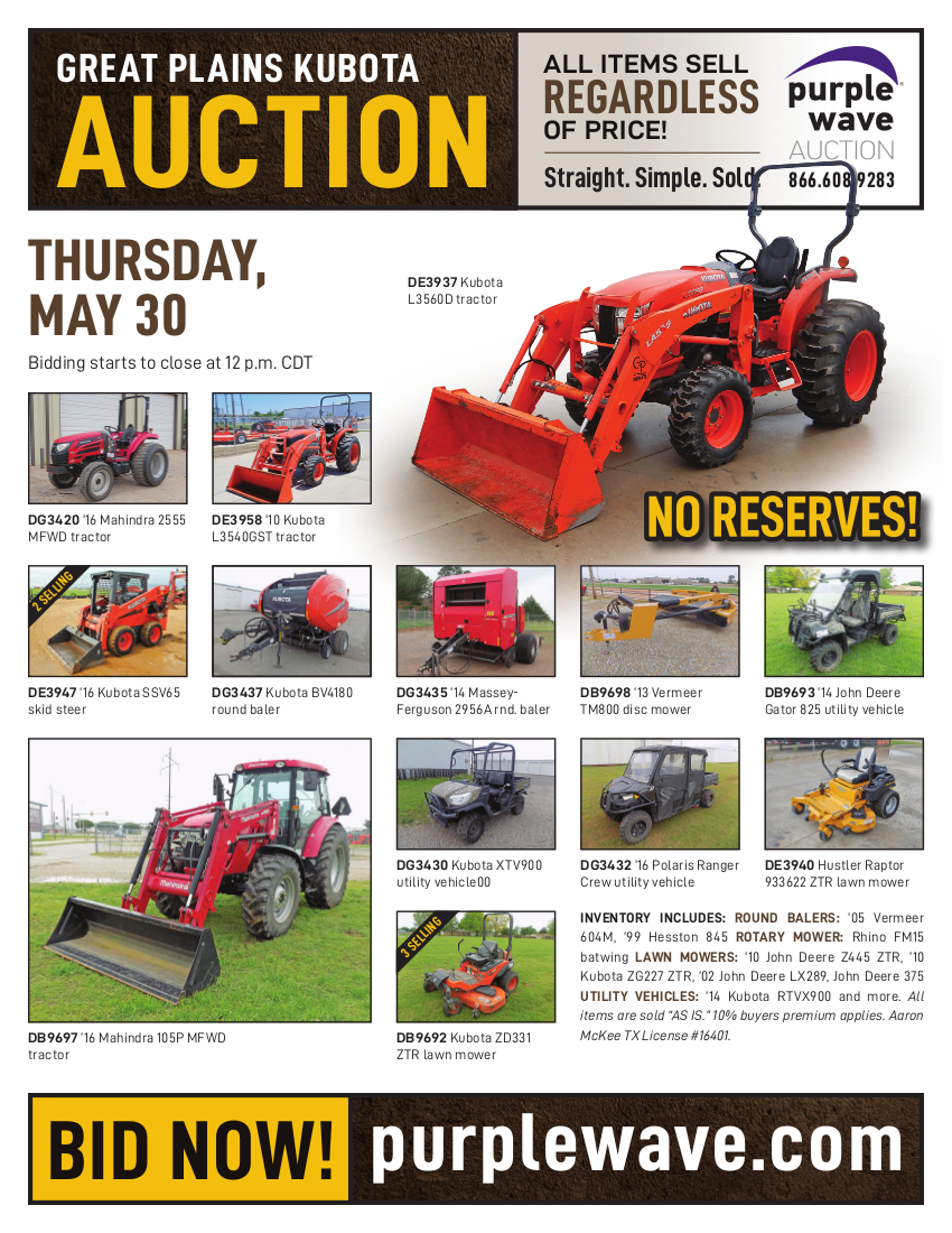 SOLD! June 5 Great Plains Kubota Equipment Auction