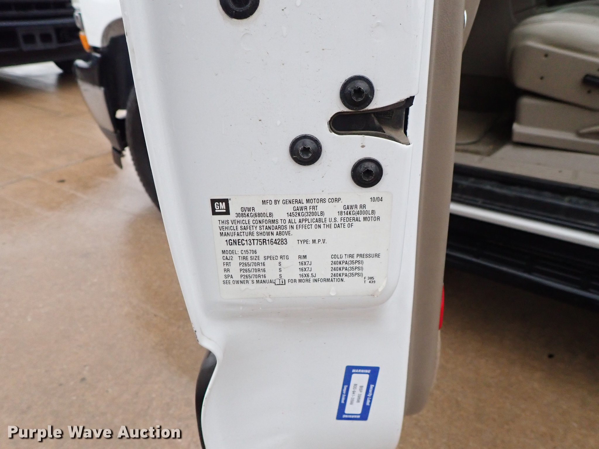 Purple Wave is selling a used Passenger Vehicle in Kansas. This item is a 2005 Chevrolet Tahoe SUV with the following: 211,963 miles on odometer, 5.3L V8 OHV 16V gas engine, Automatic transmission, AC and heat, Cruise, Power windows, locks, and seat, 265/70R16 tires