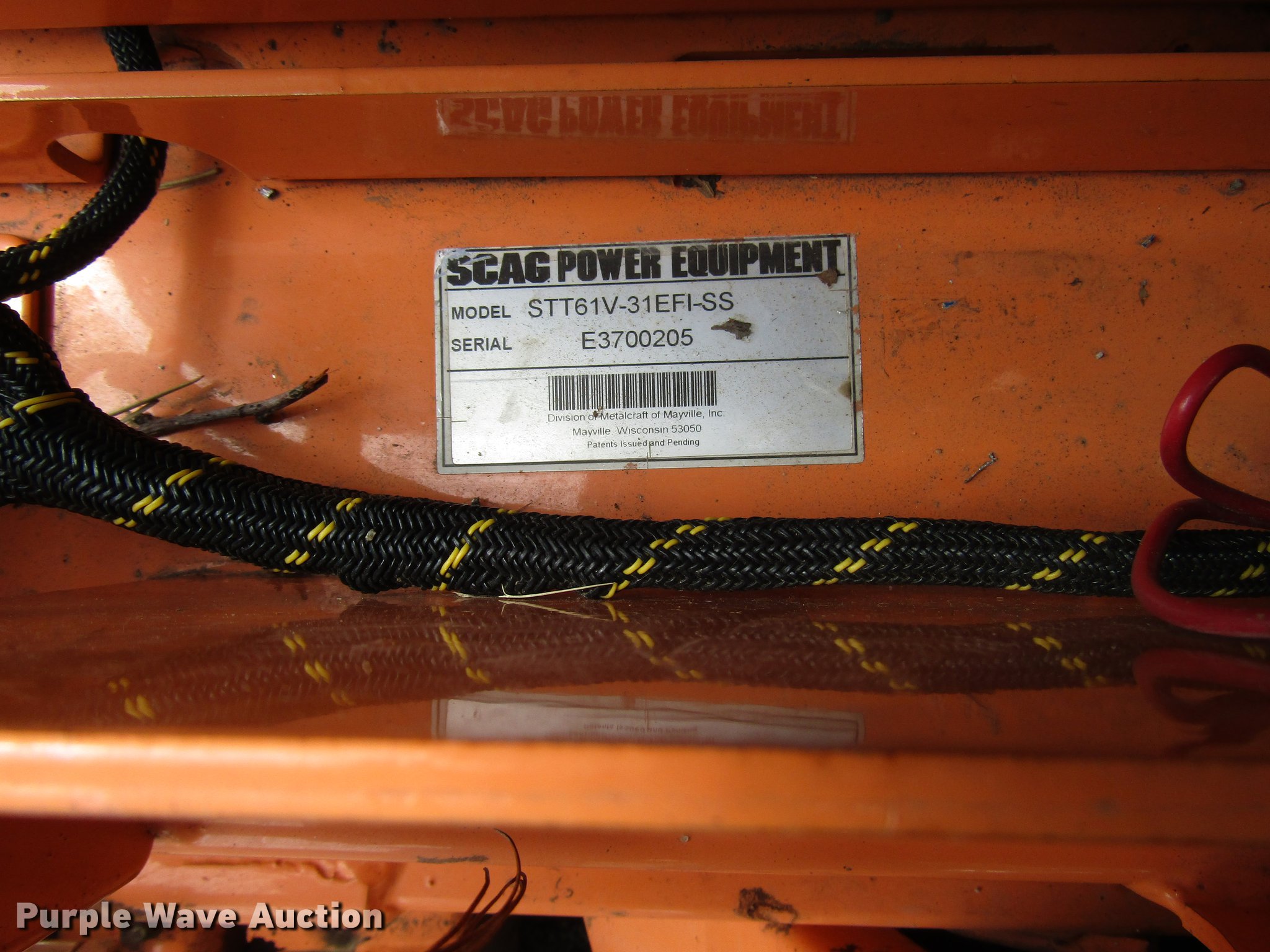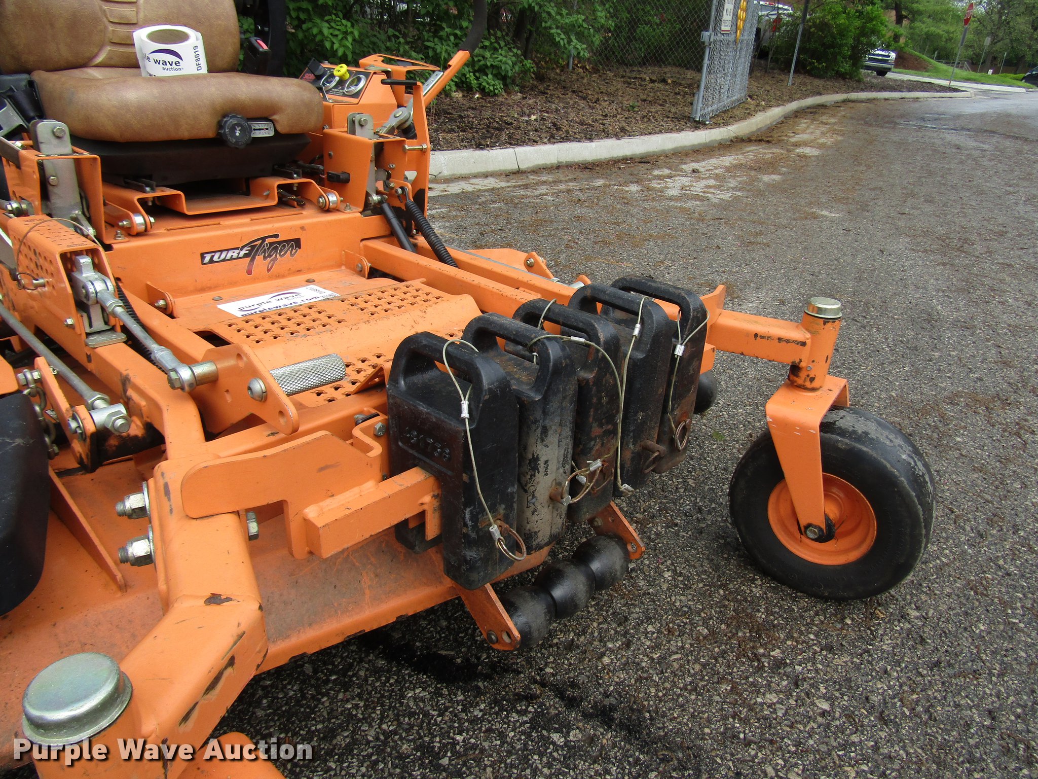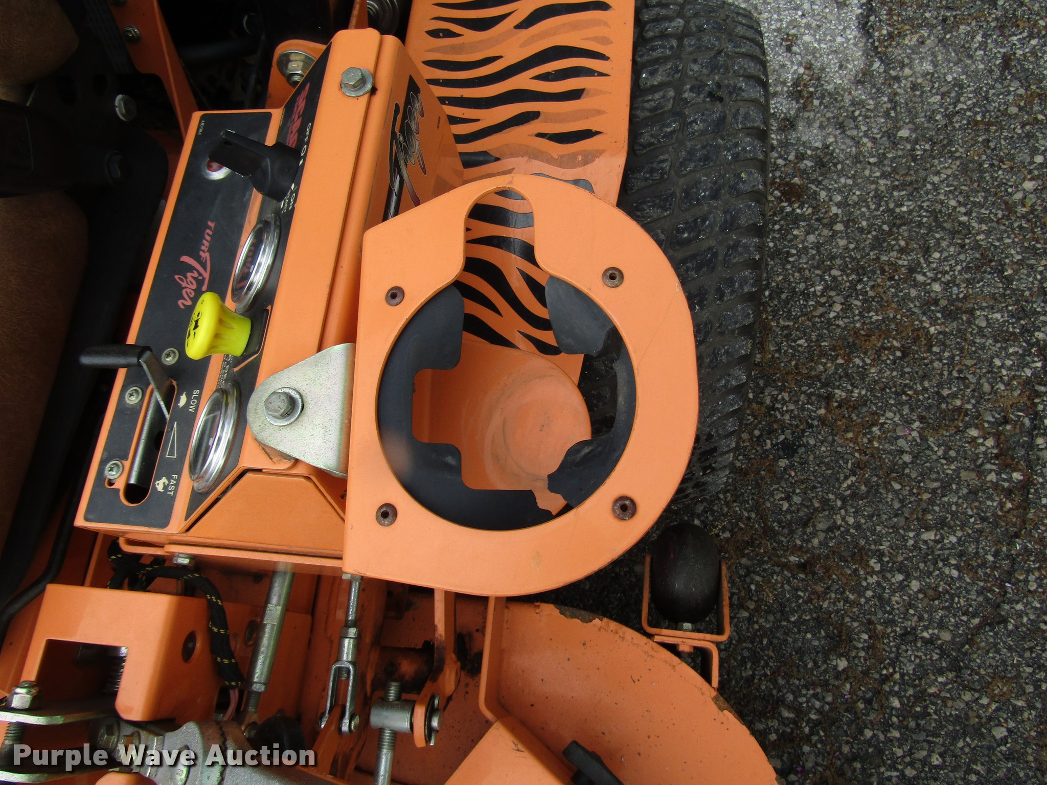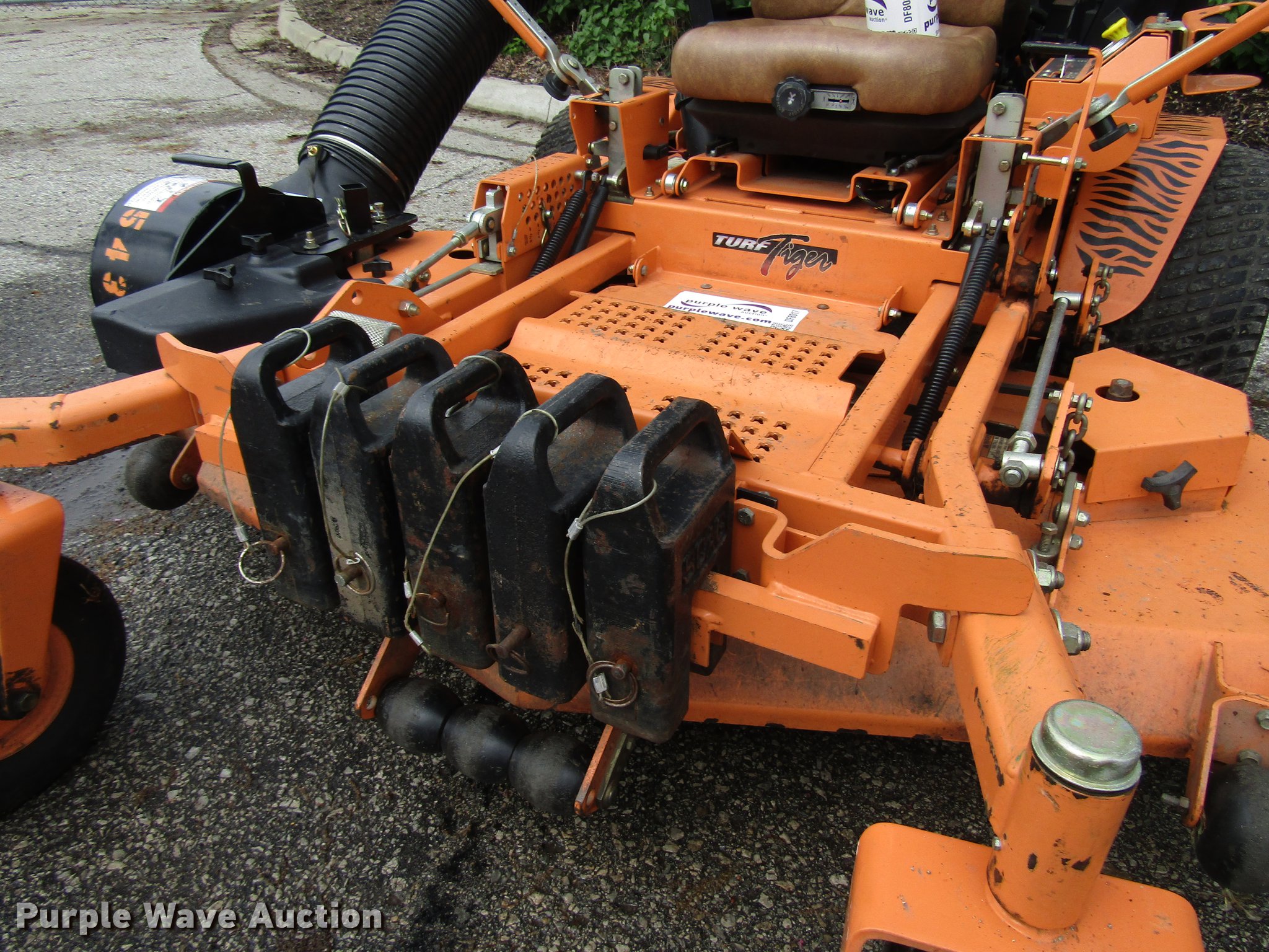 Purple Wave is selling a used Commercial Turf Mower in Kansas. This item is a Scag Turf Tiger ZTR lawn mower with the following: 38 hours on meter, 889 total hours, Hours meter has been replaced, 60" cut, Kohler two cylinder gas engine, 31 HP, Hydrostatic transmission, OROPS, Grass bagger, Flip up front deck, Counterweights, 13x6.50-14.50 front tires, 24x12.00-12 rear tires, Serial E3700205