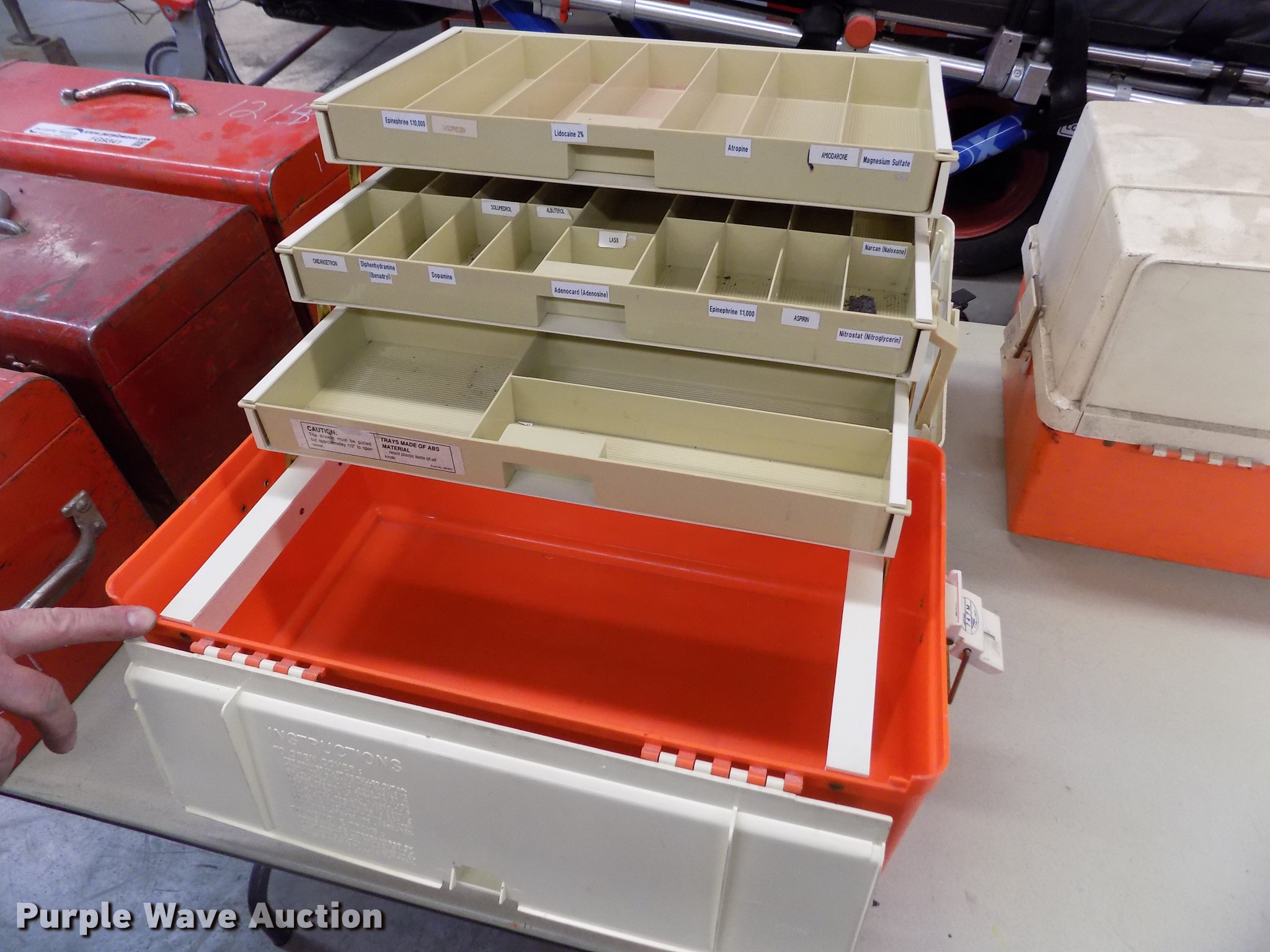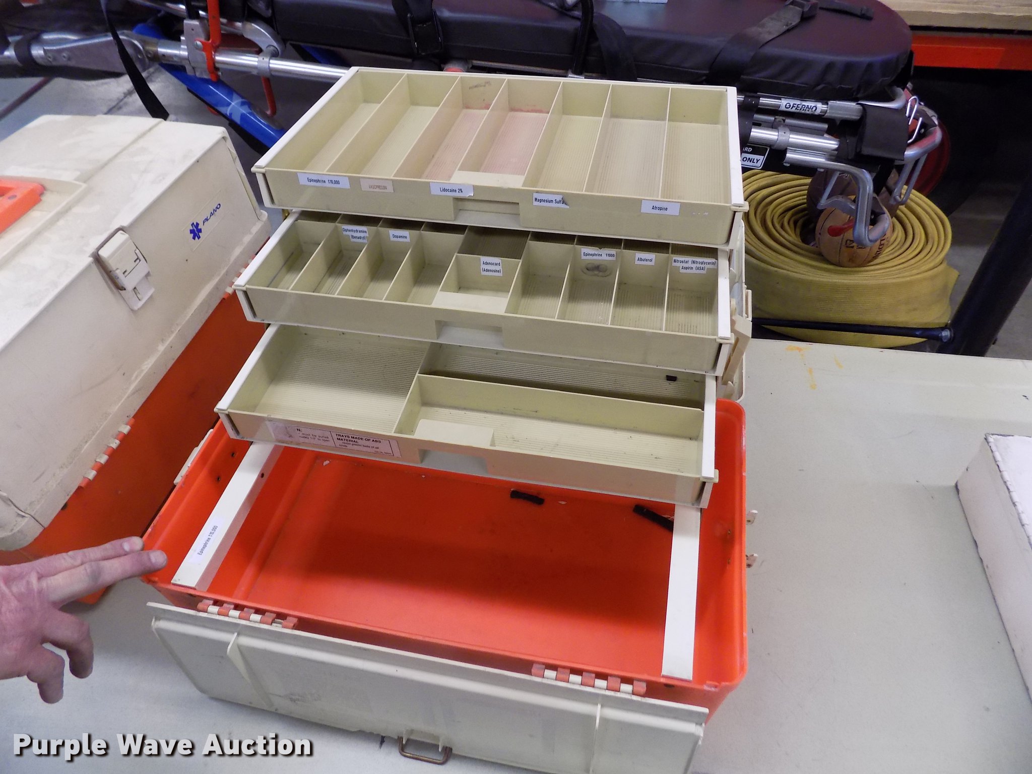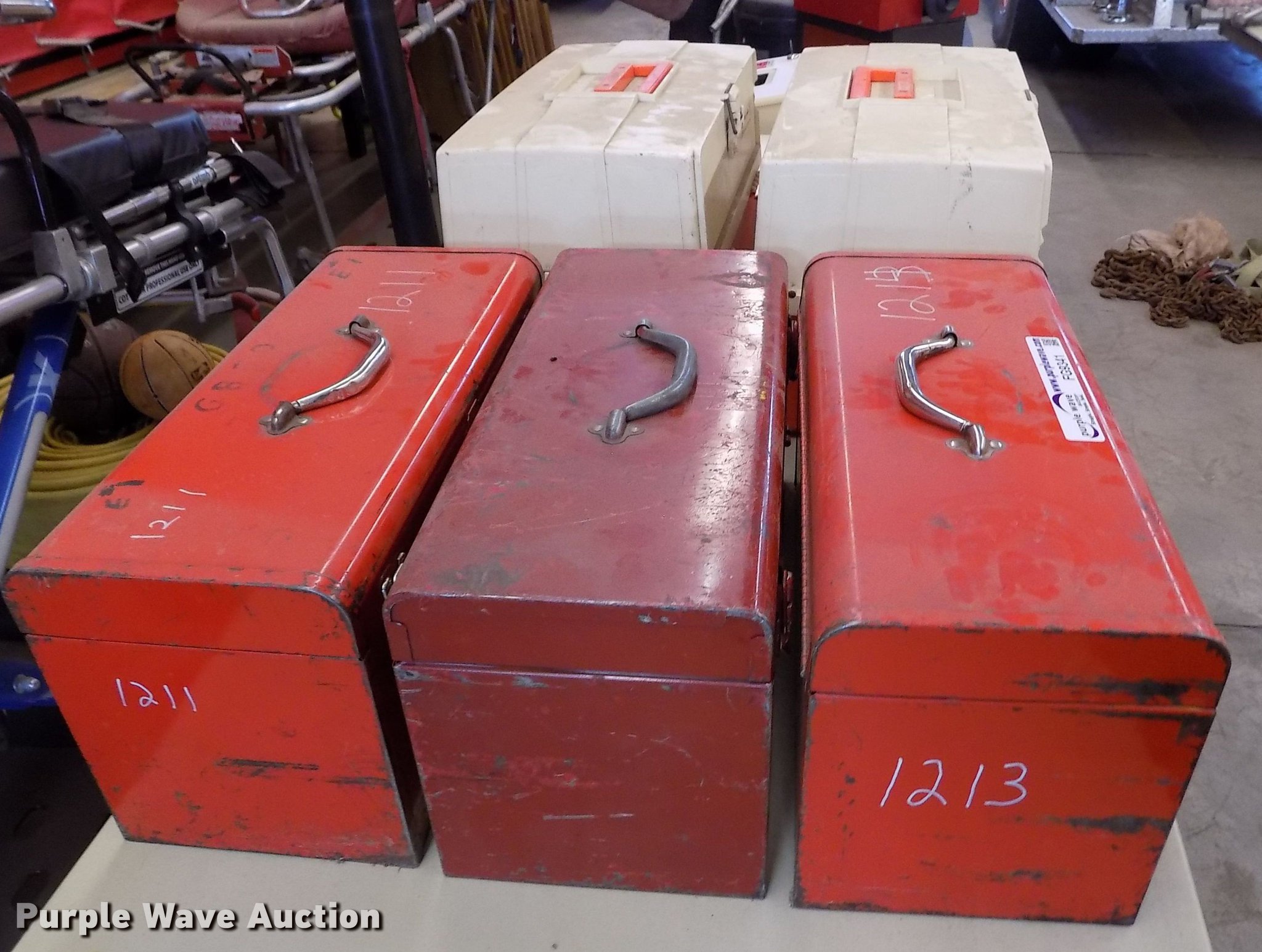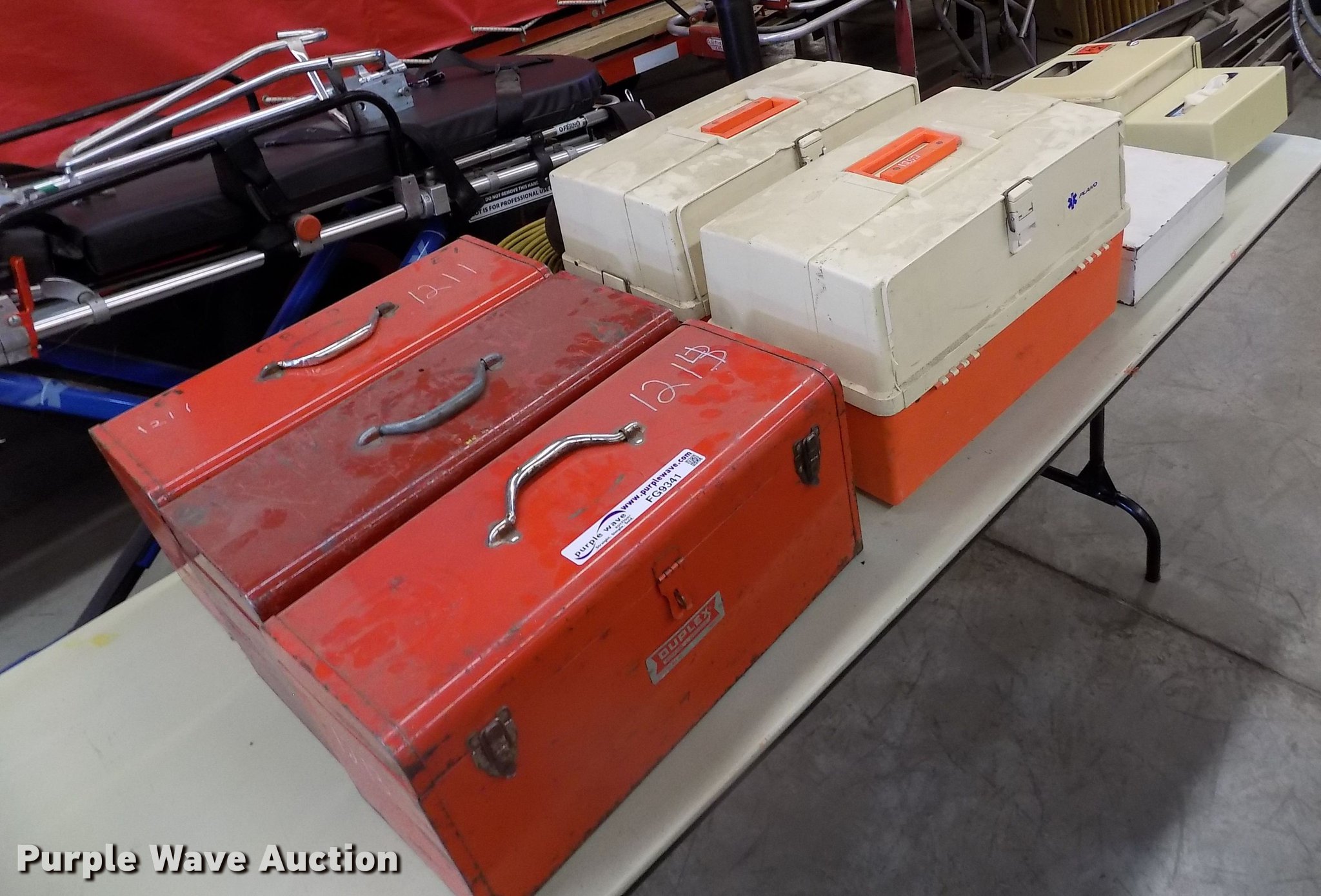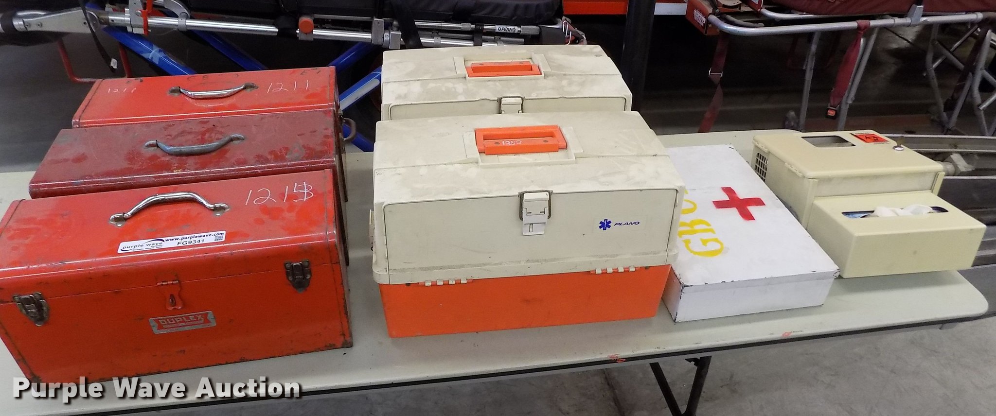 Purple Wave is selling a used Tools in Kansas. This item is a Tools with the following: (3) metal tools, (2) plastic medics toolboxes, First aid kit, Sharps disposal unit