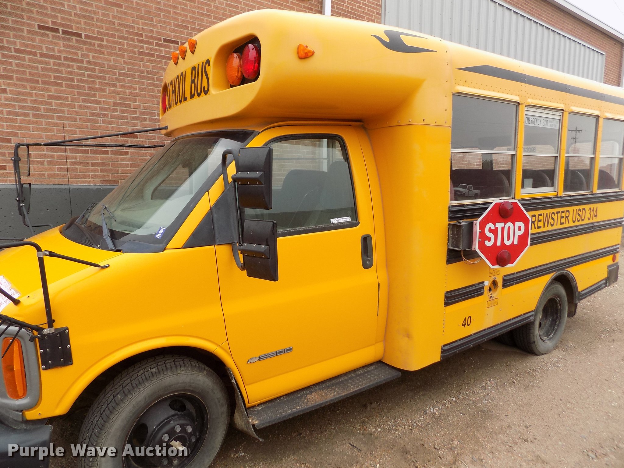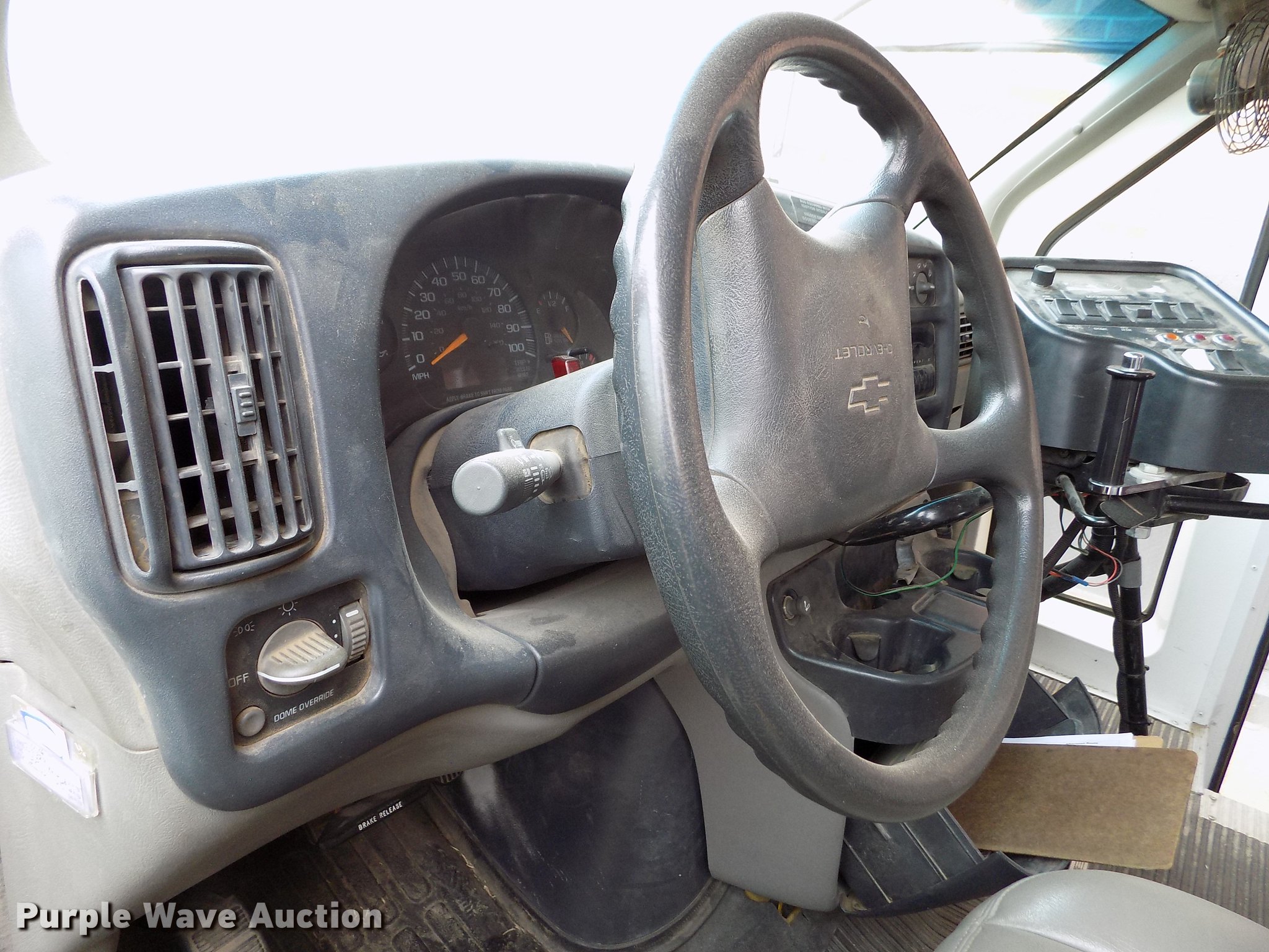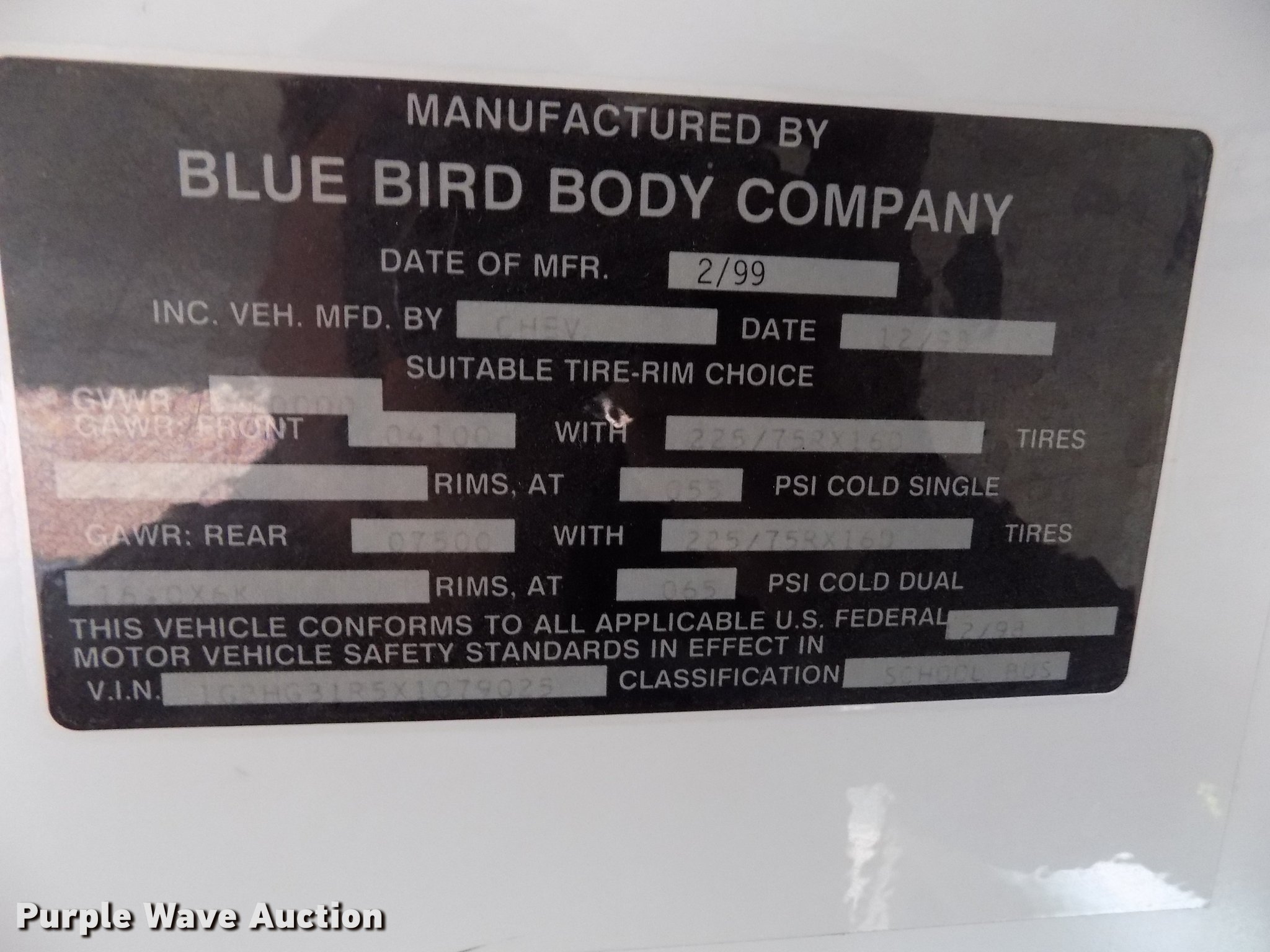Purple Wave is selling a used Bus in Kansas. This item is a 1999 Chevrolet Express 3500 school bus with the following: 161,488 miles on odometer, 5.7L V8 OHV 16V gas engine, Automatic transmission, Single axle, Heat, Heated mirrors, 21 passenger capacity, Ceiling, rear, and side emergency exits, Emergency door alarms, Beacon light, Lighted stop sign, Blue Bird Microbird body, Spring suspension, Hydraulic brakes, 225/75R16 tires, GVWR 10,000 lbs, Decals will be removed prior to auction, Engine electrical issues, Dead batteries, Fuel cap missing, Unit must be towed or hauled