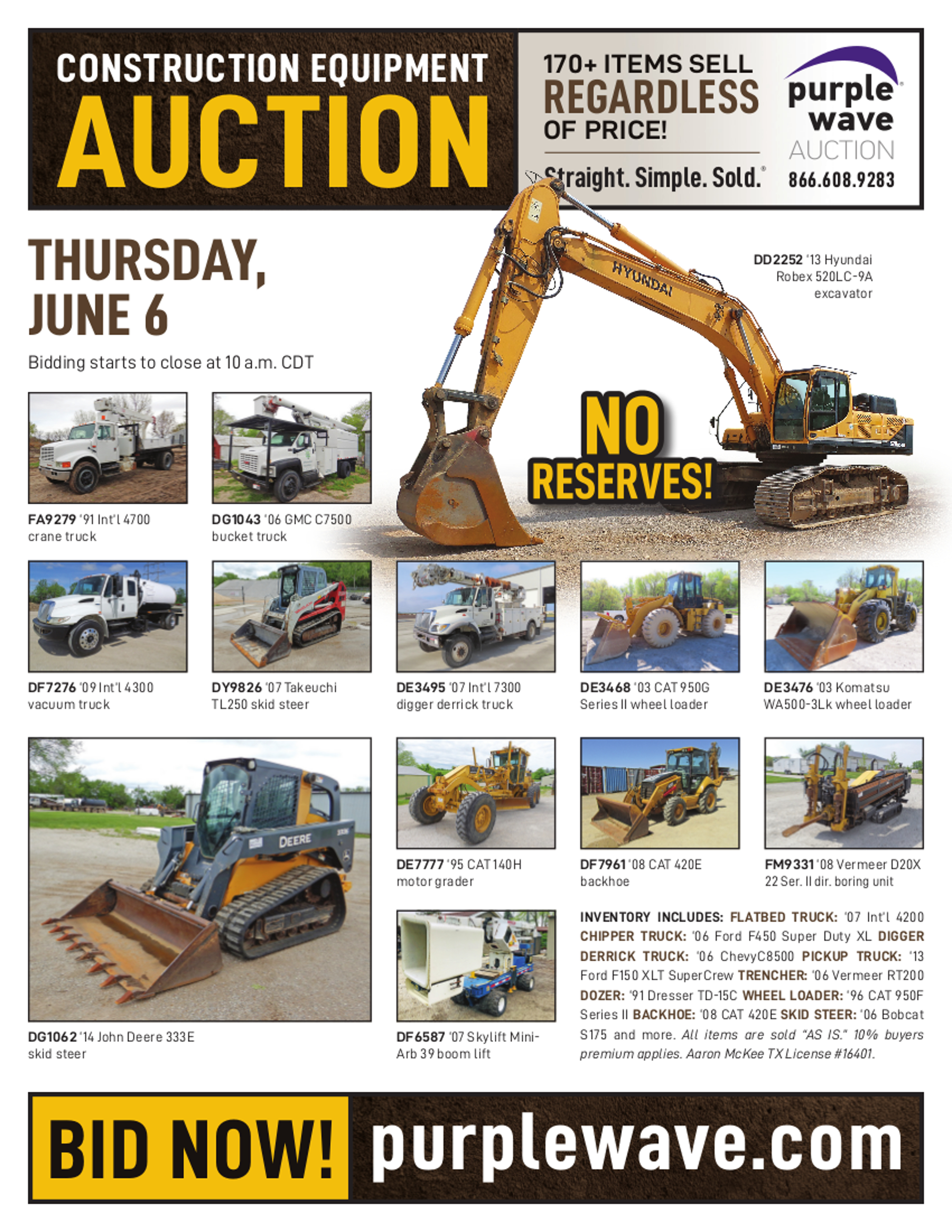 This auction is conducted by Purple Wave, Inc., whose home office is 825 Levee Drive, Manhattan, Kansas. Aaron McKee, Texas auctioneer license # 16401, operates Purple Wave, Inc. Complaints against us may be directed to the Texas Department of Licensing and Regulation, P.O. Box 12157, Austin, Texas 78711, (512) 463-6599. For additional required information, see the attached document.