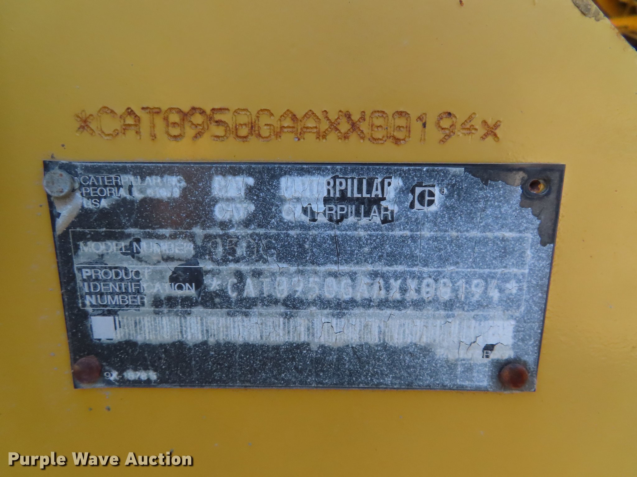 Purple Wave is selling a used Wheel Loader in Kansas. This item is a 2003 Caterpillar 950G Series II wheel loader with the following: 9,383 hours on meter, Caterpillar 3126 7.2L six cylinder diesel engine, 180 HP, Powershift transmission, 4F-4R gears, Enclosed cab, AC and heat, AM/FM, Two-lever bucket controls, Ride control, Caterpillar 9'8"W bucket, 4.25 cu. yd. capacity, Serial CAT0950GAAXX00194
