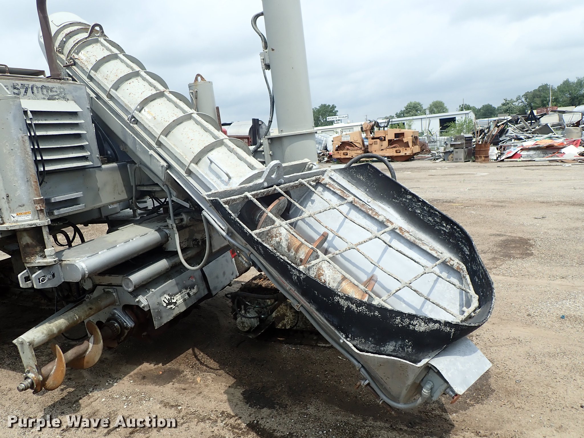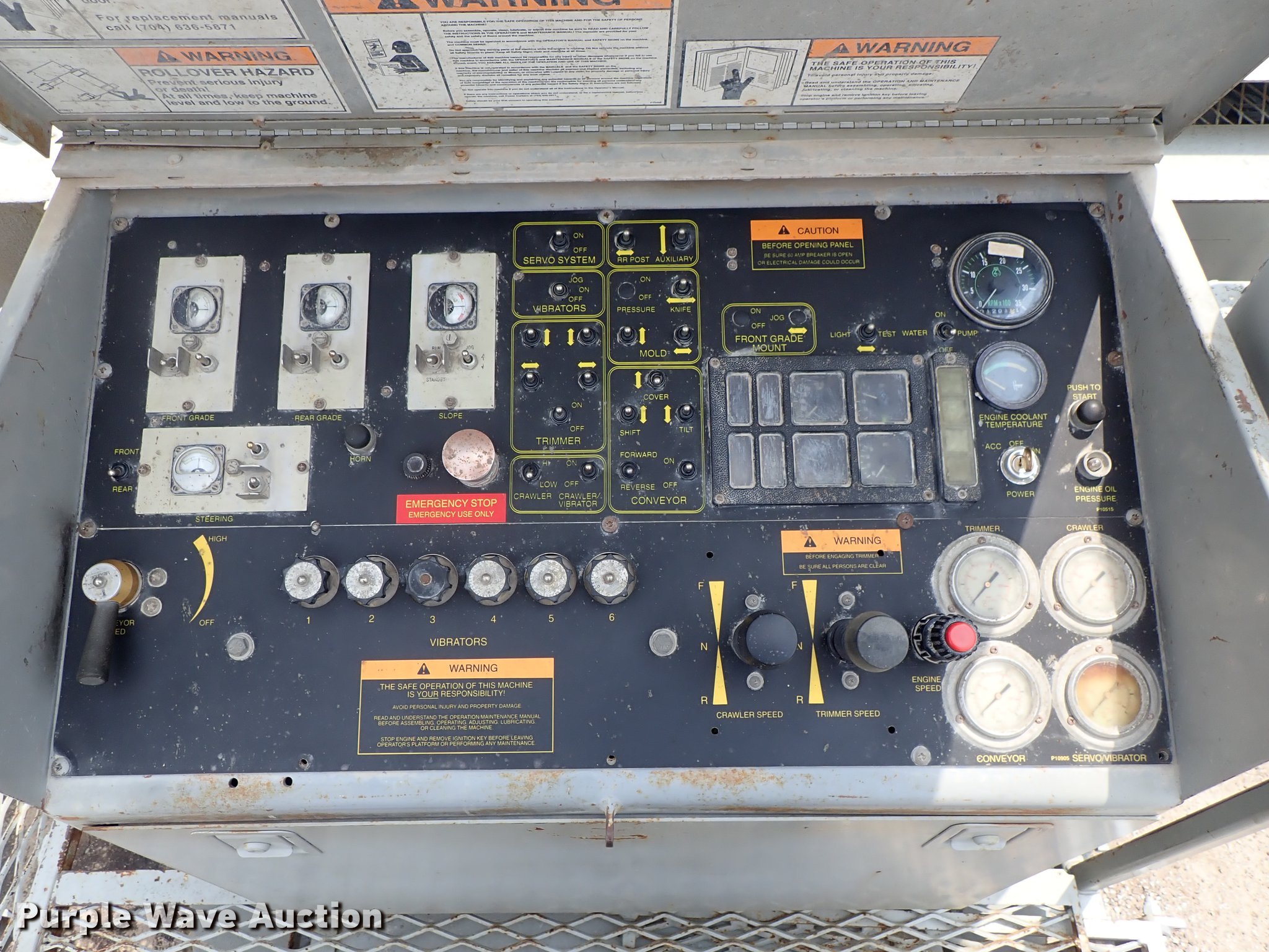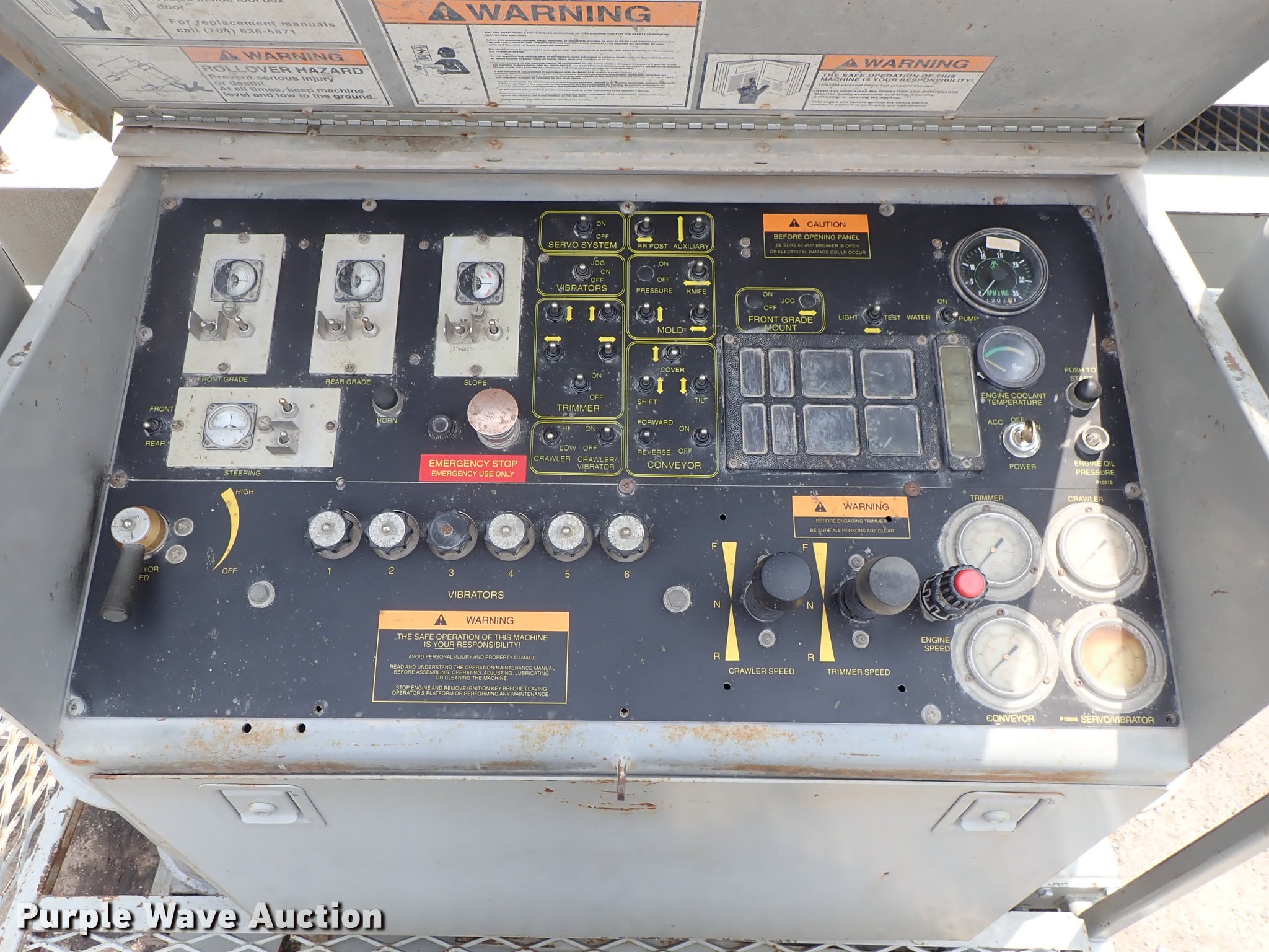 Purple Wave is selling a used Concrete Paver or Curb Machine in Kansas. This item is a Power Curber 5700-B curb machine with the following: 1,198 hours on meter, Four cylinder diesel engine, Hydrostatic transmission, 13'L x 16" diameter feed auger, 42"W x 12" diameter trimmer auger, Adjustable conveyor speed, 12"W steel tracks, Serial 57B1197886