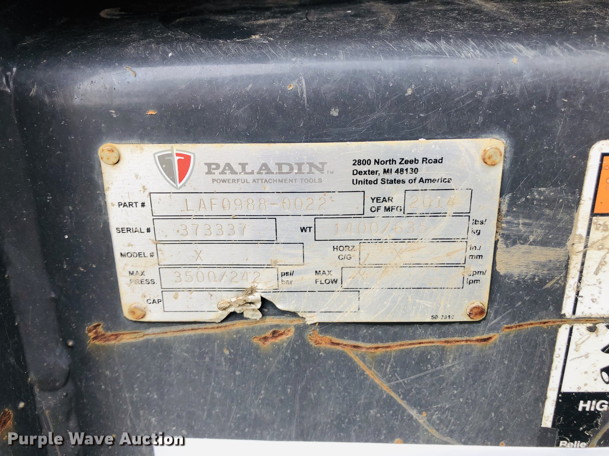 Purple Wave is selling a used Skid Steer Attach. in Illinois. This item is a 2014 Paladin LAF0988-0022 four-in-one skid steer bucket with the following: 7'W, Serial 373337