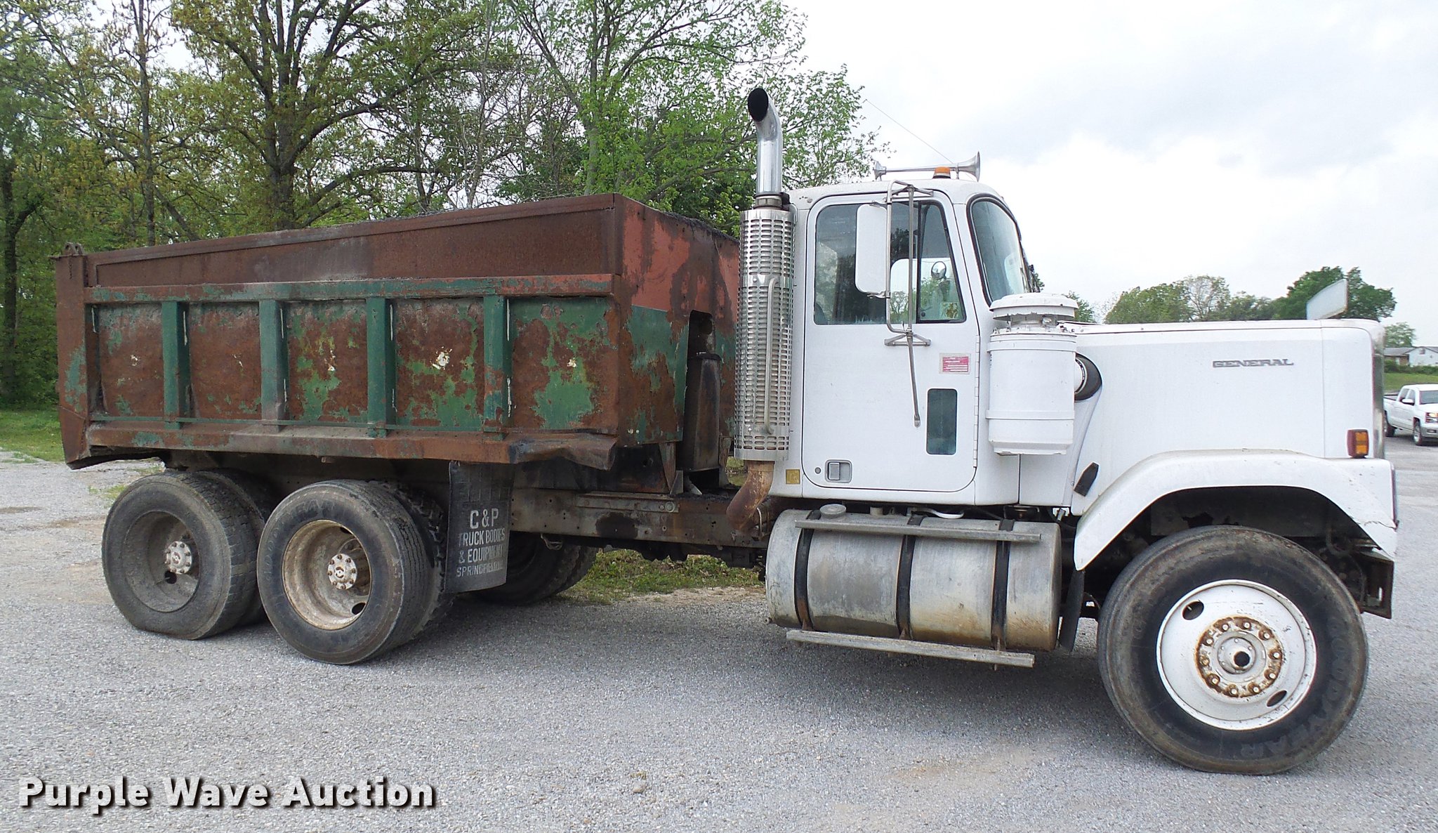 Purple Wave is selling a used Construction Dump Truck in Missouri. This item is a 1985 GMC General dump truck with the following: 919,005 miles on odometer, 8,139 hours on meter, Detroit Diesel six cylinder diesel engine, Eaton Fuller Road Ranger 13 speed manual transmission, Tandem axle, Inter-axle differential lock, Heat, Air suspension seat, PTO, Heil 13'L x 8'W steel dump bed, 48" side height, Single ram hoist, Manual operated end gate, Spring suspension, Air brakes, 11R24.5 tires, GVWR 57,500 lbs, Unit# 02-0021