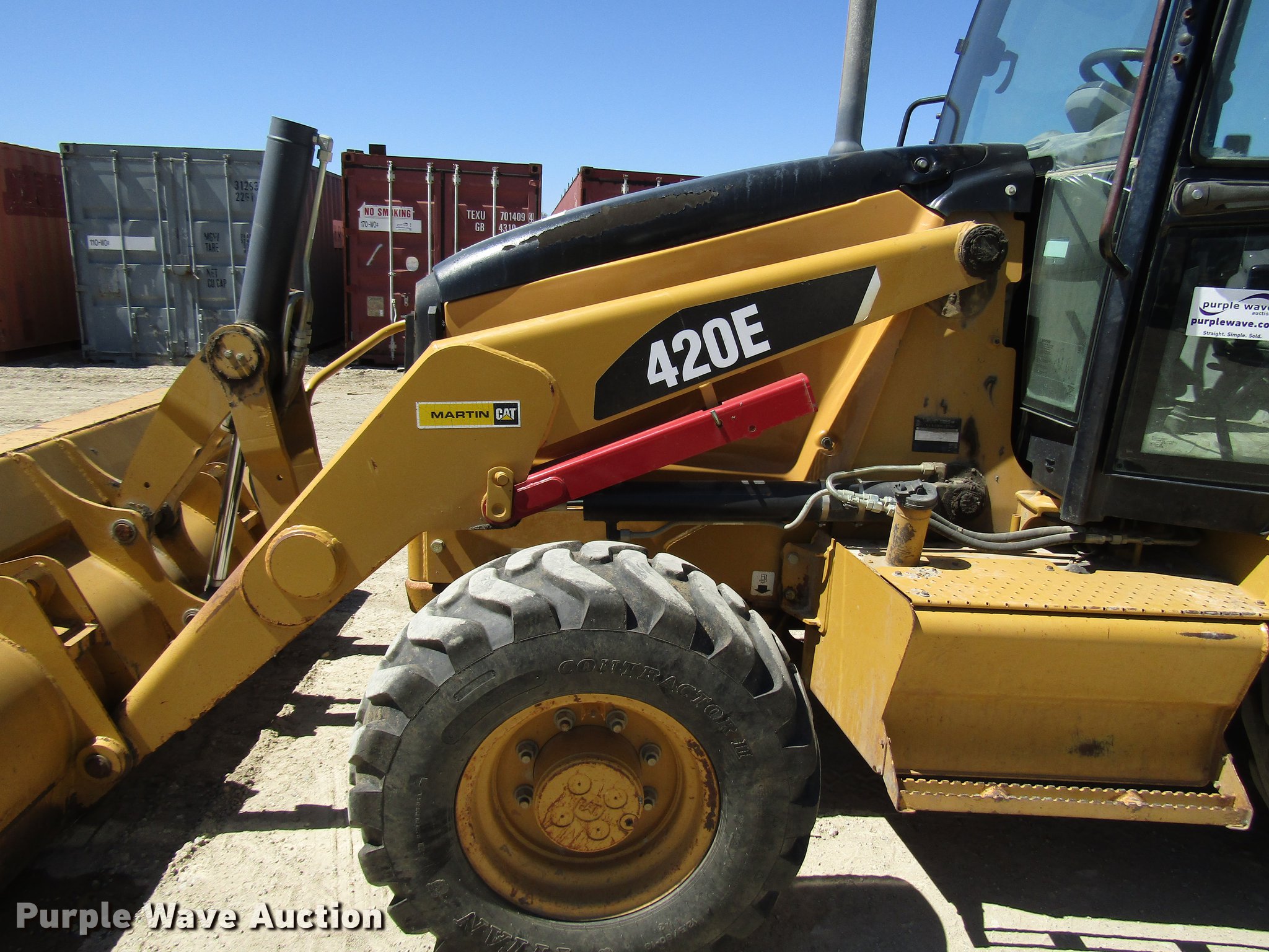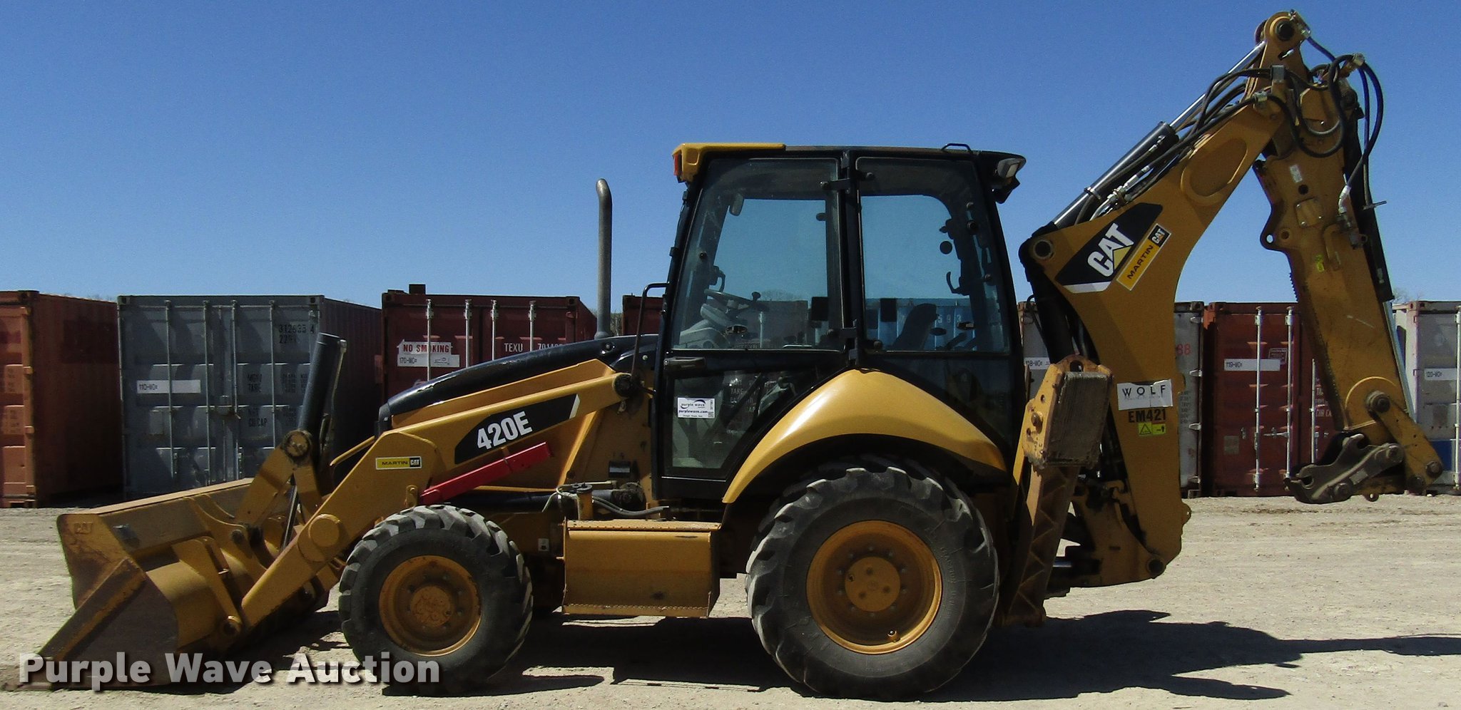 Purple Wave is selling a used Tractor Loader Backhoe in Kansas. This item is a 2008 Caterpillar 420E backhoe with the following: 5,348 hours on meter, Caterpillar four cylinder diesel engine, Serial DH708123, Powershift transmission, 4F-4R gears, Four wheel drive, Enclosed cab, AC and heat, AM/FM, Pilot backhoe controls, Caterpillar 86"W loader bucket, Bolt-on cutting edge, Extendable stick, Manual quick coupler, Auxiliary hydraulics, (3) Caterpillar backhoe buckets, 36"W, (6) teeth, 24"W, Weld-on cutting edge, 12"W, (3) teeth,, 12.5/80-18 front tires, 19.5L-24 rear tires, Serial CAT0420EEHLS05785, Unit# EM821