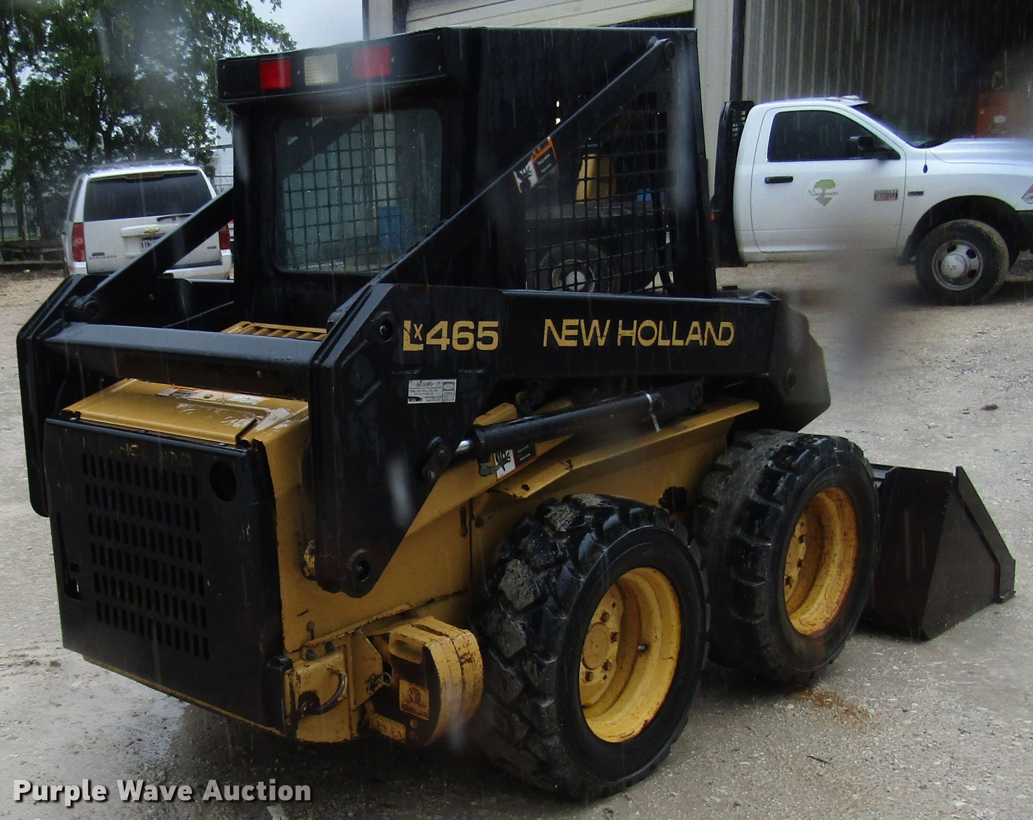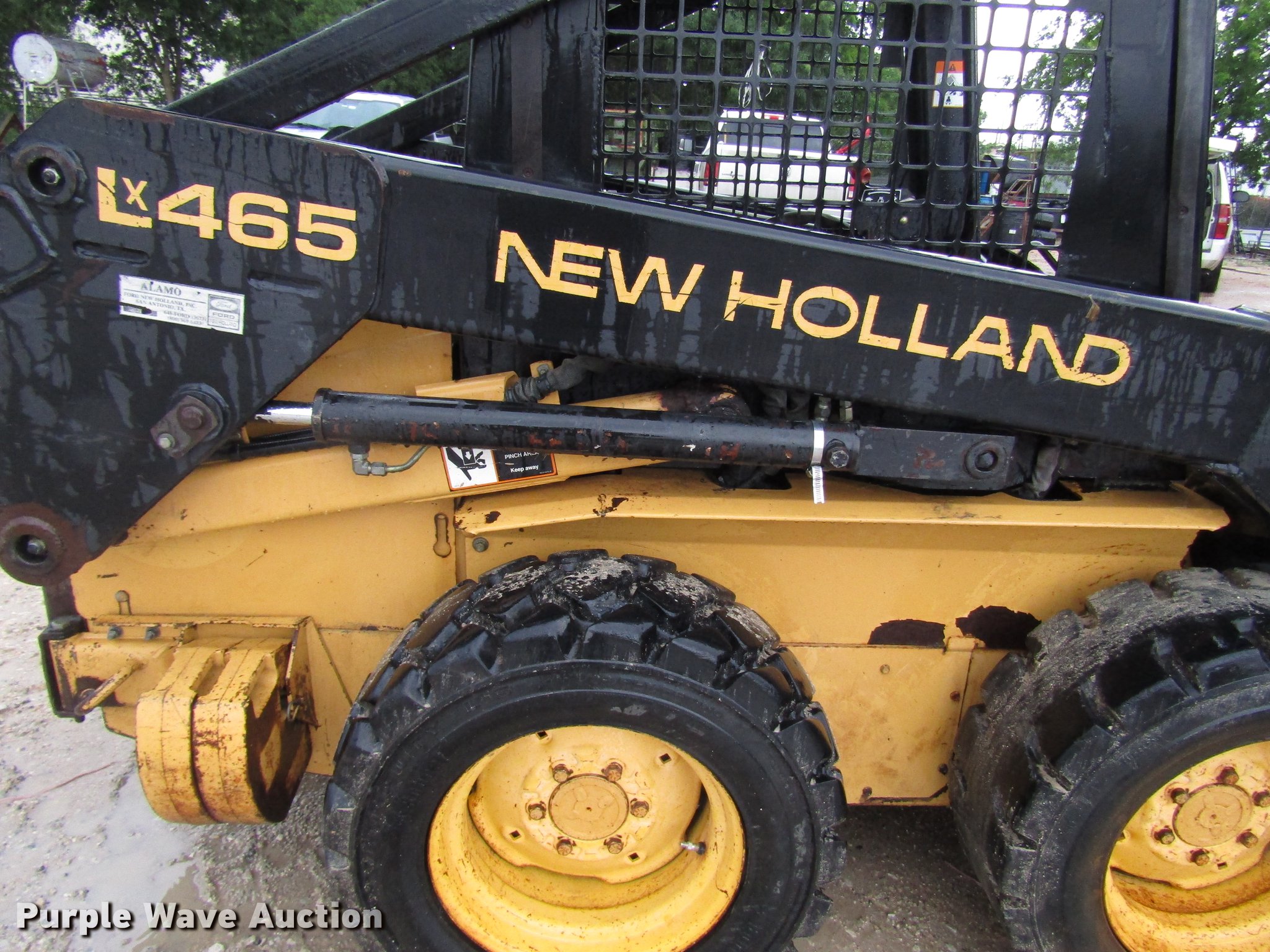 Purple Wave is selling a used Skid Steer Loader in Texas. This item is a 1997 New Holland LX465 skid steer with the following: Three cylinder diesel engine, Model N843, Hydrostatic transmission, OROPS, Foot bucket controls, Front work lights, Auxiliary hydraulics, Manual quick coupler, 60"W bucket, Weld-on cutting edge, Counterweights, 10-16.5 tires, Dead battery, Unknown hours, faded LCD screen, Serial 9079