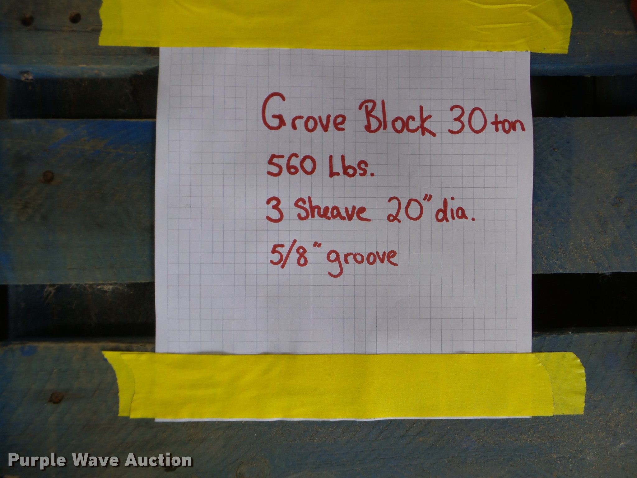 Purple Wave is selling a used Crane Attach. in South Dakota. This item is a Grove sheave block with the following: 5/8" groove, Three sheave 20" diameter, 30 ton capacity, 560 lbs