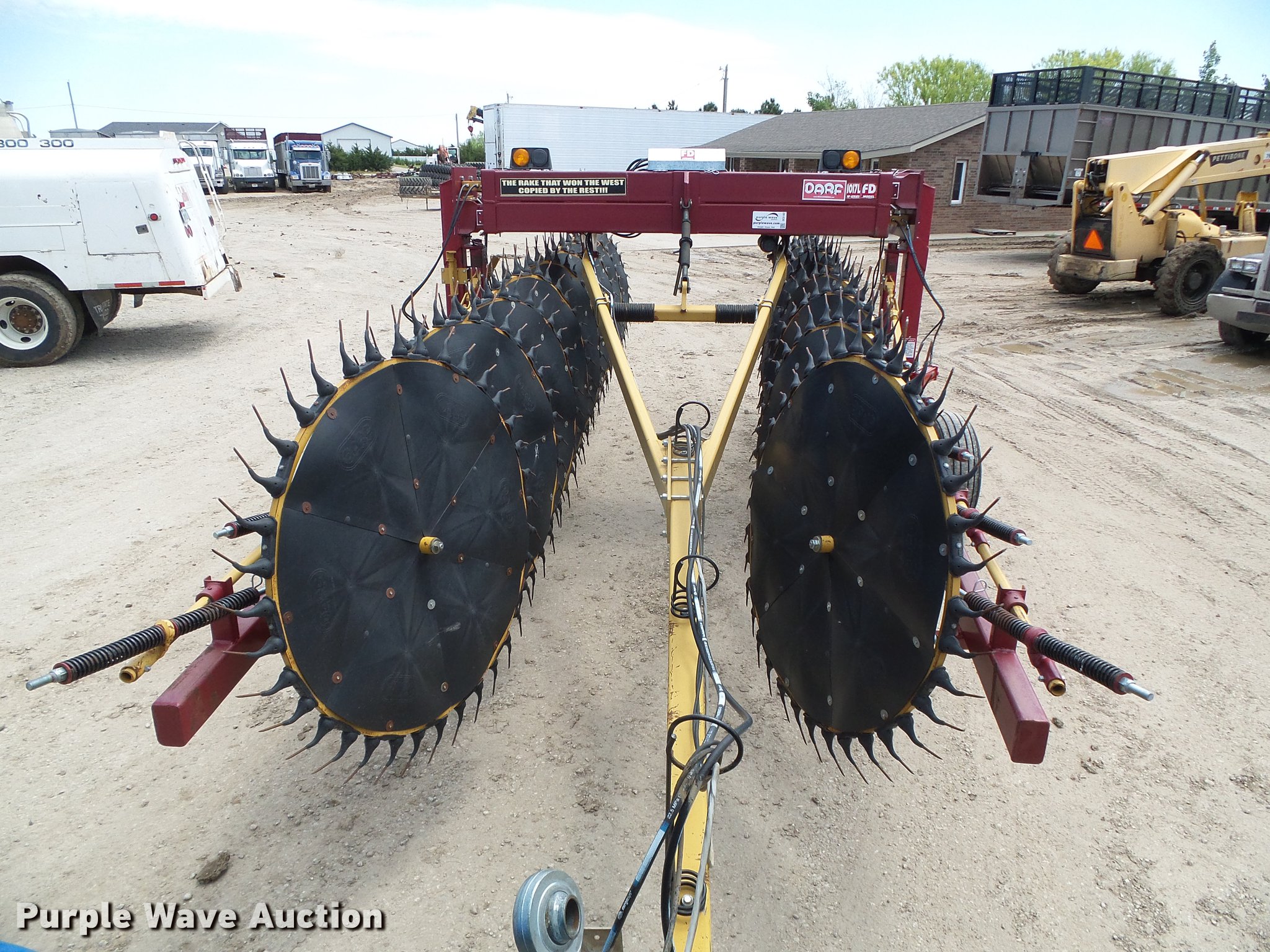 Purple Wave is selling a used Hay Rake in Kansas. This item is a 2016 Darf 1017LFDWC hay rake with the following: (18) 4' diameter wheels, Hydraulic lift and fold, Hydraulic width adjust, Control box, Transport lights, Pin hitch, 11L-15 tires, Serial 60172