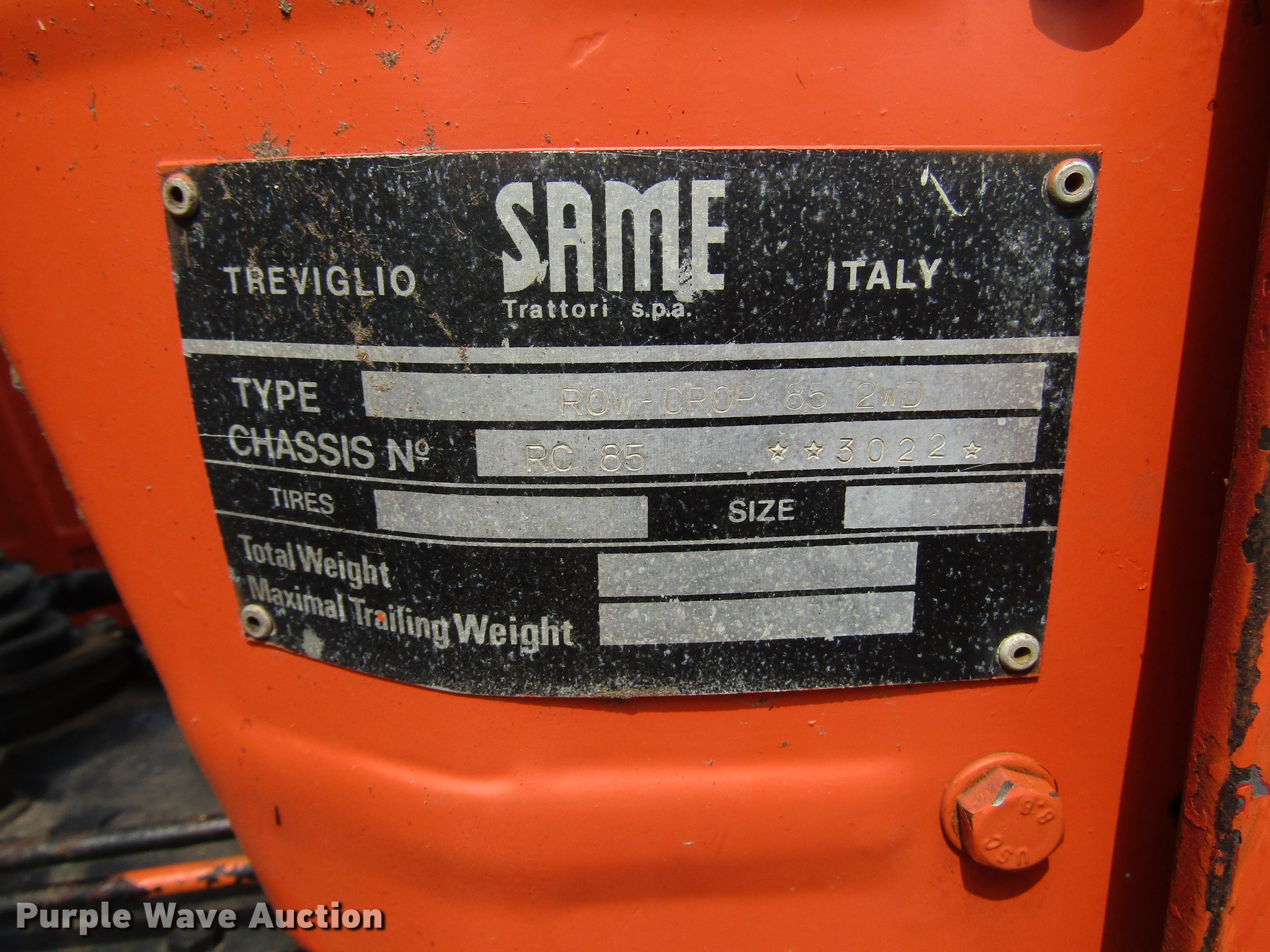 Purple Wave is selling a used Tractor in Texas. This item is a Same Row Crop 85 tractor with the following: 3,927 hours on meter, Four cylinder diesel engine, Synchro transmission, 12F-12R gears, Three point, Top link, 540 PTO, (2) rear hydraulic remote sets, 92" wheelbase, 7.50-20 front tires, 13.6-38/12-38 rear tires, Serial 3022