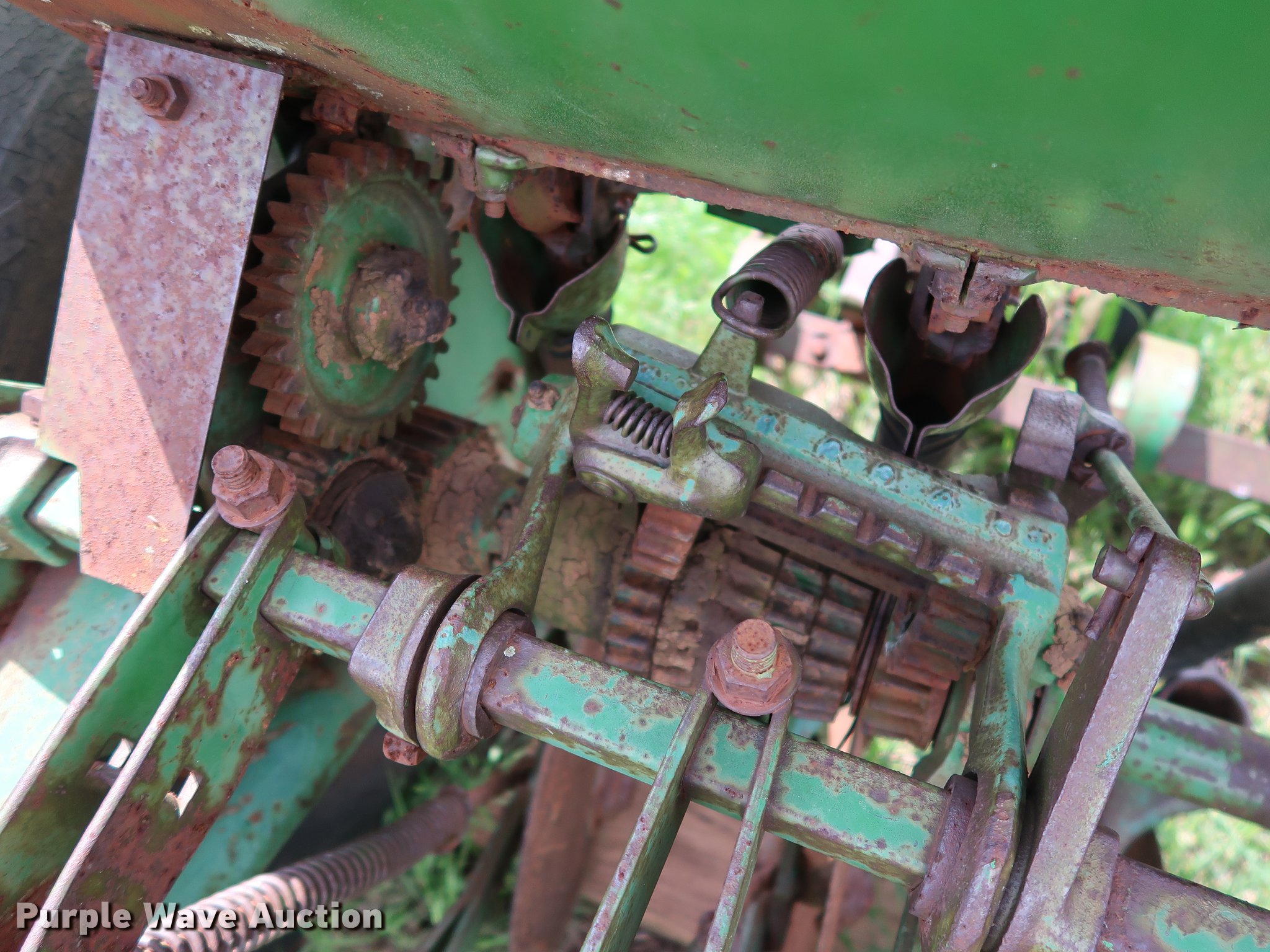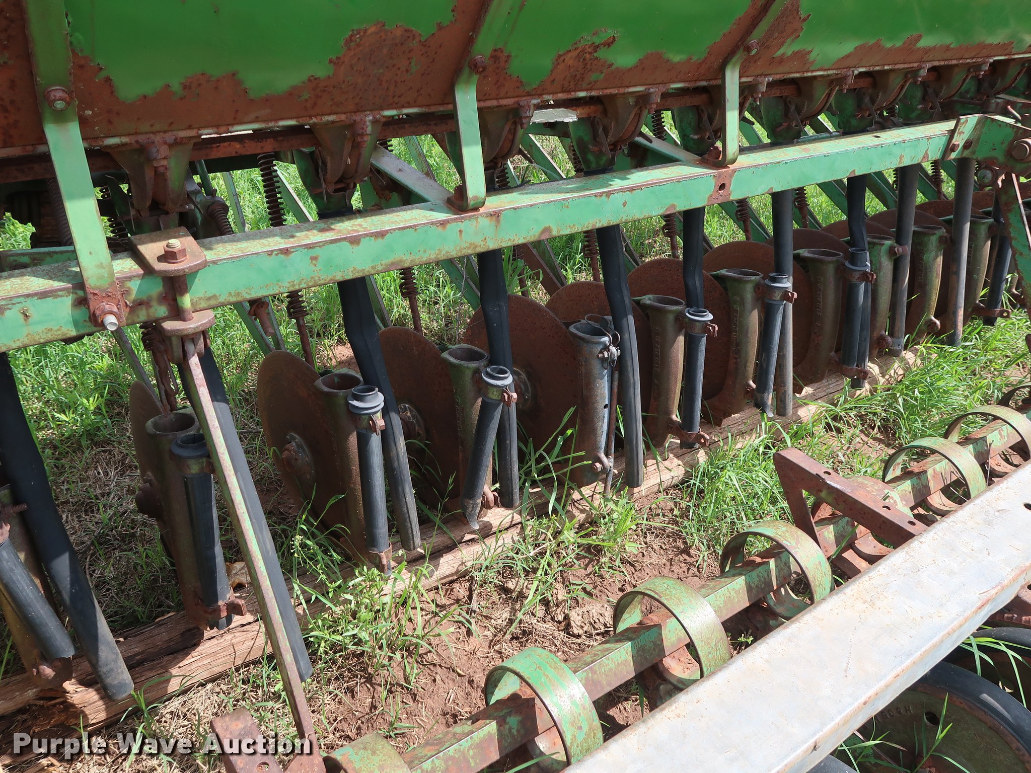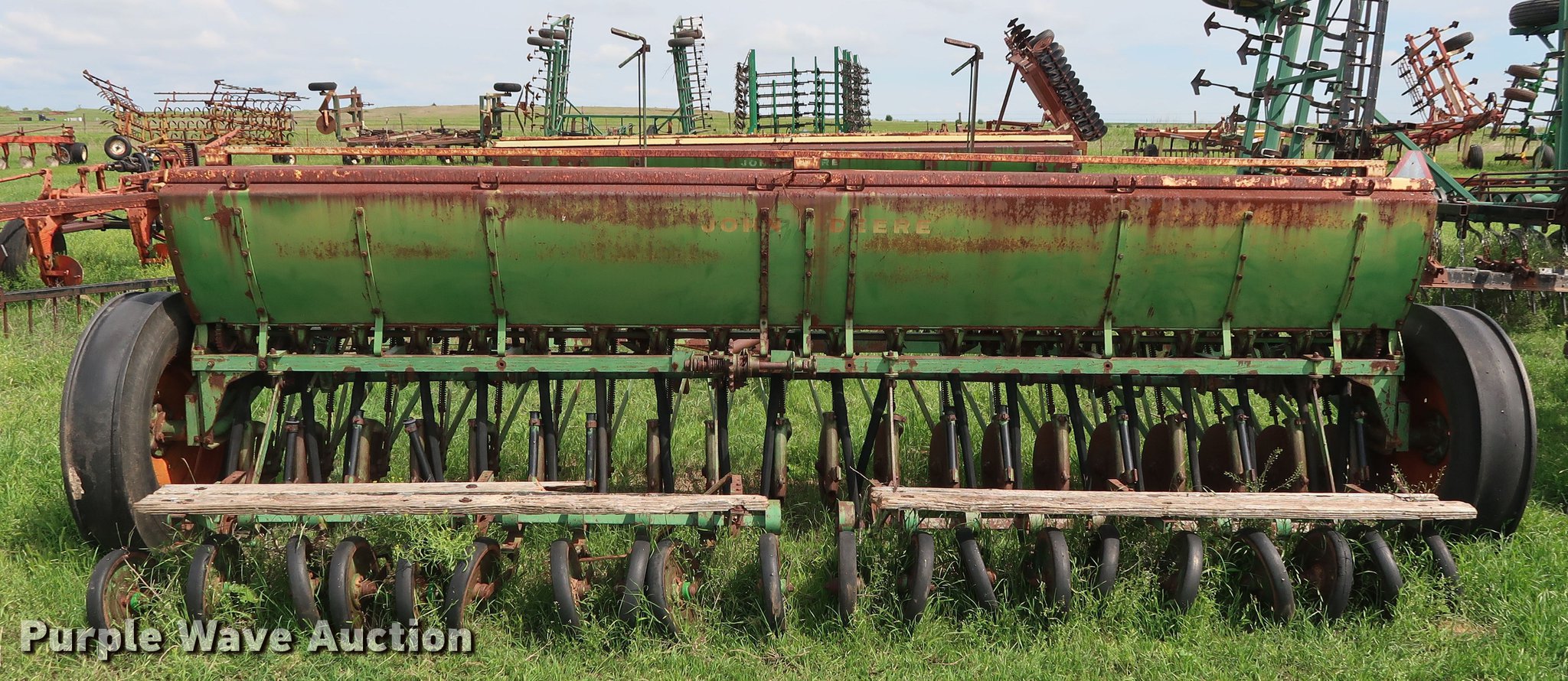 Purple Wave is selling a used Grain Drill or Seeder in Oklahoma. This item is a (2) John Deere 208 grain drills with the following: 15'W, 20 row units, 8" row spacing, Bulk fill system, Ground meter drive, Single disk openers, Single rubber closing system, Walton H-240 drill hitch, Serial 15161, (3) P215/75R15 transport tires, (4) 7.50-20 drive/outside tires, Serial 001112M-DR208B/066100M-E0DRB