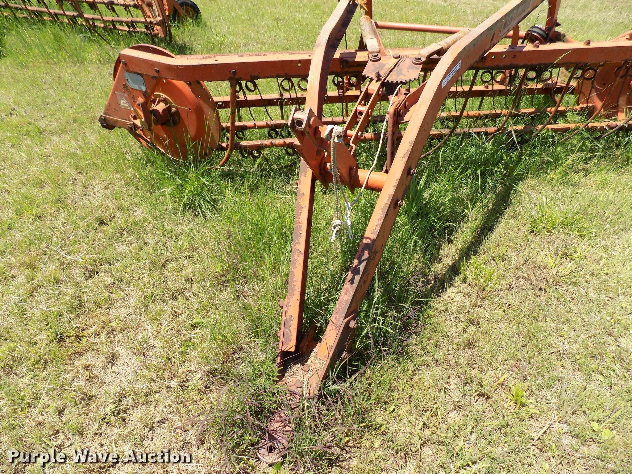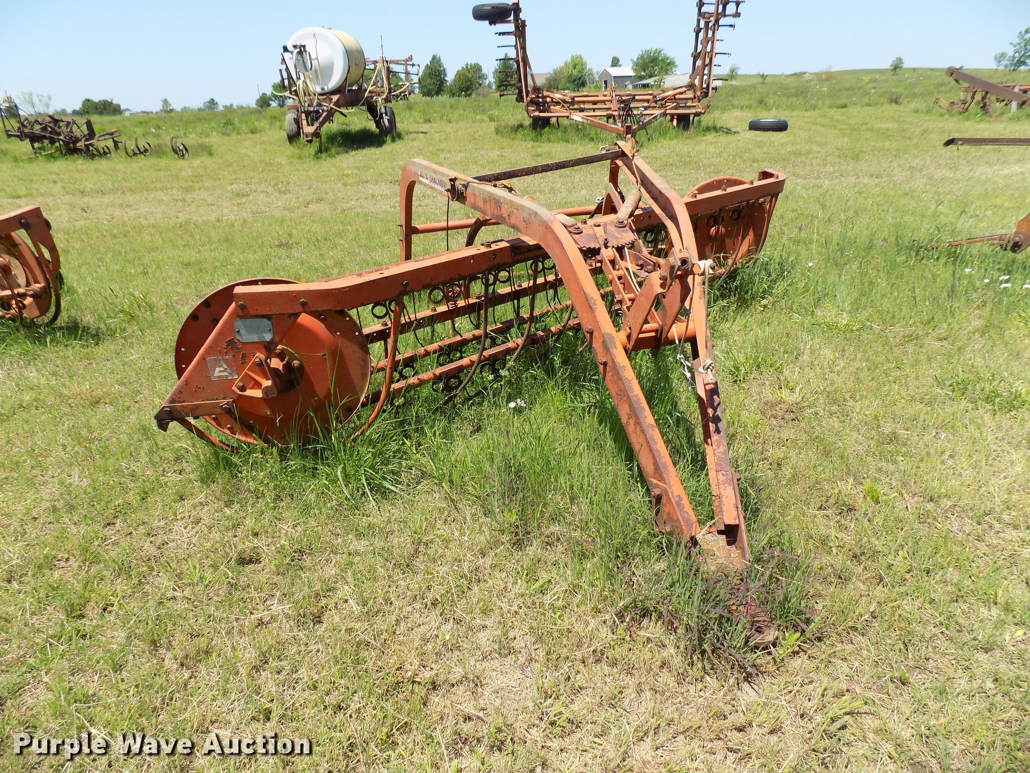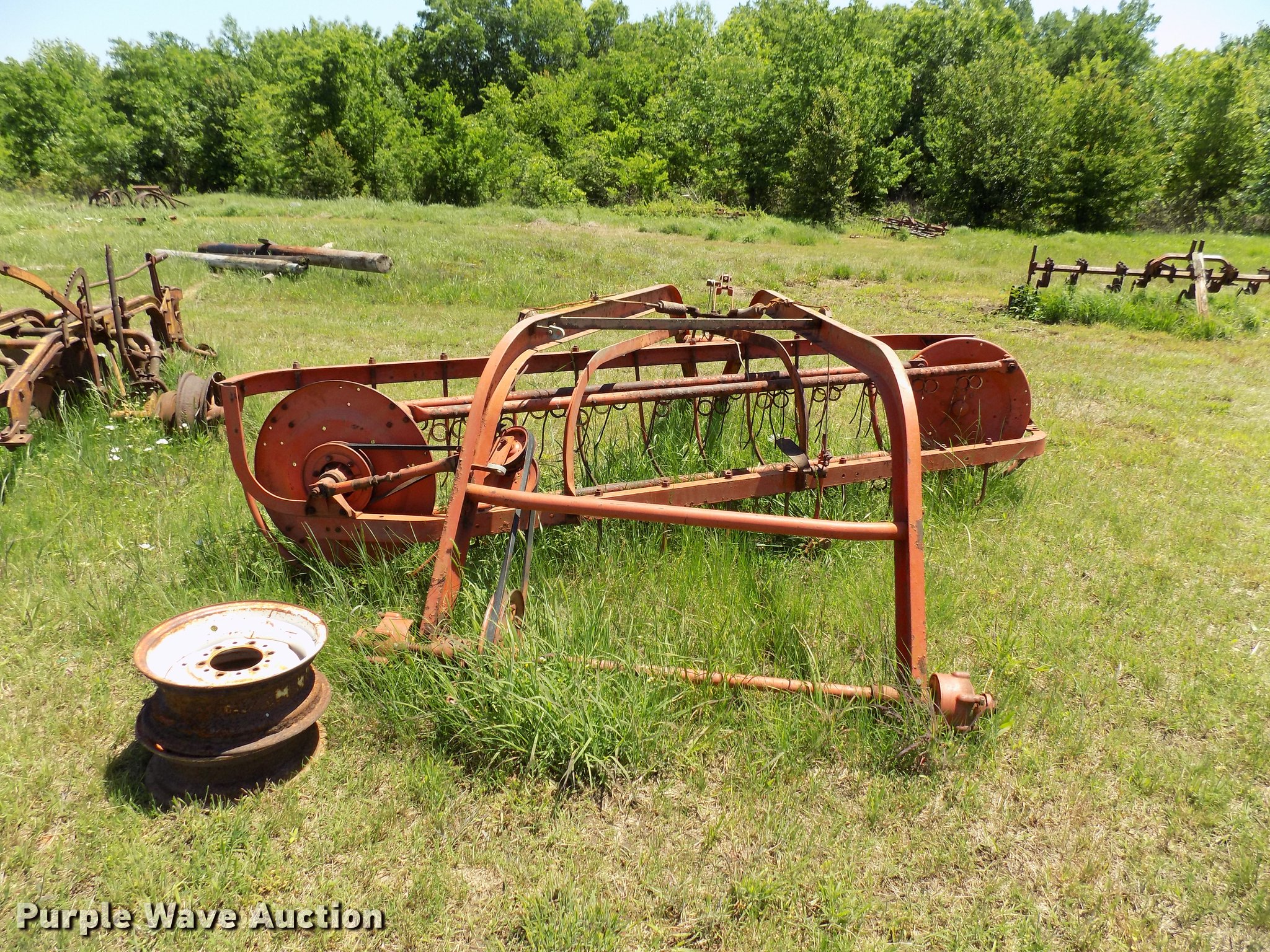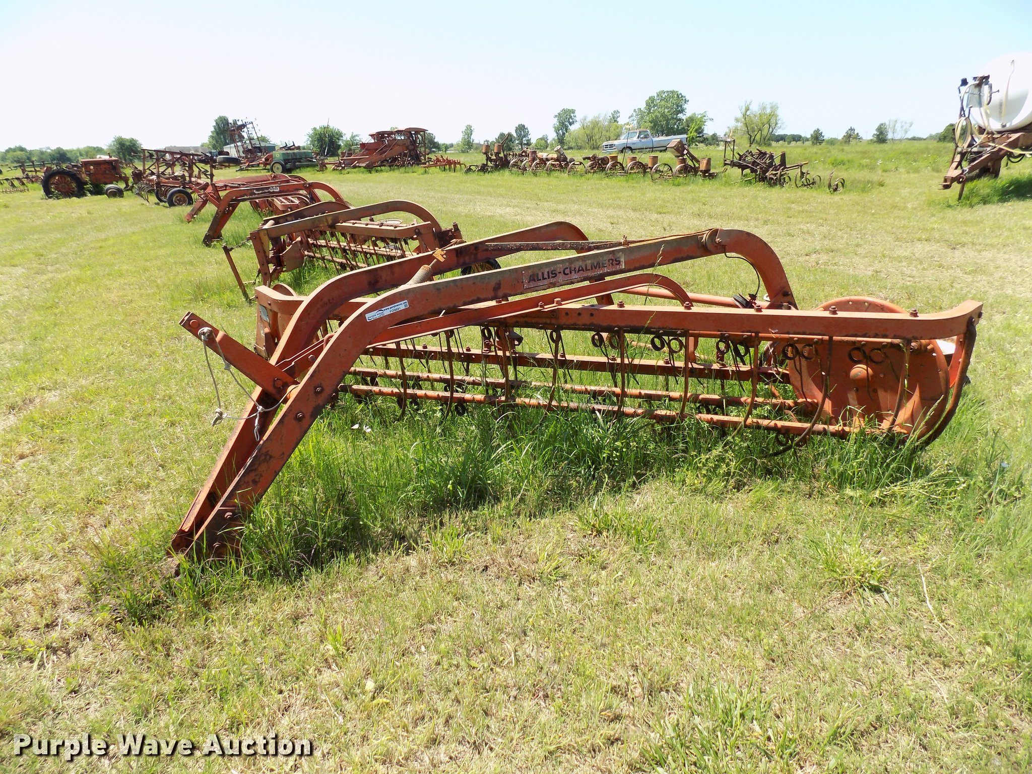 Purple Wave is selling a used Hay Rake in Oklahoma. This item is a Allis Chalmers basket rake with the following: 9'W, Wheels missing