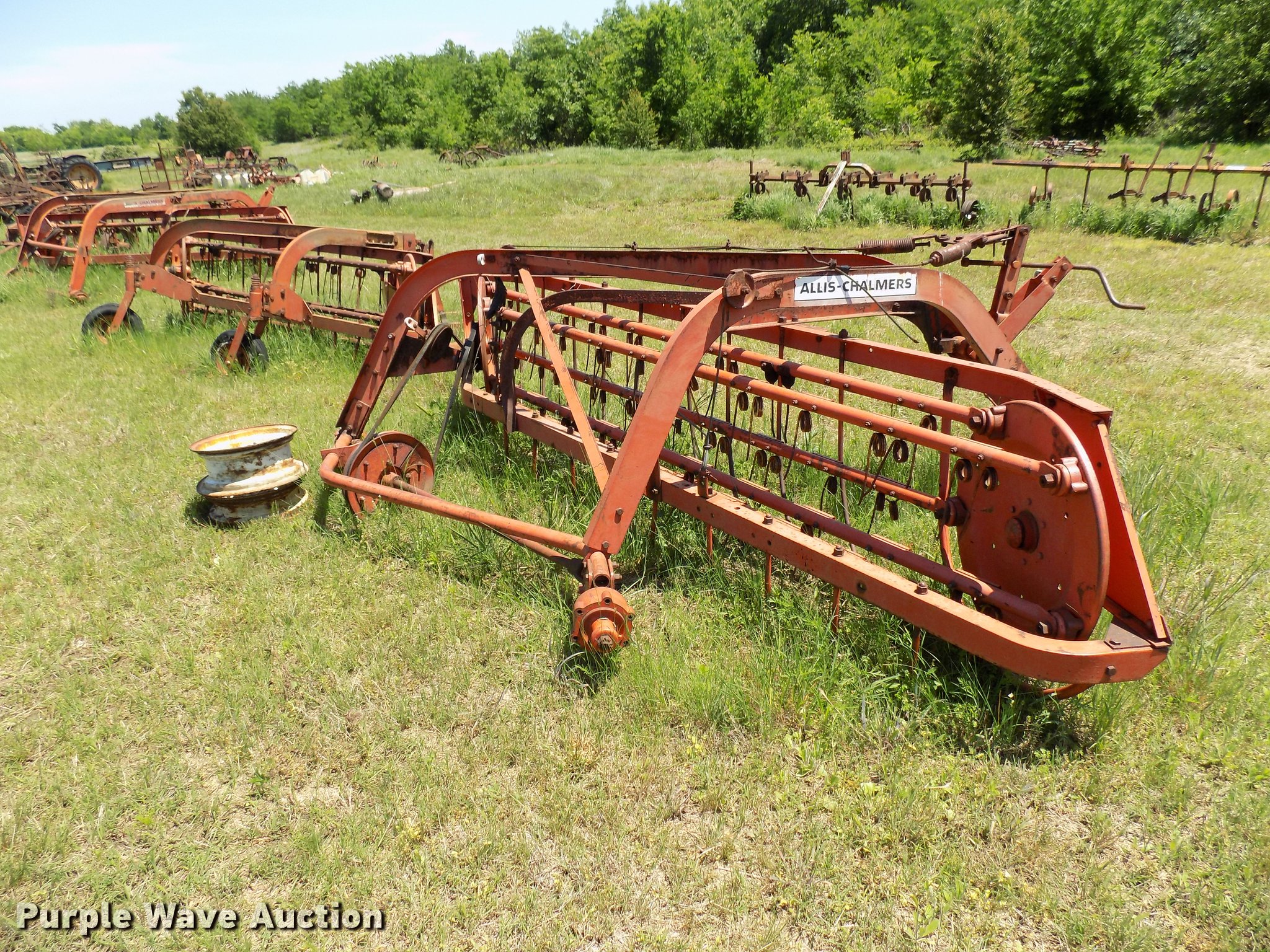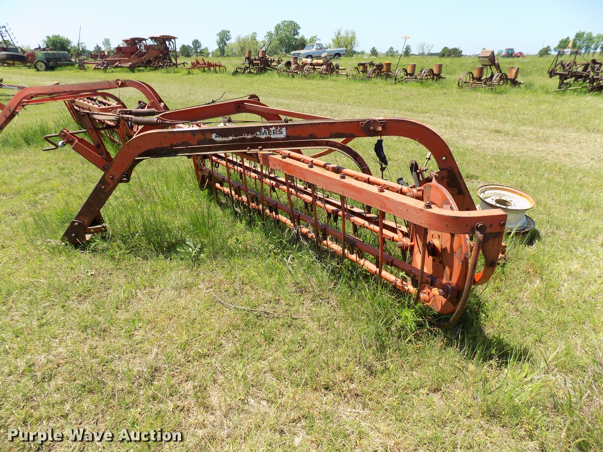 Purple Wave is selling a used Hay Rake in Oklahoma. This item is a Allis Chalmers basket rake with the following: 9'W, Wheels missing