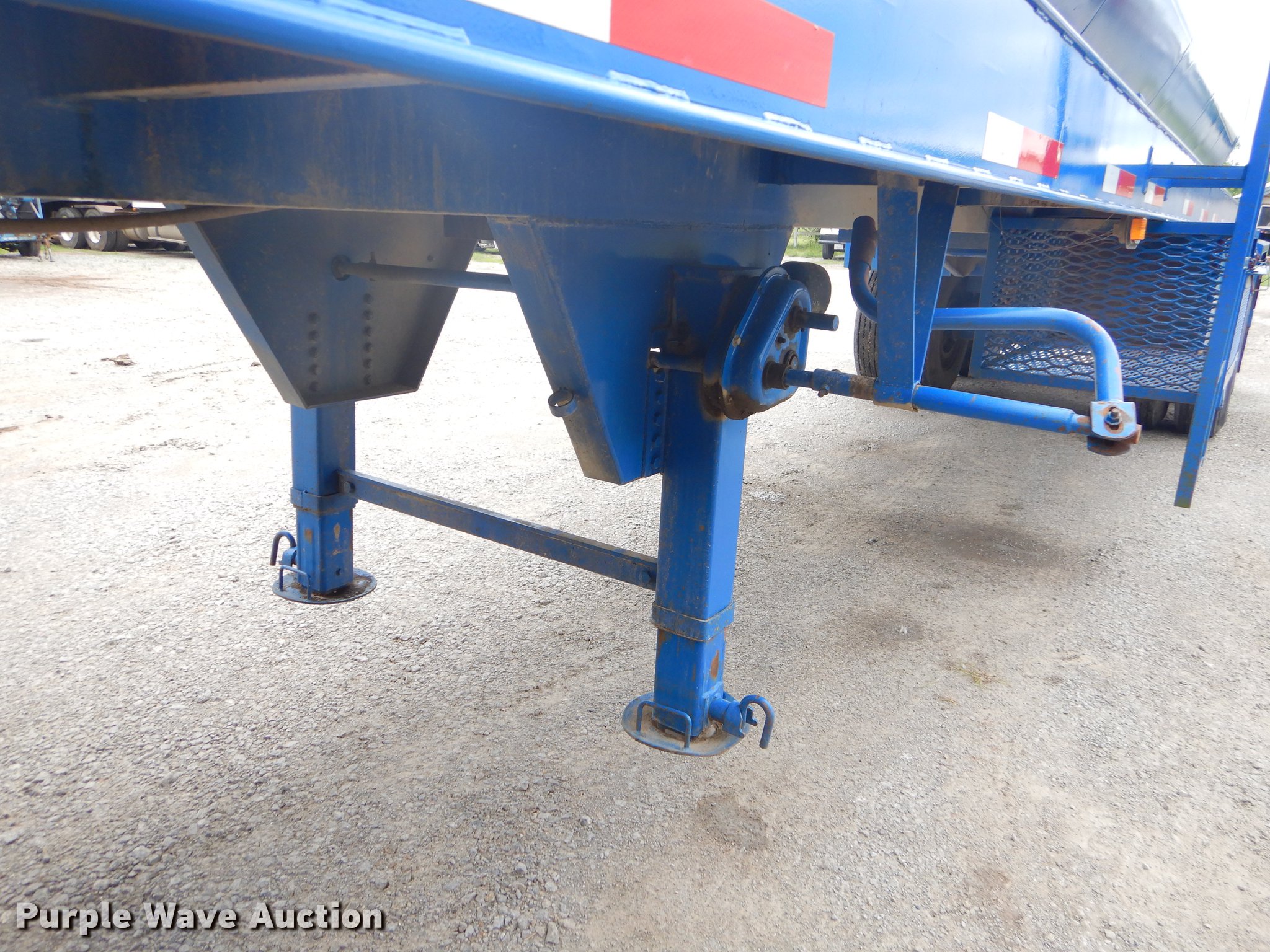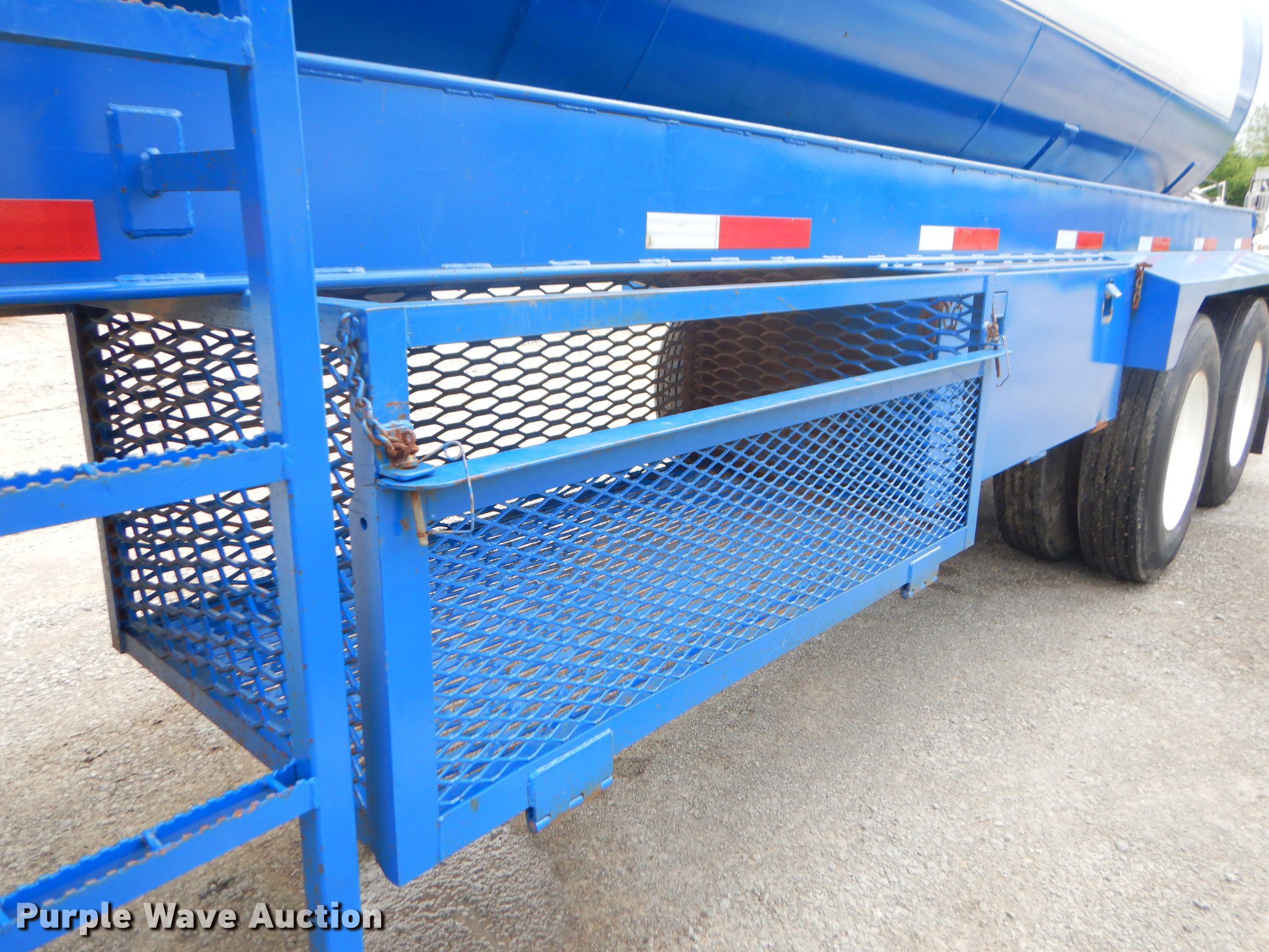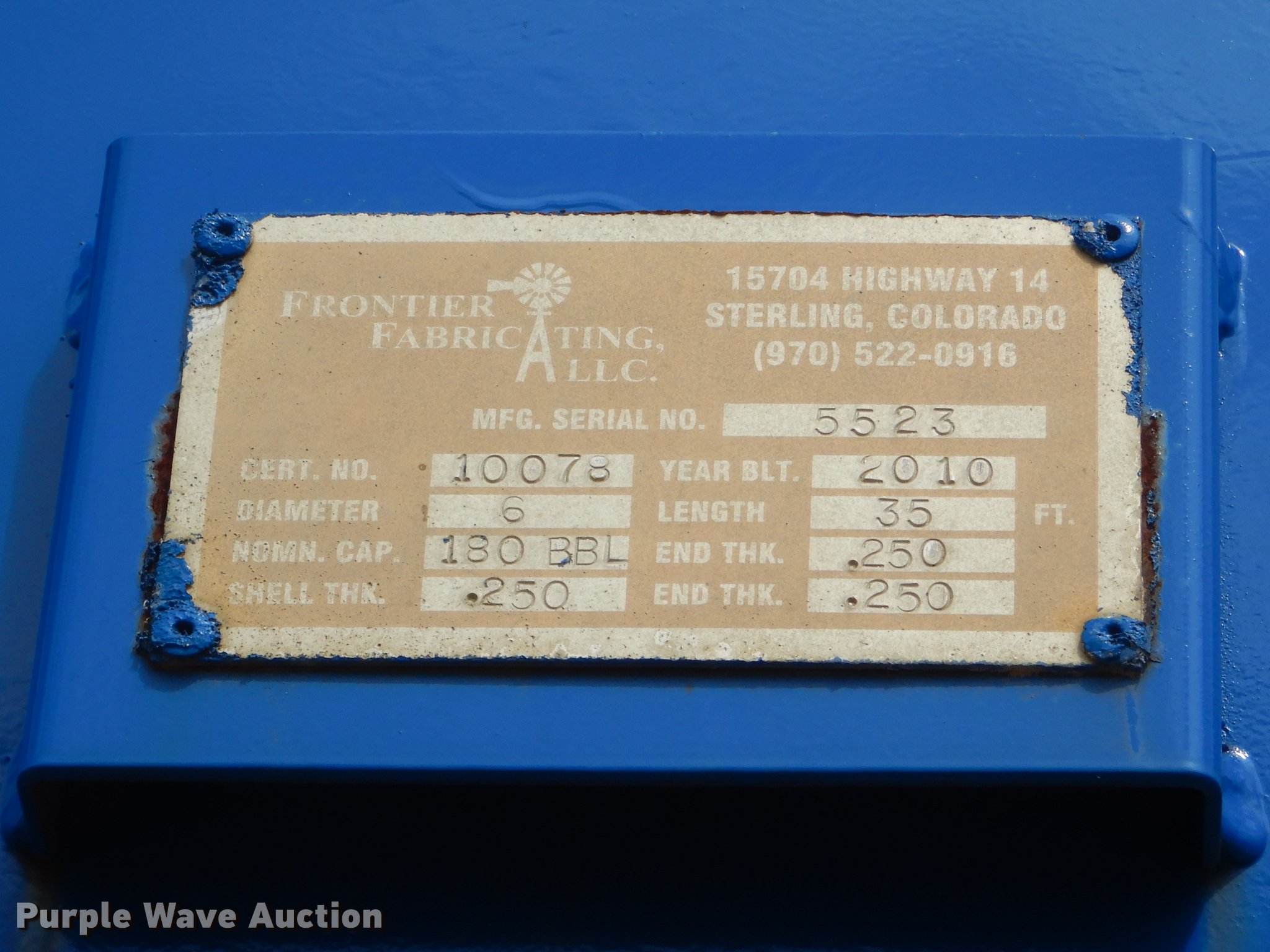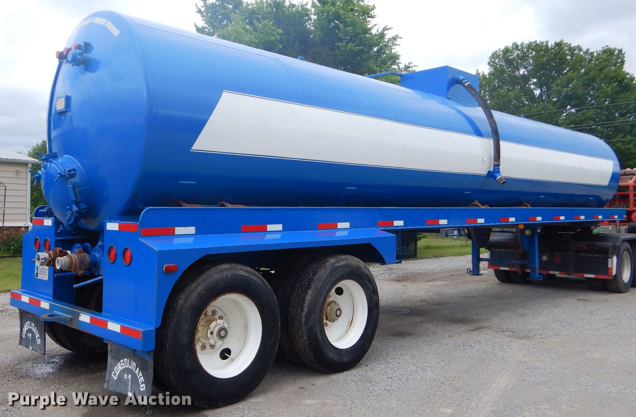 Purple Wave is selling a used Tank Trailer in Oklahoma. This item is a 1980 Tiger tank trailer with the following: 37'L x 8'W overall, 6' diameter steel tank, (4) baffles, 180 barrel capacity, 0.250" thickness, Tank coating, Rebarreled in 2010, Certification no. 10078, Serial 5523, (2) 3.5" outlet valves, (2) 20.5"W manways/manholes, 15'L hose, 20'L hose, Two speed landing gear, Spring suspension, Air brakes, Tandem axle, Steel wheels, 11R24.5 tires