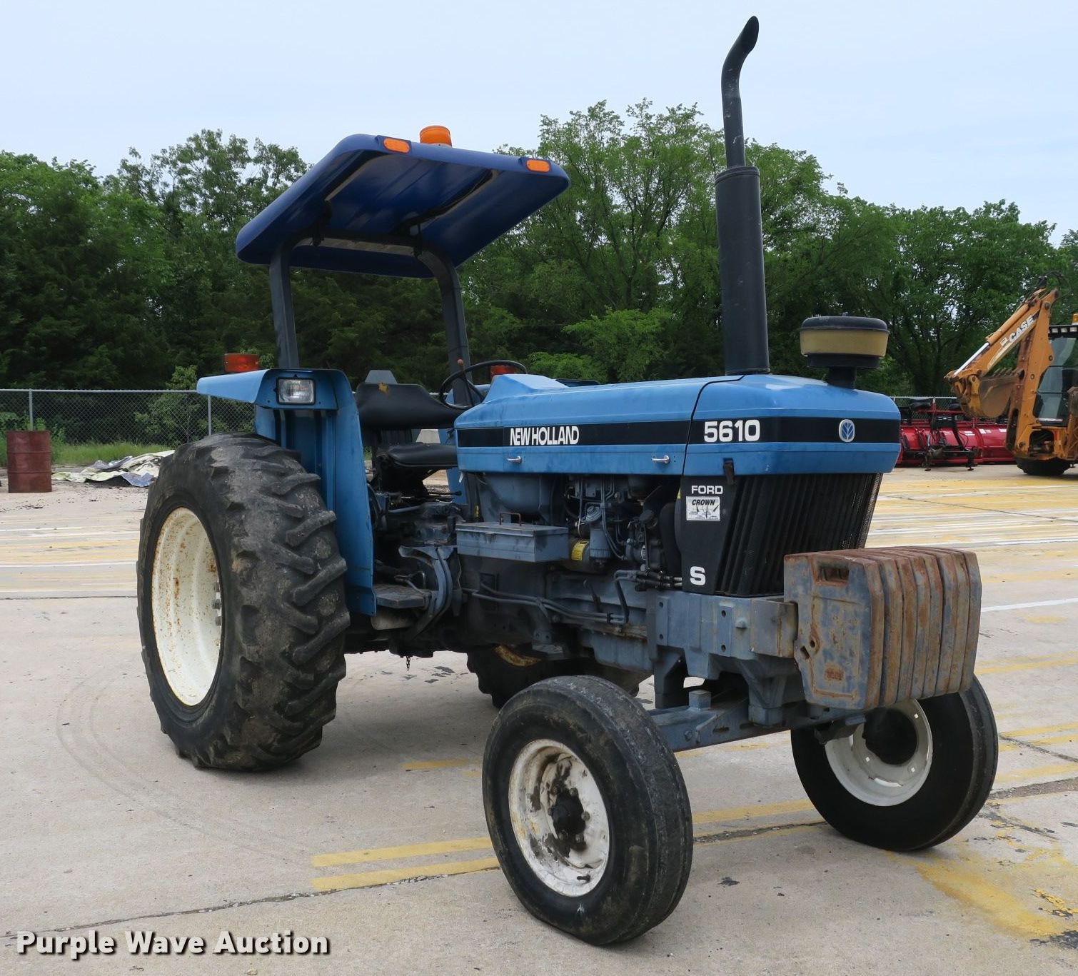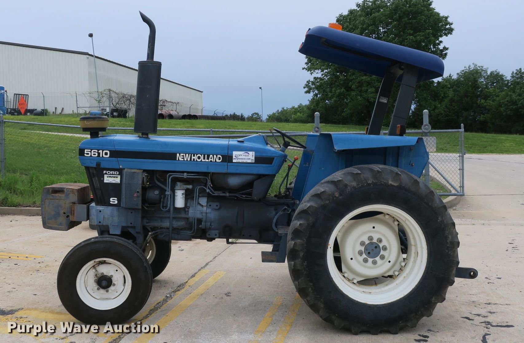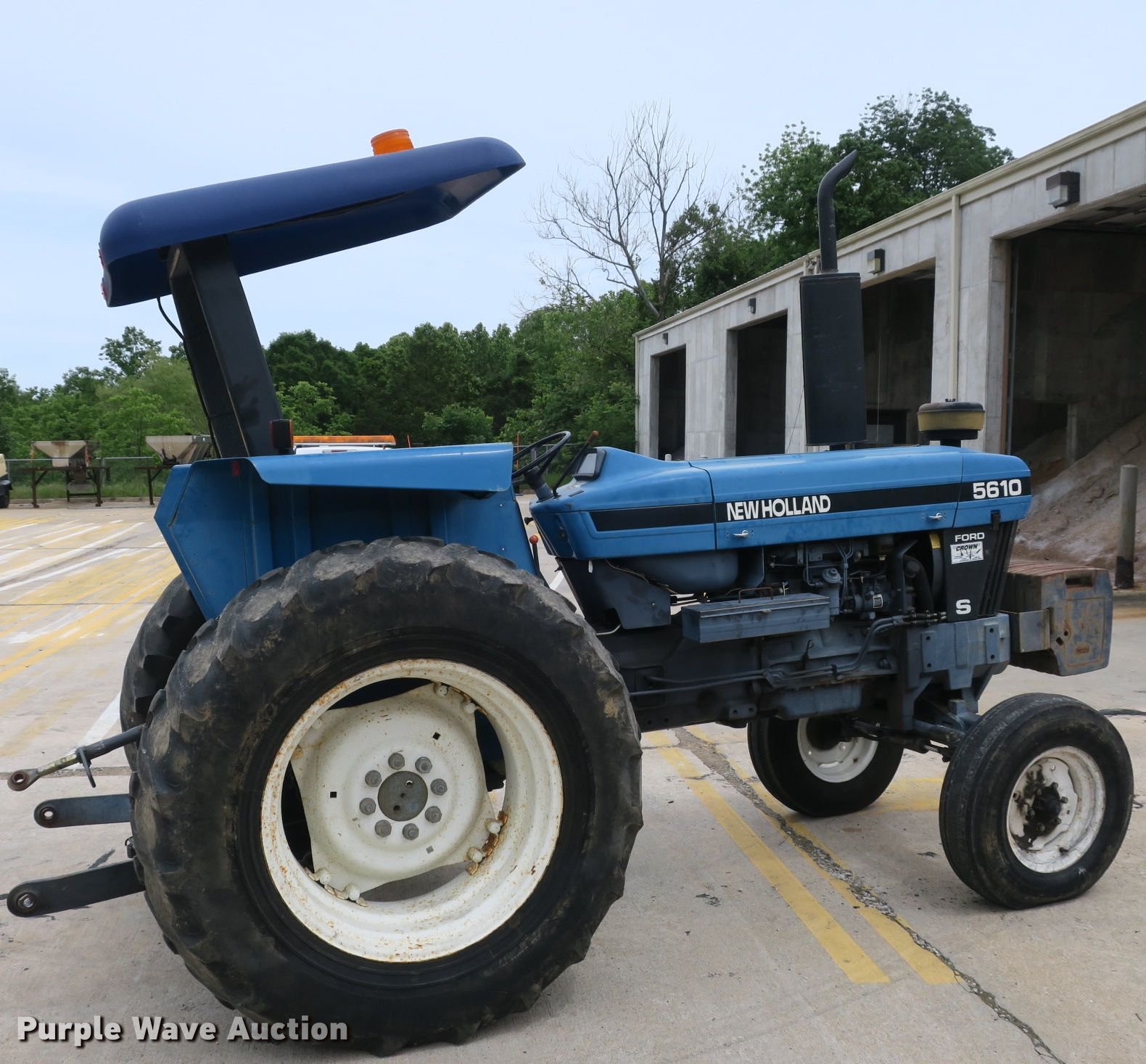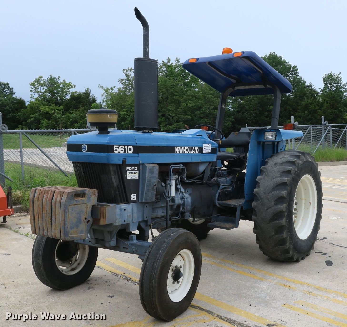 Purple Wave is selling a used Tractor in Missouri. This item is a 1998 New Holland 5610 tractor with the following: 1,066 hours on meter, New Holland EA707106 four cylinder engine, Manual transmission, 8F-8R gears, Differential lock, ROPS canopy, Three point, Top link, 540 PTO, (2) rear hydraulic remotes, (8) suitcase weights, 7.50-16SL front tires, 16.9-30 calcium filled rear tires, Serial 308493M