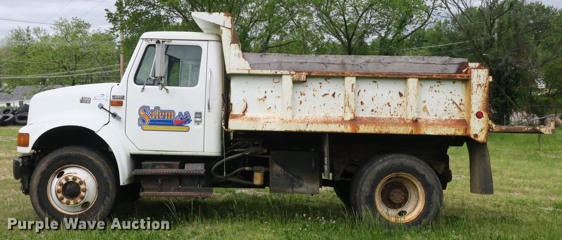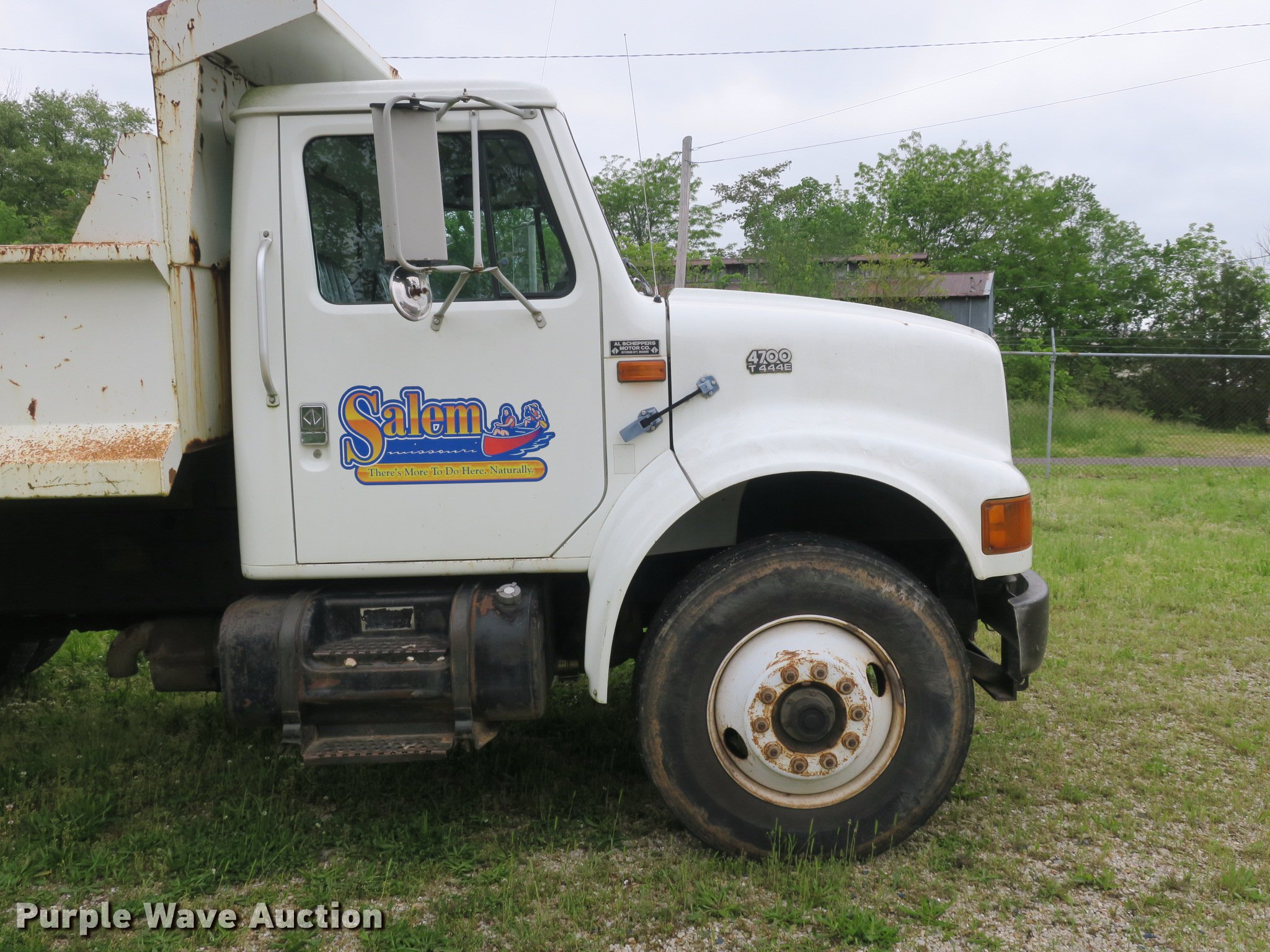 Purple Wave is selling a used Construction Dump Truck in Missouri. This item is a 1998 International 4700 dump truck with the following: 81,557 miles on odometer, International T444 7.3L V8 diesel engine, Automatic transmission, Single axles, Heat, Cruise, PTO, Heil steel dump bed, 10'L x 92"W, 24" side height, 12" side board height, Single ram hoist, Manual operated end gate, Single fuel tank, 152" wheelbase, Spring suspension, Hydraulic brakes, 11R22.5 tires, Dump bed frame cracked, Fender cracked, Decals will be removed prior to auction