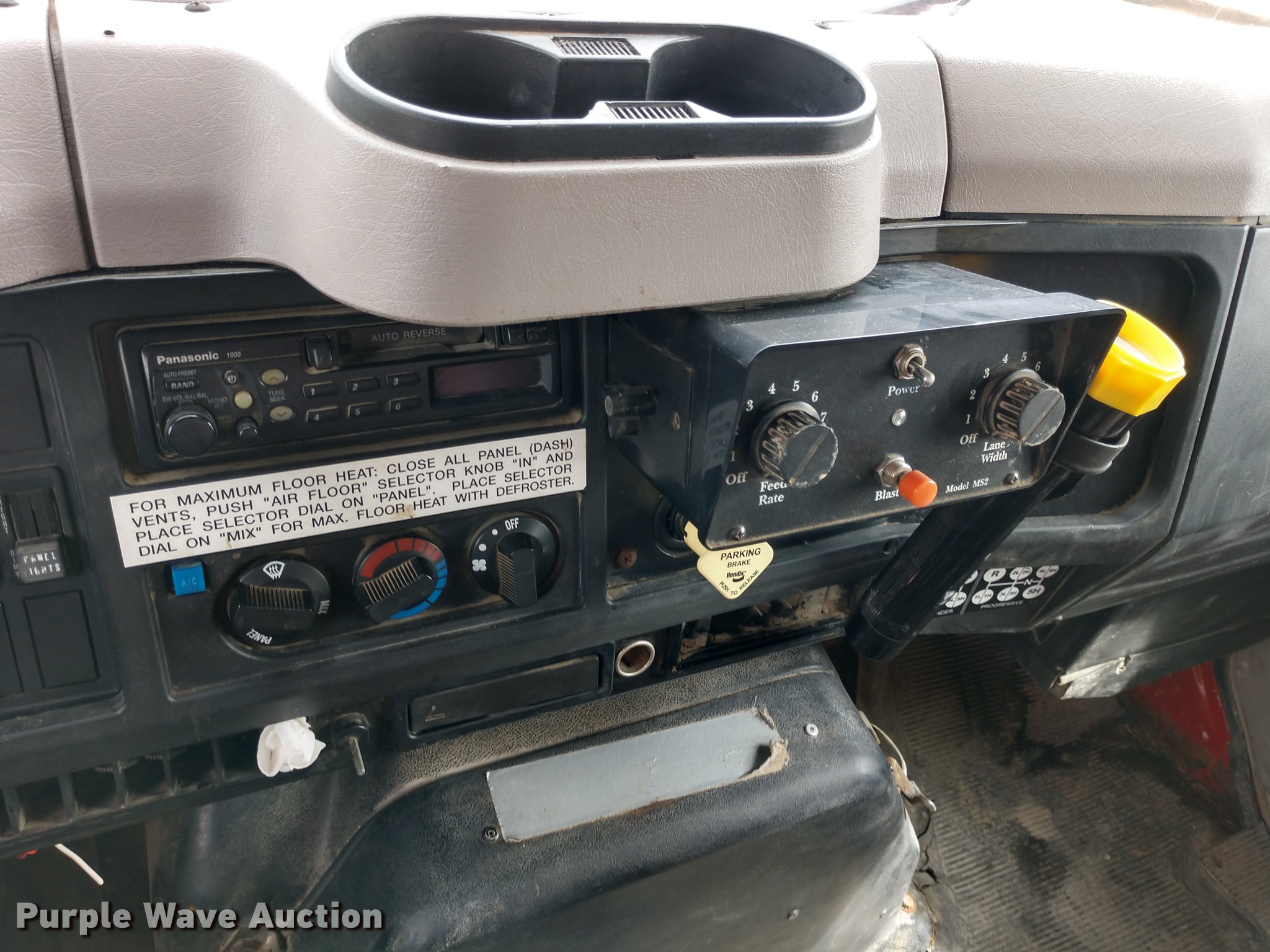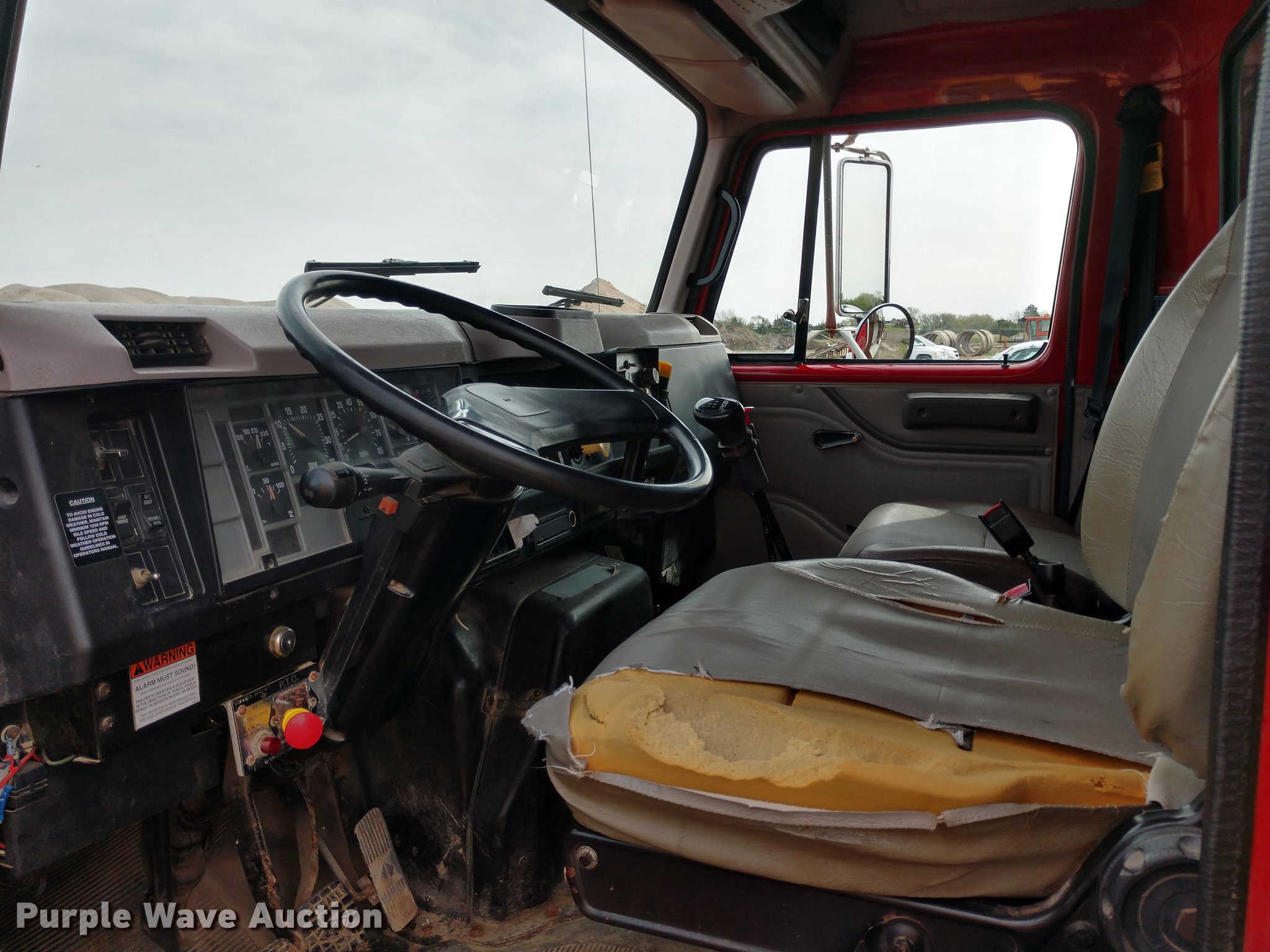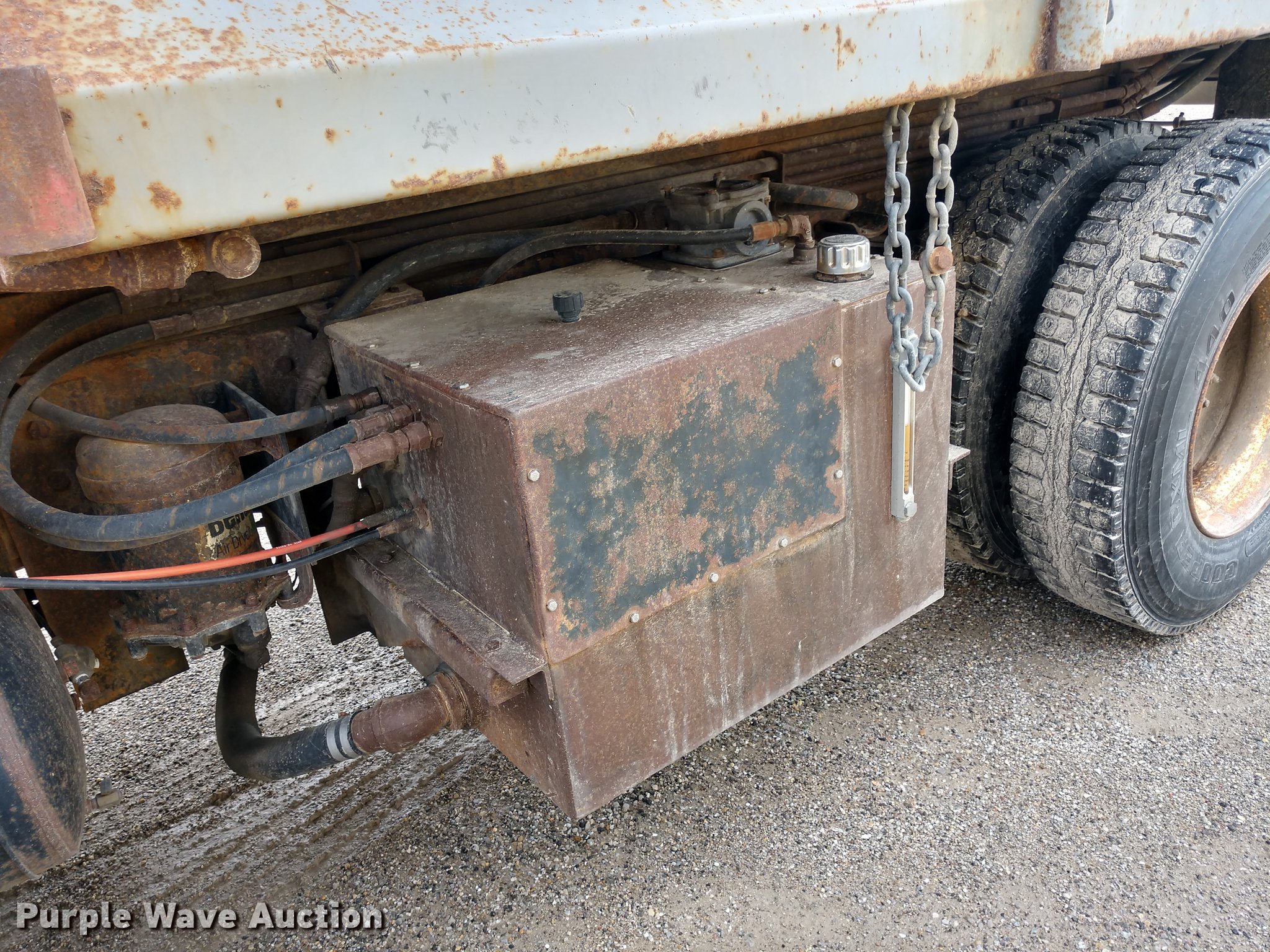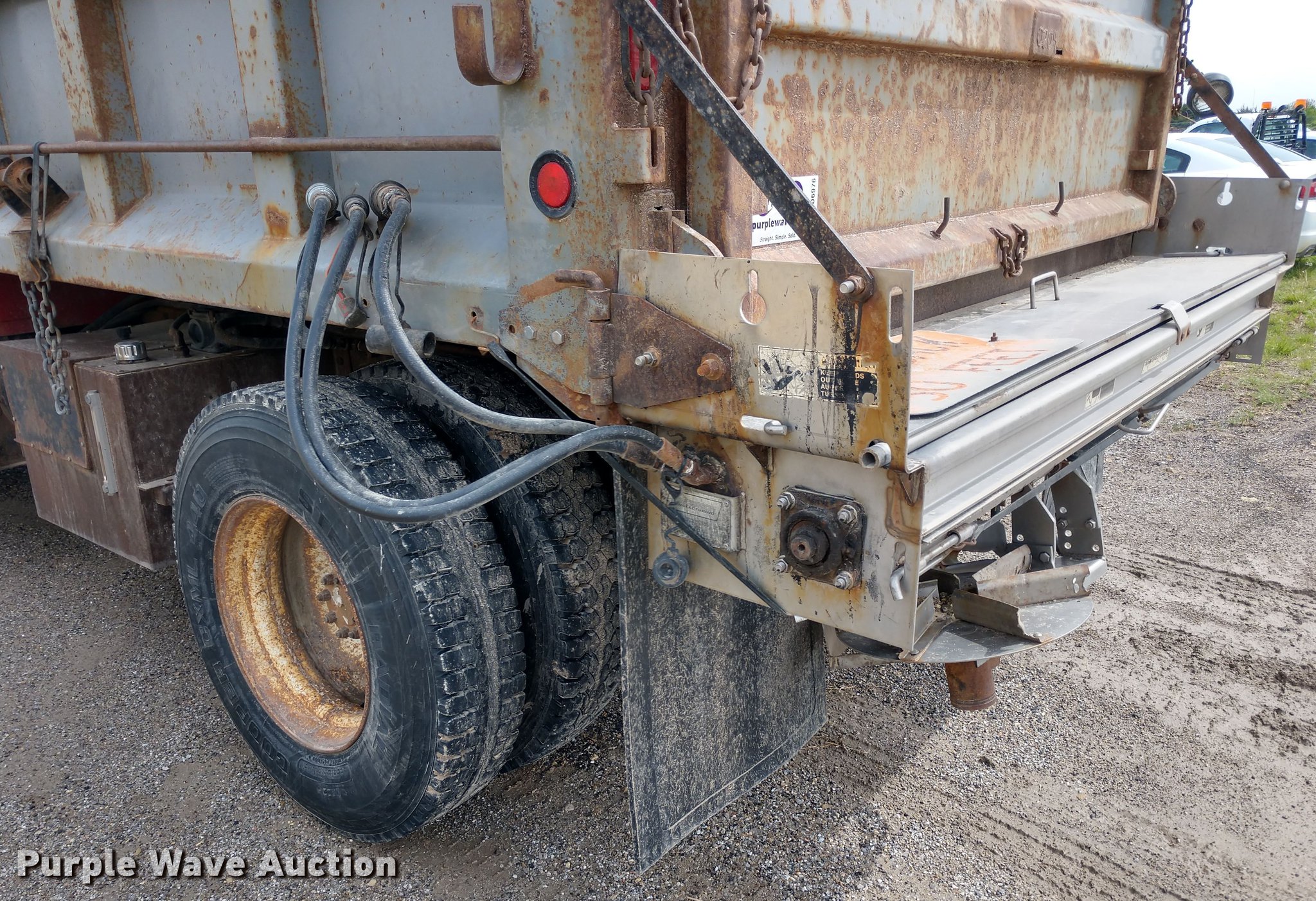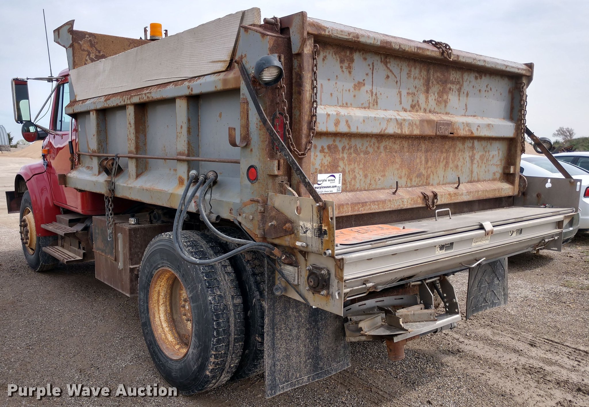 1999 International 4700 dump truck. 108,301 miles on odometer Miles may vary, still in use, International DT466E 7.6L L6 diesel engine, Five speed manual transmission, Two speed rear end, Single axle, AC and heat, Cruise, Air suspension seat, PTO, Steel dump bed Single ram hoist, Air operated end gate, Henderson tailgate spreader, Spring suspension, Air brakes, 11R22.5 tires, Rear of frame cracked, Unit# 16520. Kansas title. 1HTSCAAN7XH591037. Butler County. El Dorado, KS 67042