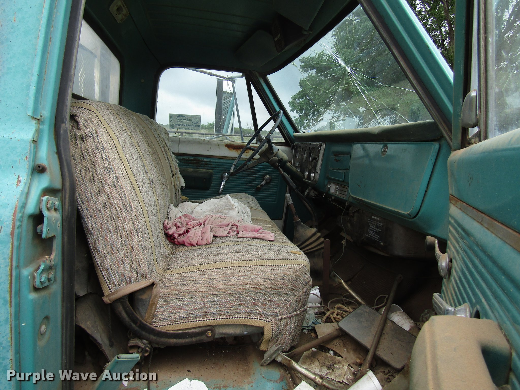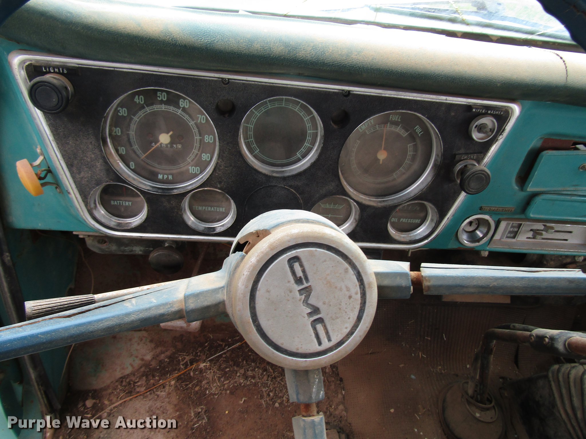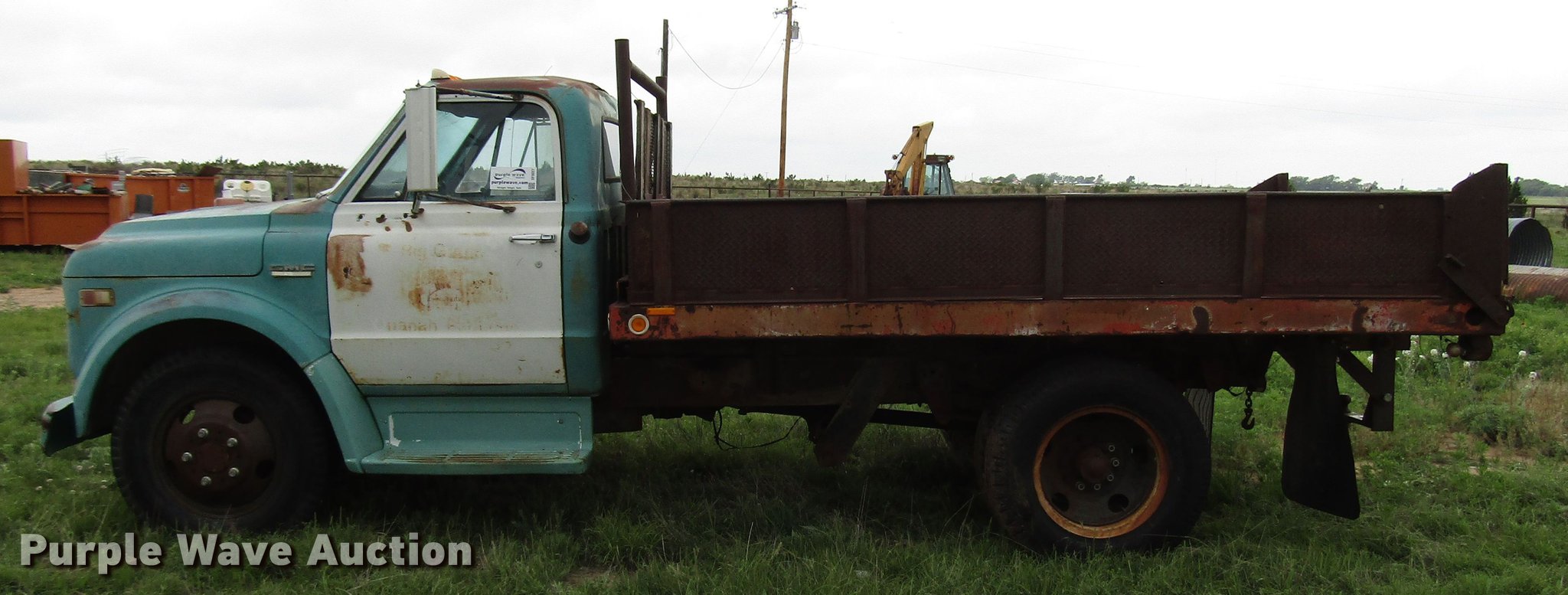 Purple Wave is selling a used Construction Dump Truck in Texas. This item is a 1970 GMC 5500 dump truck with the following: 43,813 miles on odometer, Eight cylinder gas engine, Four speed manual transmission, Two speed rear end, Single axle, Heat, 12'L x 8'W steel dump bed, 17" side height, Dual ram hoist, Single fuel tank, Spring suspension, Hydraulic brakes, 8.25-20 tires, GVWR 24,000 lbs, Cracked windshield, Non-operational unit