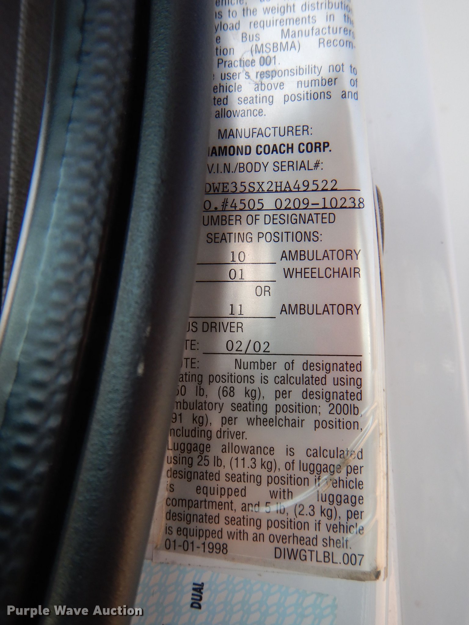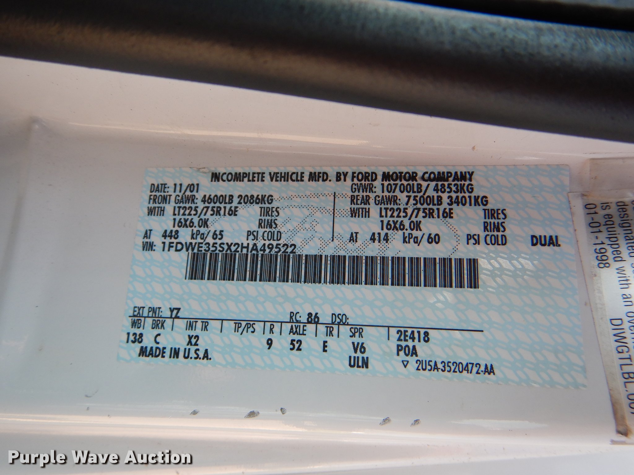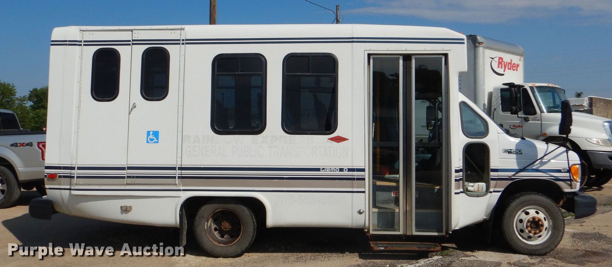 Purple Wave is selling a used 3/4 or 1 Ton Pickup or Van in Kansas. This item is a 2002 Ford Econoline E350 Super Duty shuttle bus with the following: 101,347 miles on odometer, 6.8L V10 SOHC 20V gas engine, Automatic transmission, Single axle, AC and heat, Heated mirrors, 12 passenger capacity, Child safety seat, Wheelchair lift, Spring suspension, Hydraulic brakes, 137" wheelbase, Hankook 225/75R16 tires, GVWR 10,700 lbs