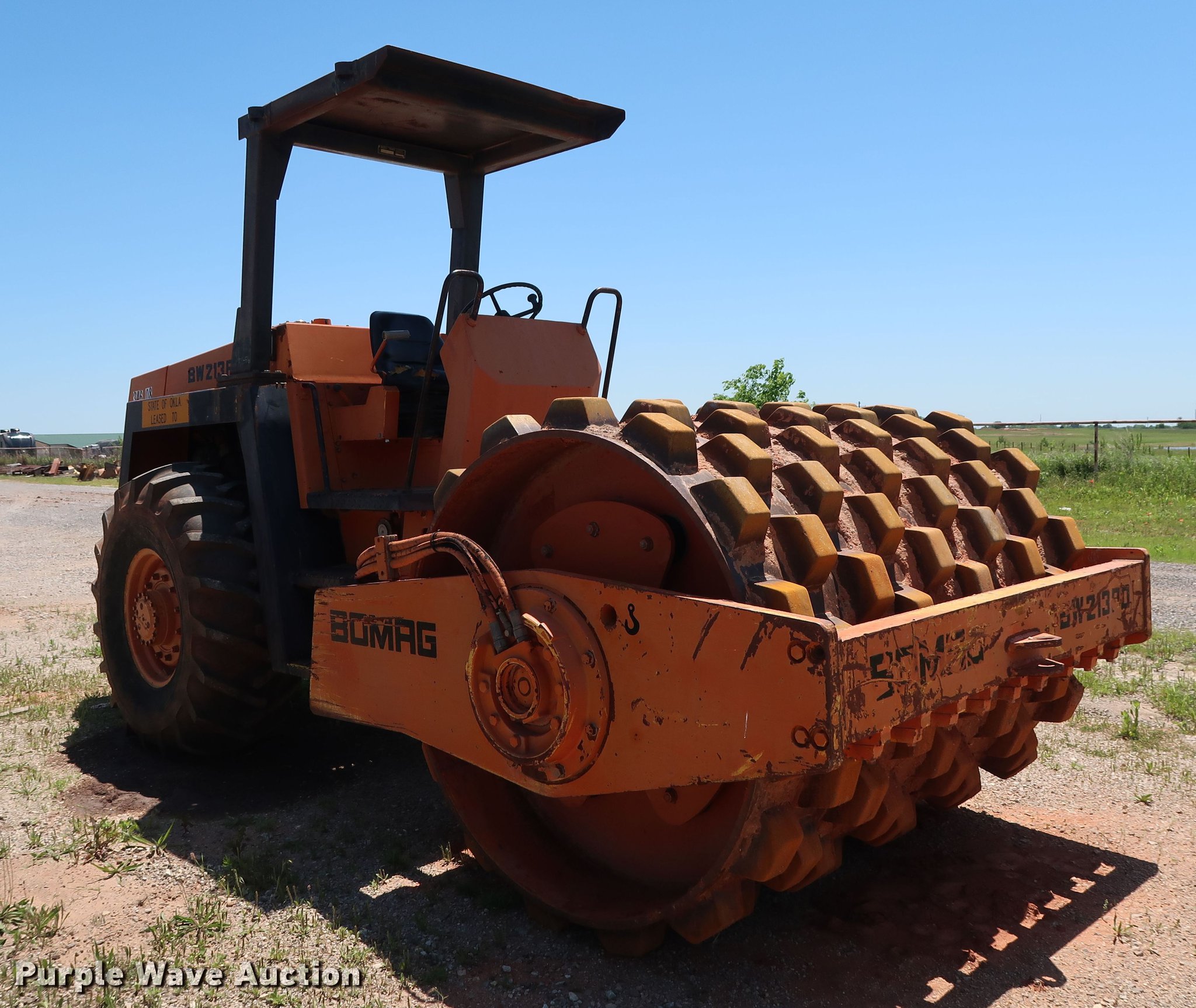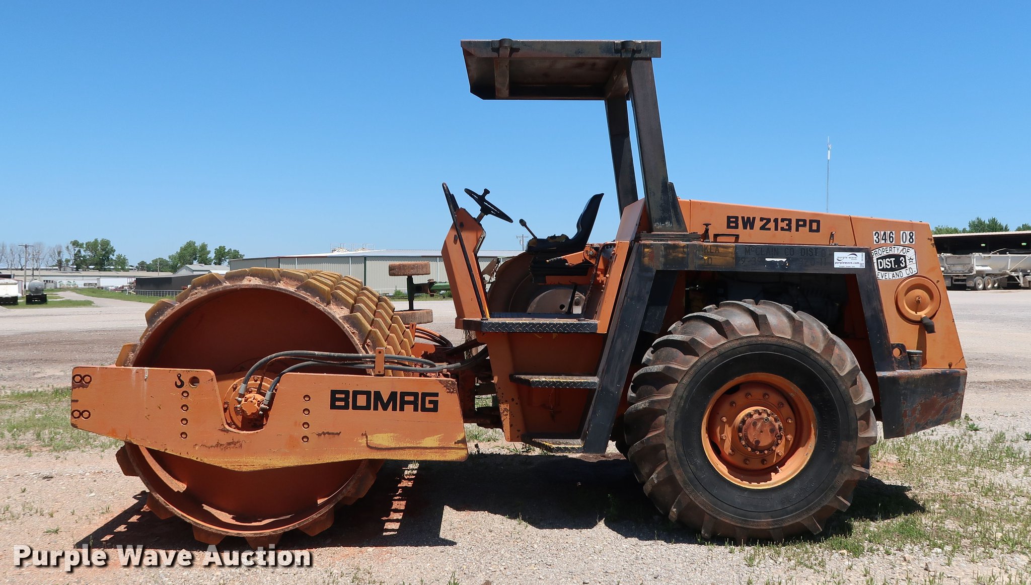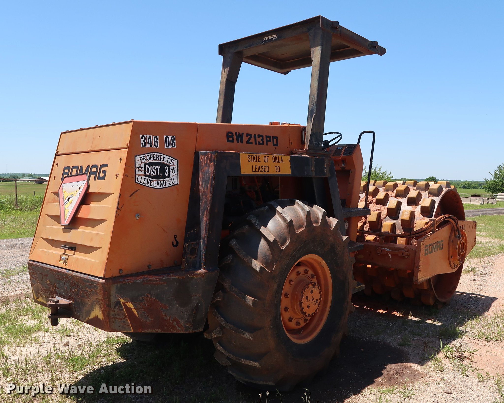 Purple Wave is selling a used Single Drum Roller Compactor in Oklahoma. This item is a Bomag BW213PD single drum vibratory roller with the following: 2,448 hours on meter, Deutz BF6L913 six cylinder diesel engine, 150 HP, Serial 7404773, Hydrostatic transmission, Canopy, 84"W x 60" diameter padfoot drum, Single vibratory system, Front drum scraper, Akuret 23.1-26 tires, Engine replaced April 2018, Serial 400115152, Unit# 316-08
