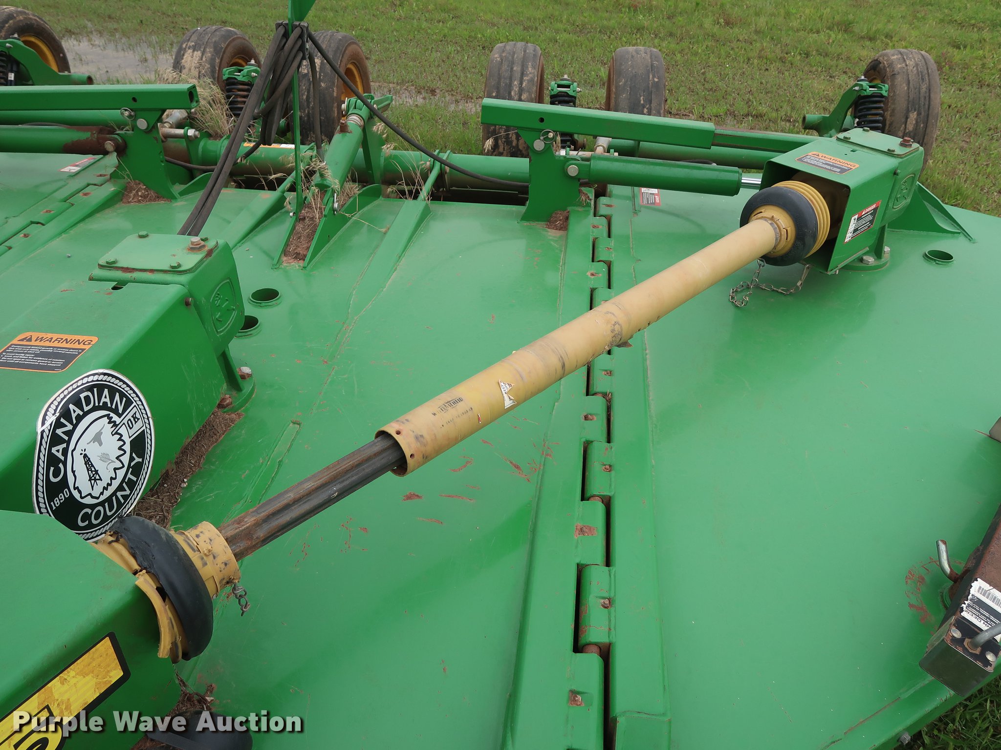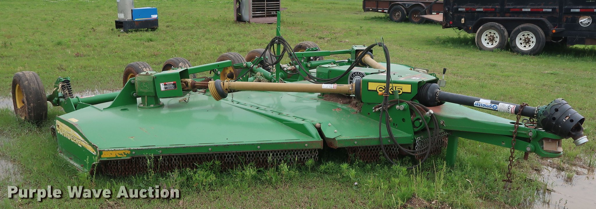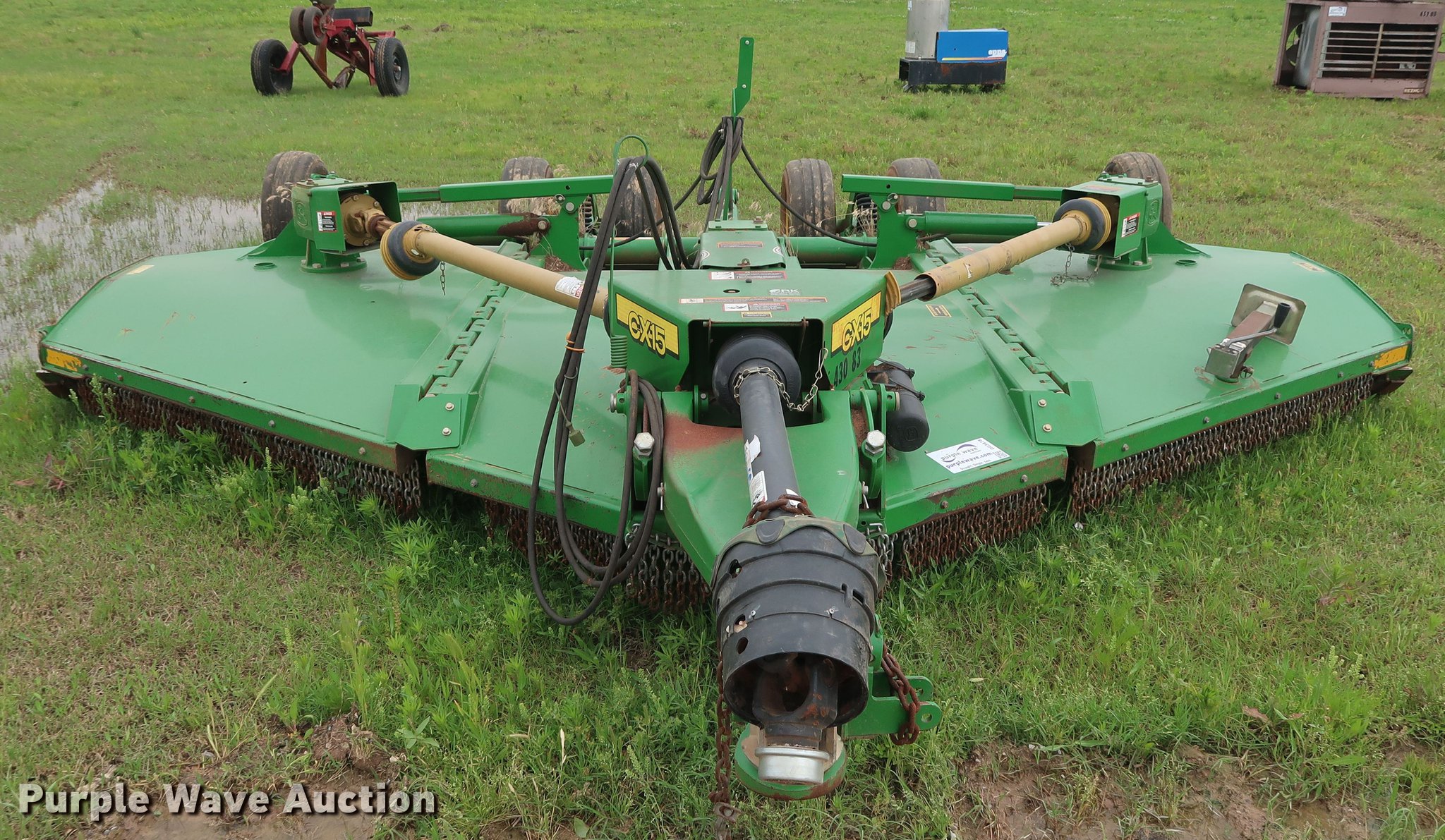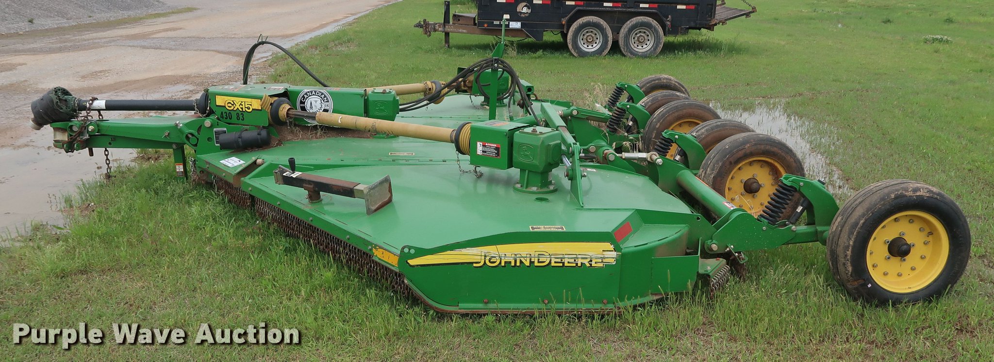 Purple Wave is selling a used Mower, Cutter, Shredder in Oklahoma. This item is a 2015 John Deere CX15 batwing rotary mower with the following: 15'W, Hydraulic lift and fold, Safety chains, 540 PTO, Pin hitch, Jack stand, Super Grip 26x9-14.5 tires, Serial 1P0CX15EJFP037399, Unit# 430-83