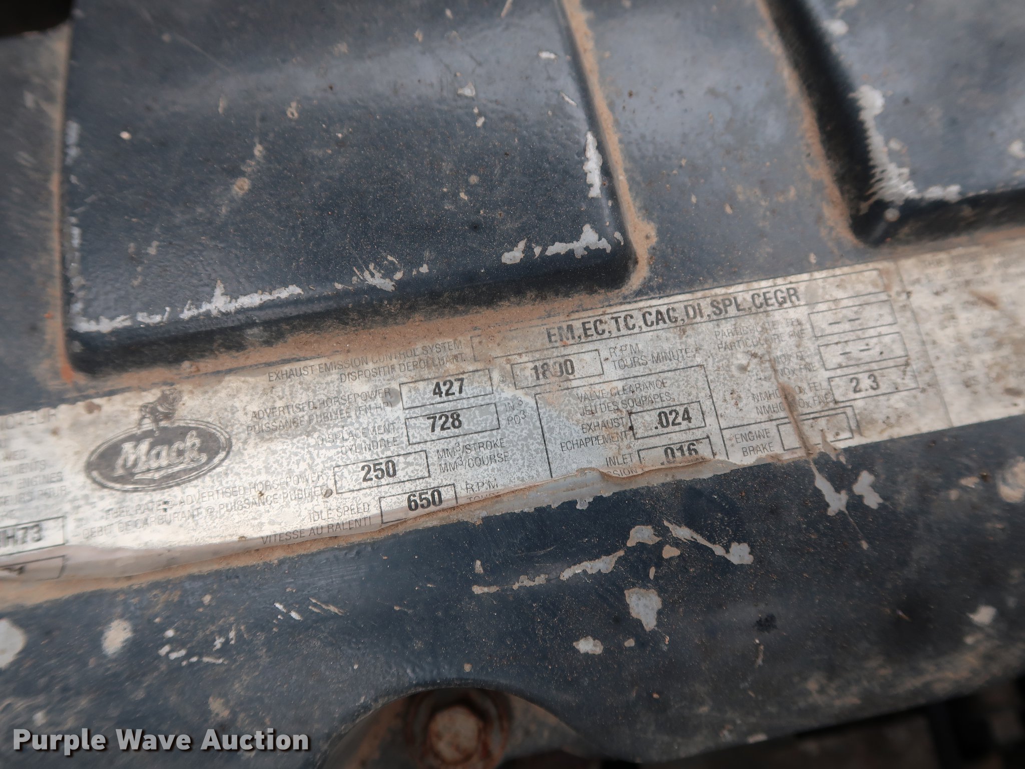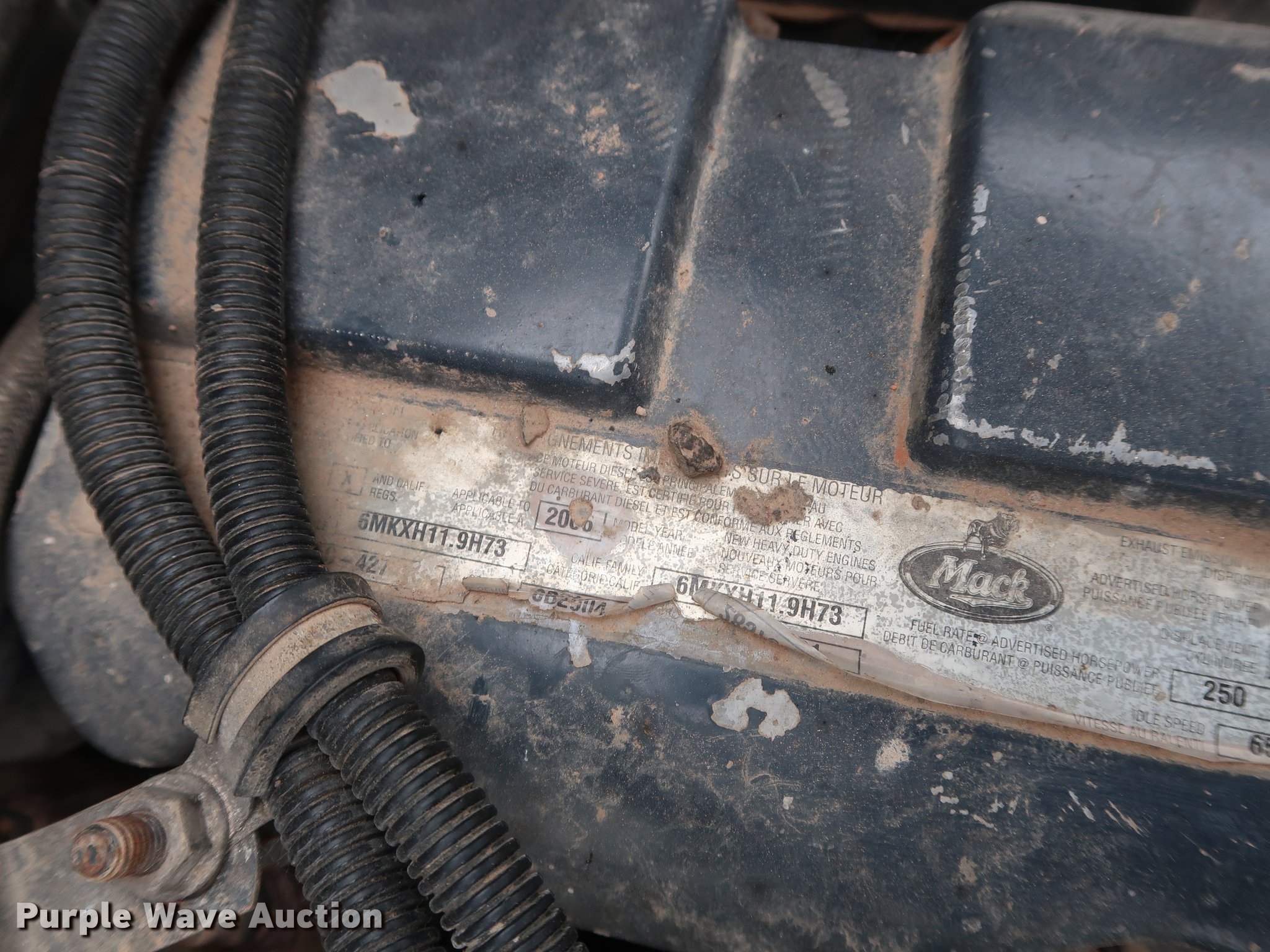 Purple Wave is selling a used Construction Dump Truck in Oklahoma. This item is a 2007 Mack CHN613 dump truck with the following: 231,414 miles on odometer, 9,398 hours on meter, Mack AC 12.0L L6 diesel engine, 427 HP, Serial SB291124, Eaton Fuller 13 speed manual transmission, Tandem axle, Inter-axle differential lock, AC and heat, Cruise, Heated mirrors, PTO, Ox Bodies steel dump bed, 15'L x 96"W, 42" side height, 12" side board height, 14 yd. struck capacity, 16 yd. heaped capacity, Roll tarp, Single ram hoist, Air operated end gate, Dual fuel tanks, Camelback suspension, Air brakes, 11R24.5 tires, Driveline has been disconnected, Engine issues, Unit# 302-145
