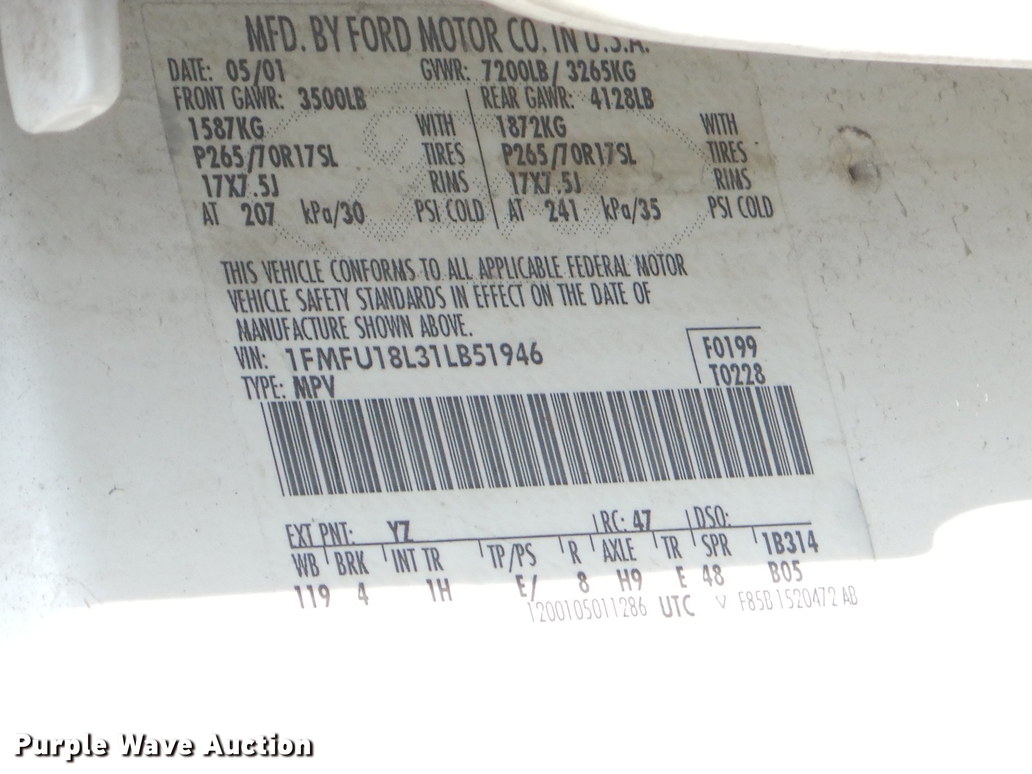 Purple Wave is selling a used Passenger Vehicle in Oklahoma. This item is a 2001 Ford Expedition SUV with the following: 190,588 miles on odometer, 5.4L V8 SOHC 16V gas engine, Automatic transmission, Four wheel drive, AC and heat, Cruise, Power windows and locks, Power sunroof, 265/70R17 tires, Unknown operating condition
