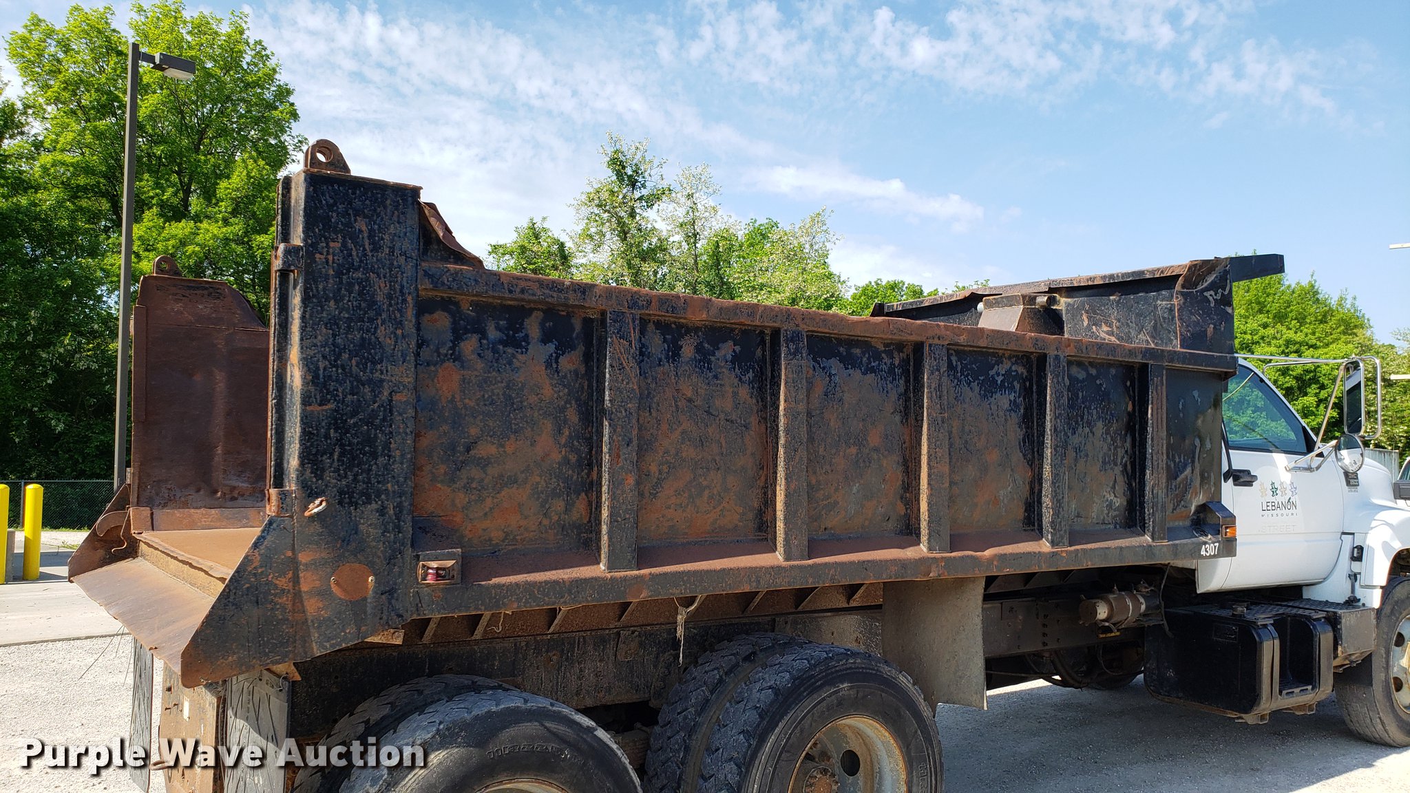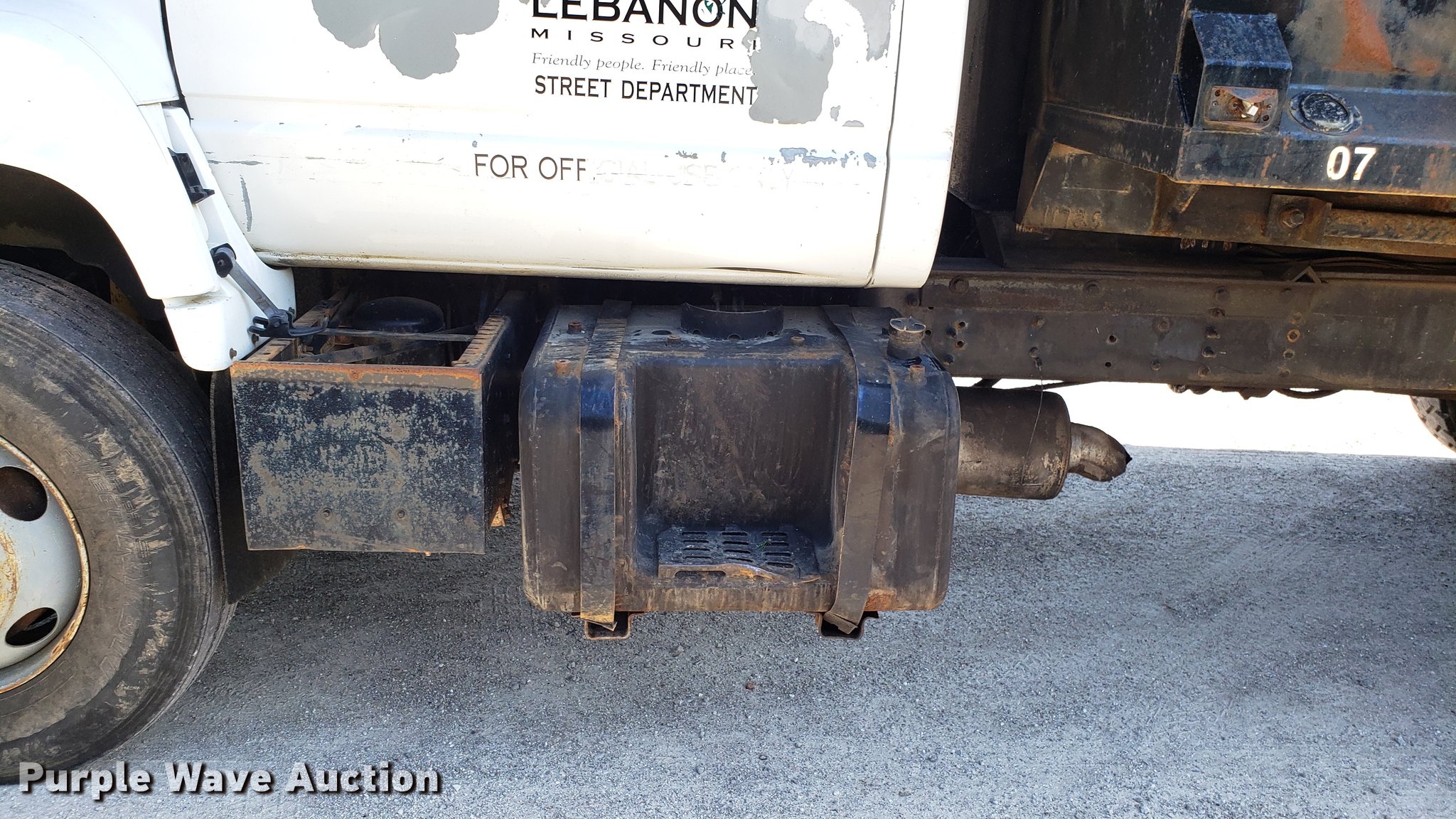2002 GMC C8500 dump truck. 234,202 miles on odometer, 17,274 hours on meter, Caterpillar 3126 7.2L six cylinder diesel engine, Eaton Fuller nine speed manual transmission, Heat, PTO, 15'L x 8'W steel dump bed 36" side height, Single ram hoist, Air operated end gate, 10'W snow plow, Single fuel tank, Spring over walking beam suspension, Air brakes, 11R22.5 tires, Check engine light on, Fuel tank has a rust hole, leaks diesel fuel. Missouri title. 1GDS7H4C12J510700. City of Lebanon. Lebanon, MO 65536