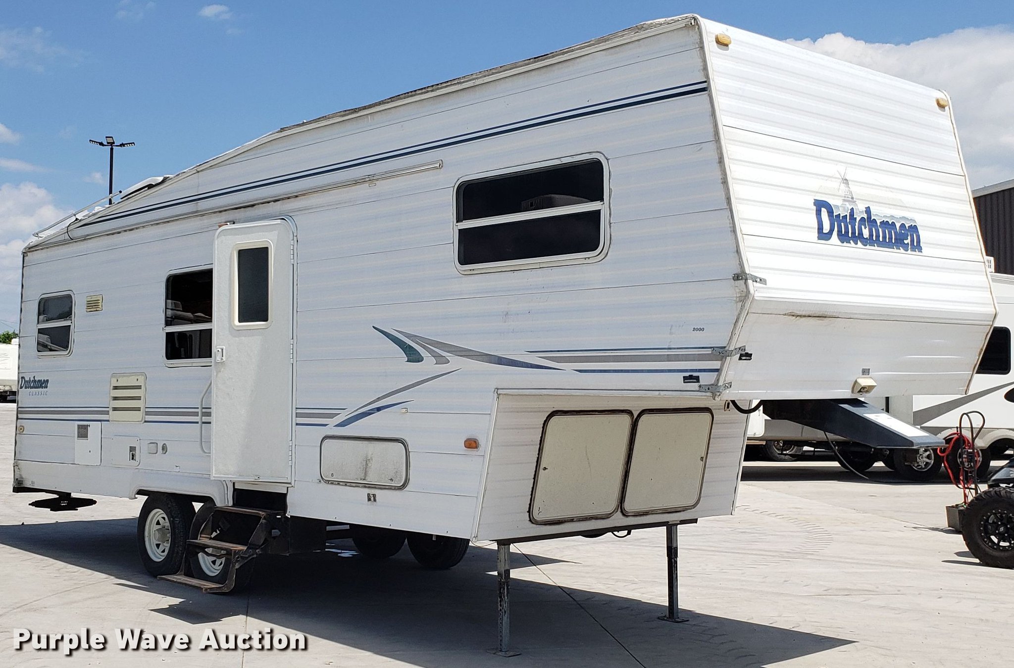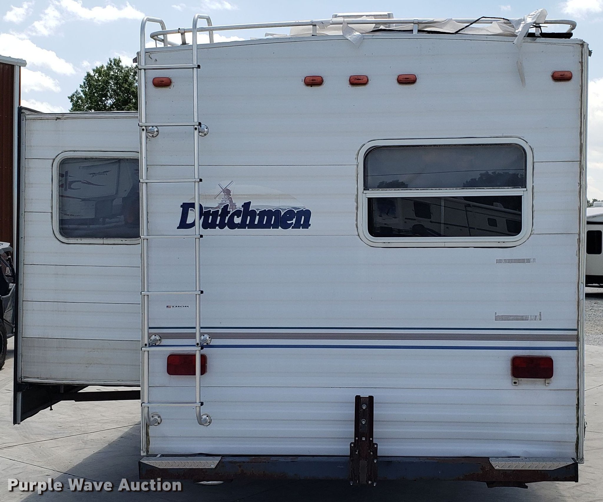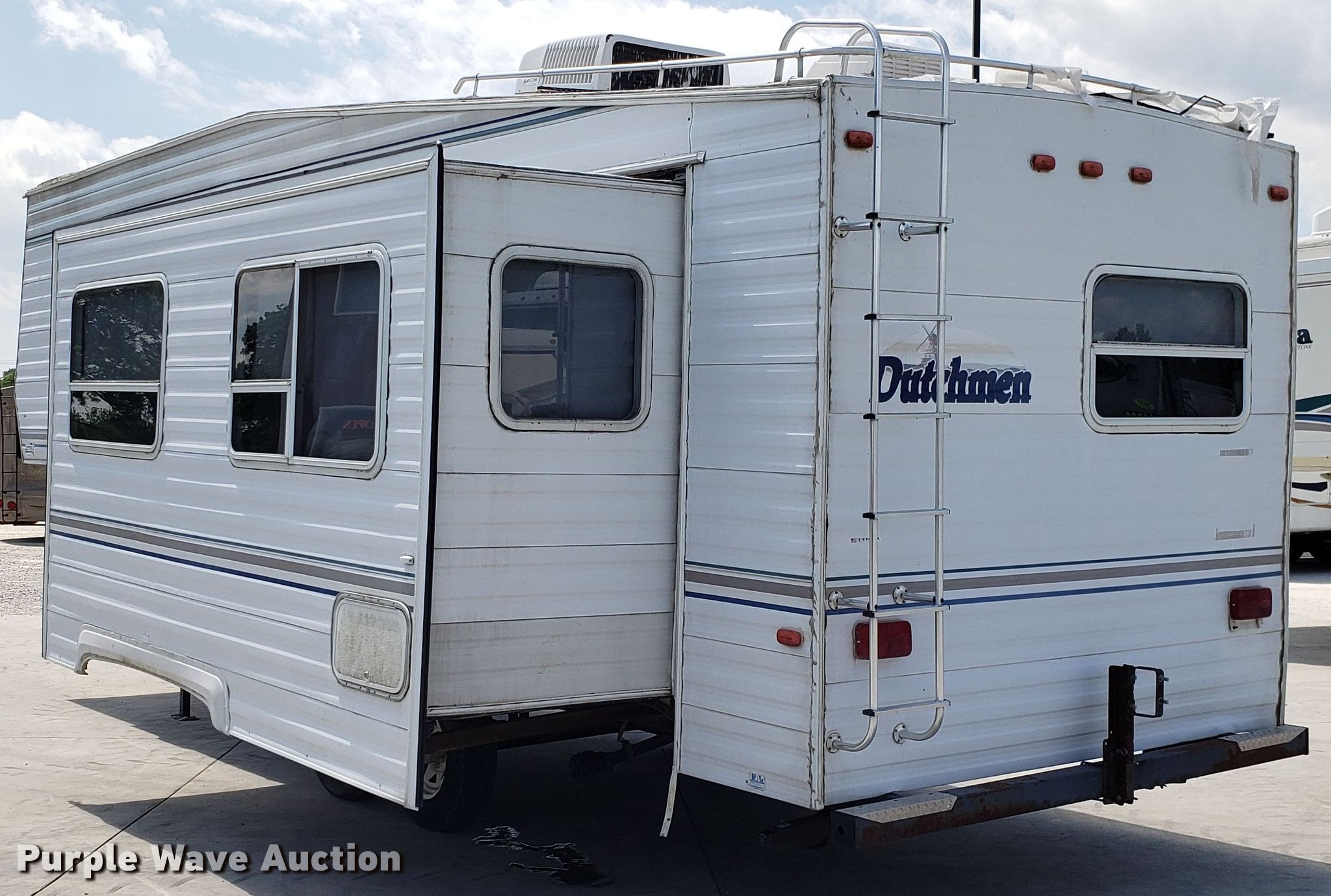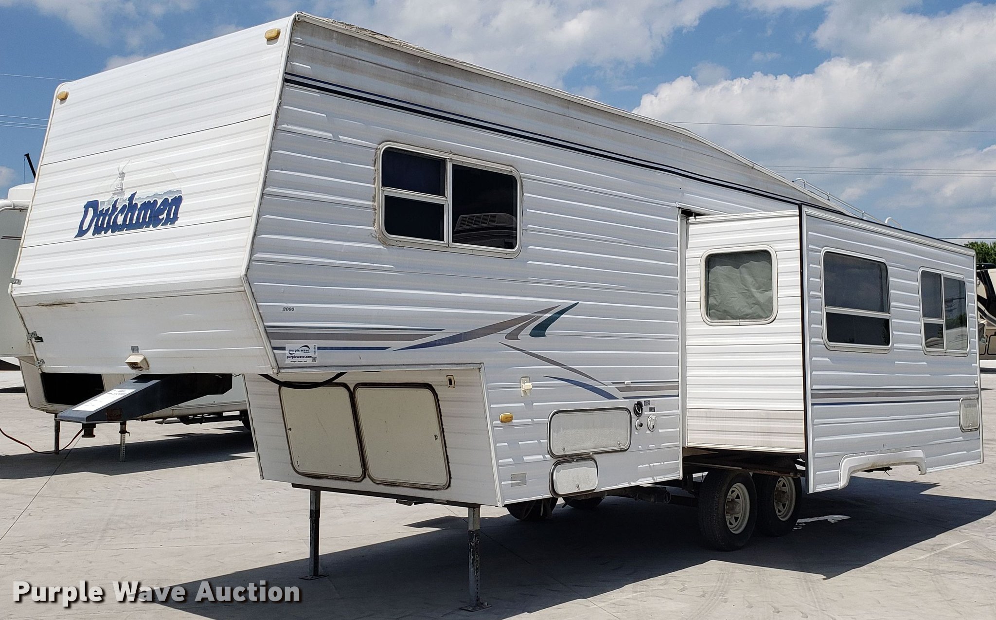 Purple Wave is selling a used RV in Missouri. This item is a 2000 Dutchman camper with the following: 28'L, Slide-out, Kitchen, Sink, Refrigerator/freezer, Oven, Propane stove, Bathroom, Spring suspension, Electric brakes, Tandem axle, 225/75R15 tires, Roof/water damage, Unknown operating condition of appliances and accessories