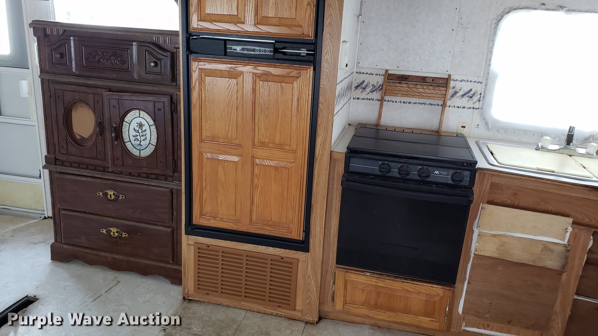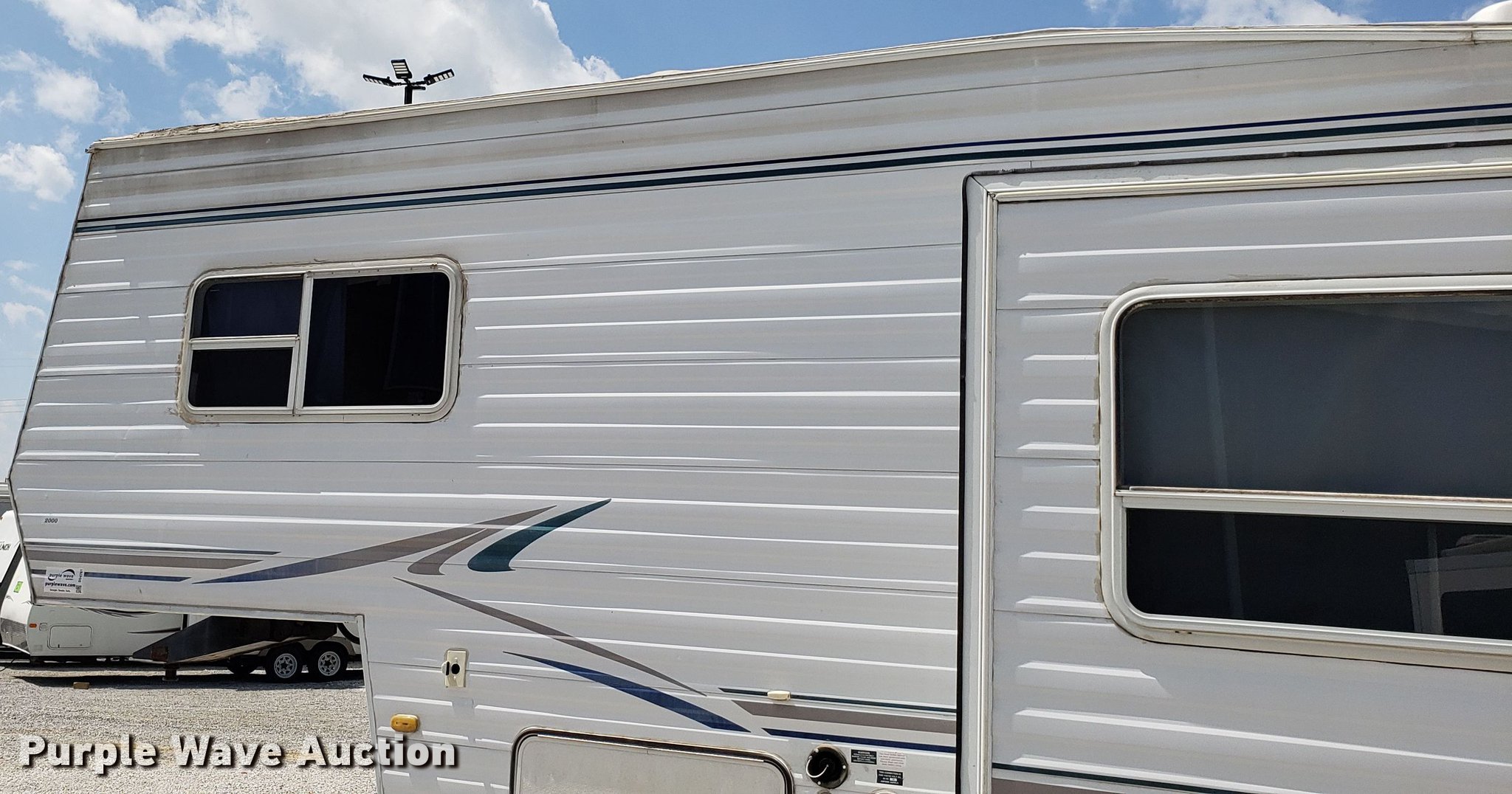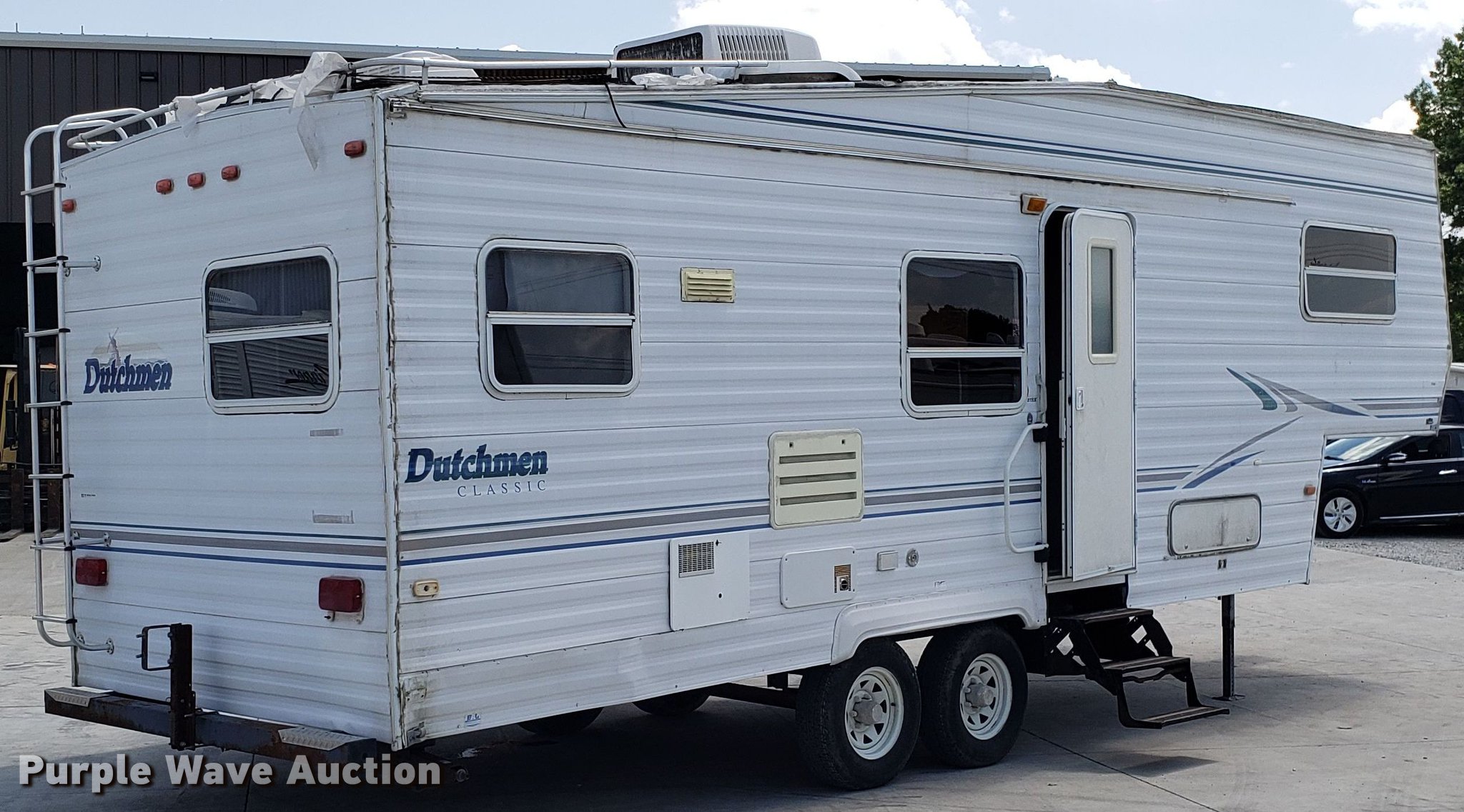 Purple Wave is selling a used RV in Missouri. This item is a 2000 Dutchman camper with the following: 28'L, Slide-out, Kitchen, Sink, Refrigerator/freezer, Oven, Propane stove, Bathroom, Spring suspension, Electric brakes, Tandem axle, 225/75R15 tires, Roof/water damage, Unknown operating condition of appliances and accessories