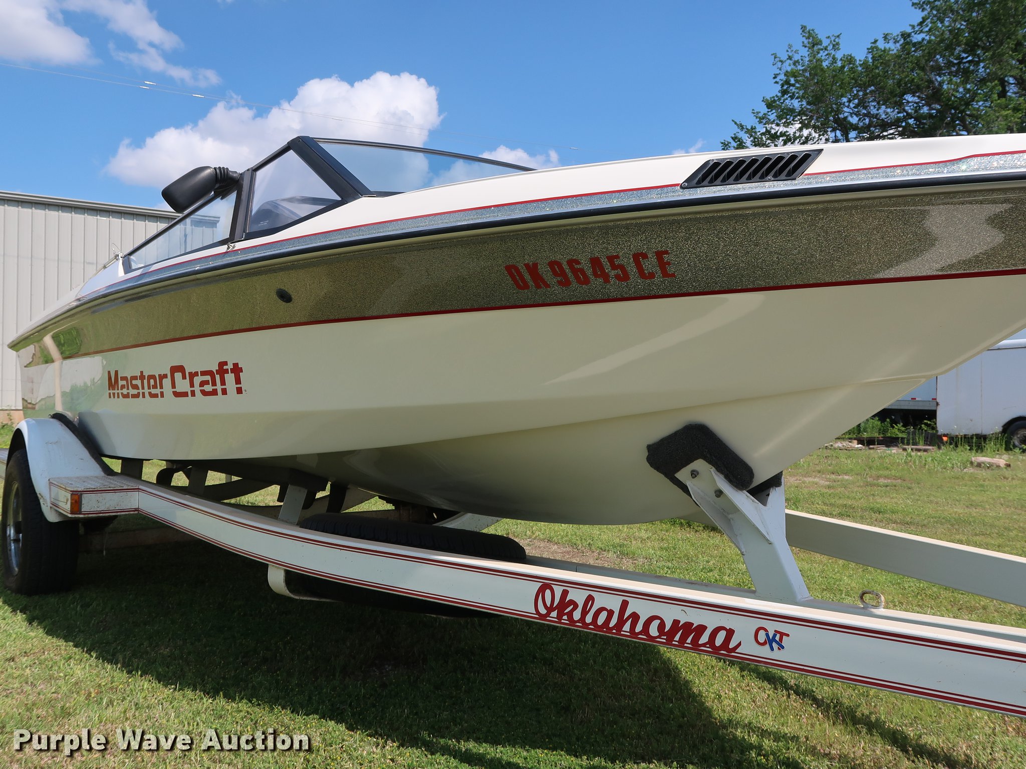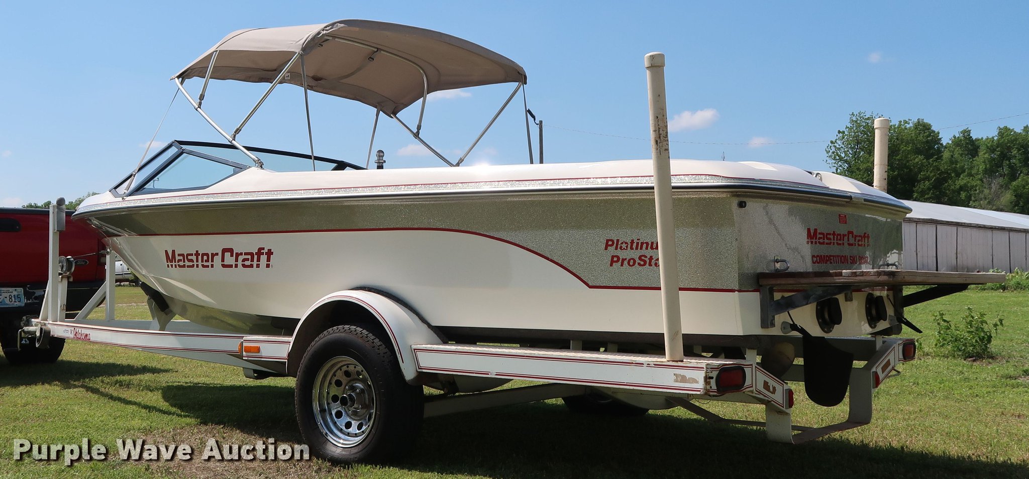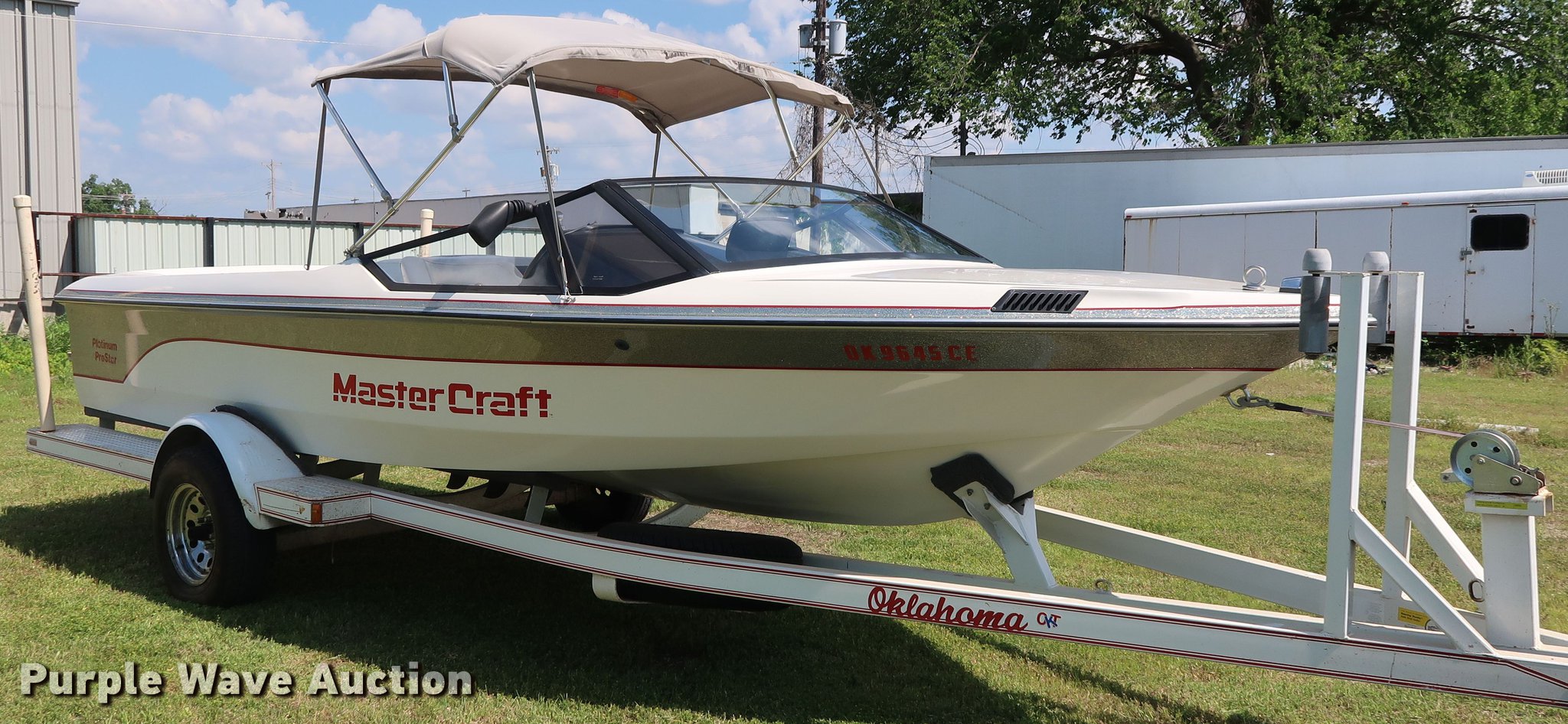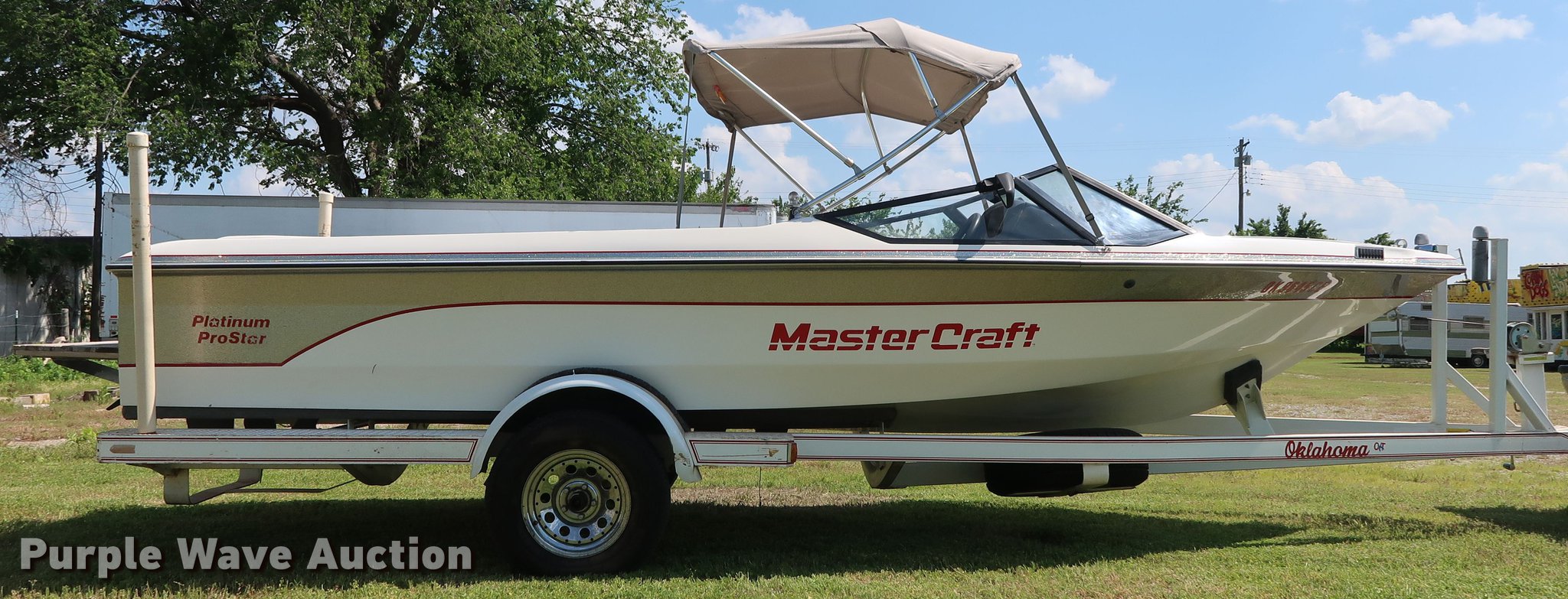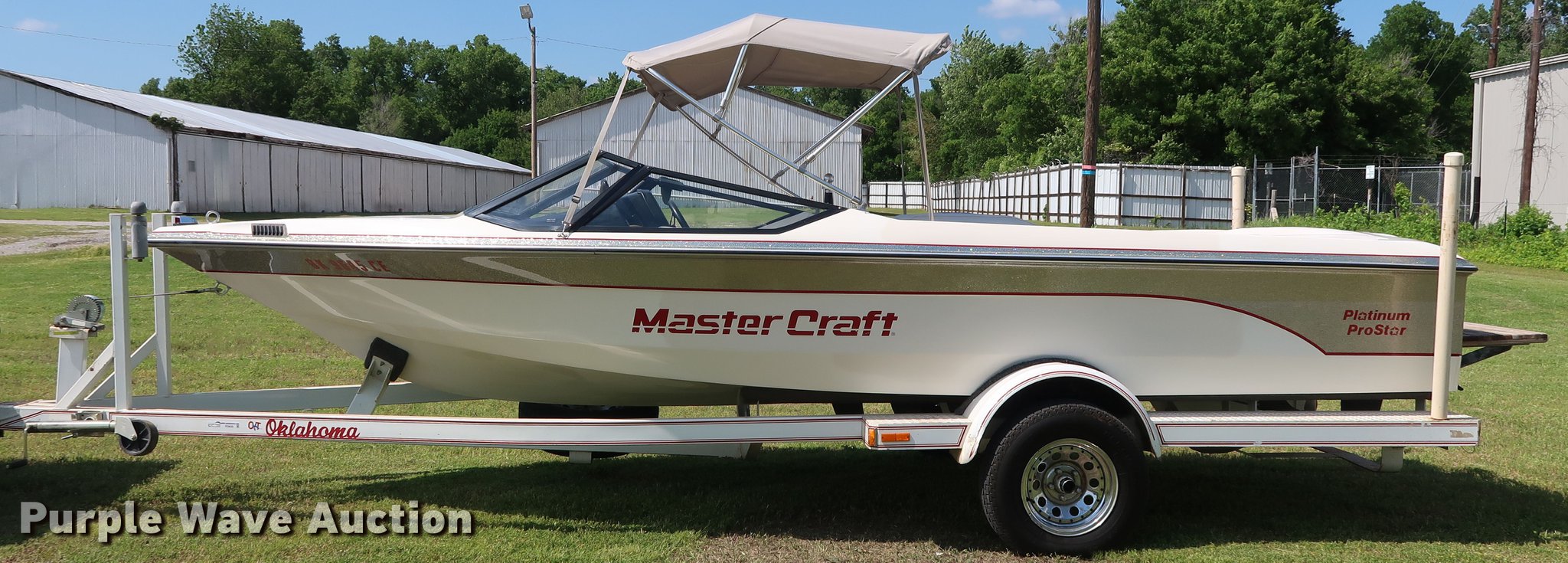 Purple Wave is selling a used Boat in Oklahoma. This item is a 1988 Mastercraft Platinum Prostar 190 20th Anniversary boat with the following: 349 hours on meter, Indmar 351 eight cylinder gas engine, 300 HP, Serial 1F-871962, 19'L, Eight person or 1,085 lbs capacity, Anchor, Sony 5.1 audio system, Sony Xplod AM/FM/CD, Bazooka tube subwoofer, Rear swim platform, Bimini top, Cover, Unit# 004 of 200 manufactured, Hull ID MBCPAAE5G788, Trailer, 21'L, 2" ball hitch, Jack stand, Winch, Single axle, Hercules ST205/75R14 tires