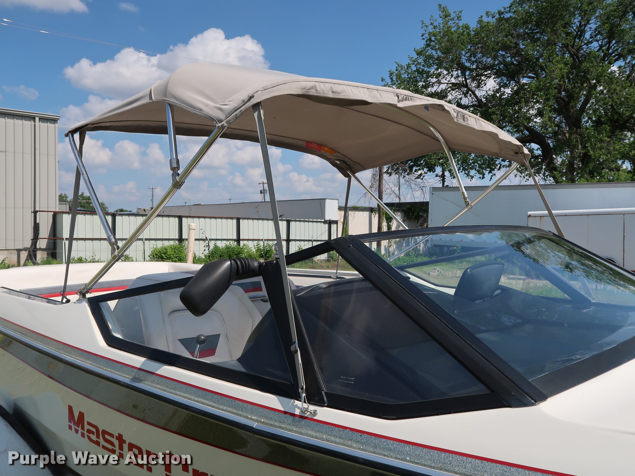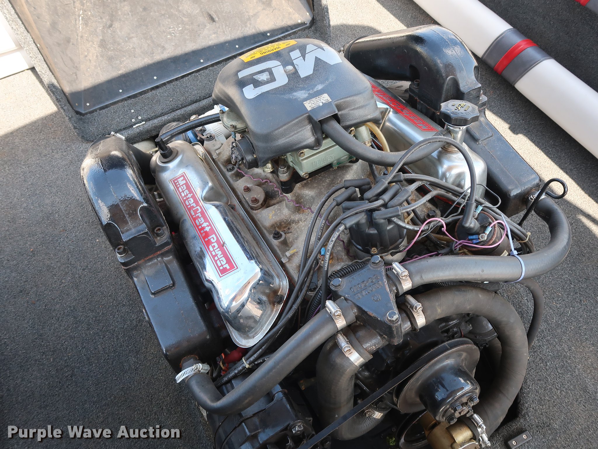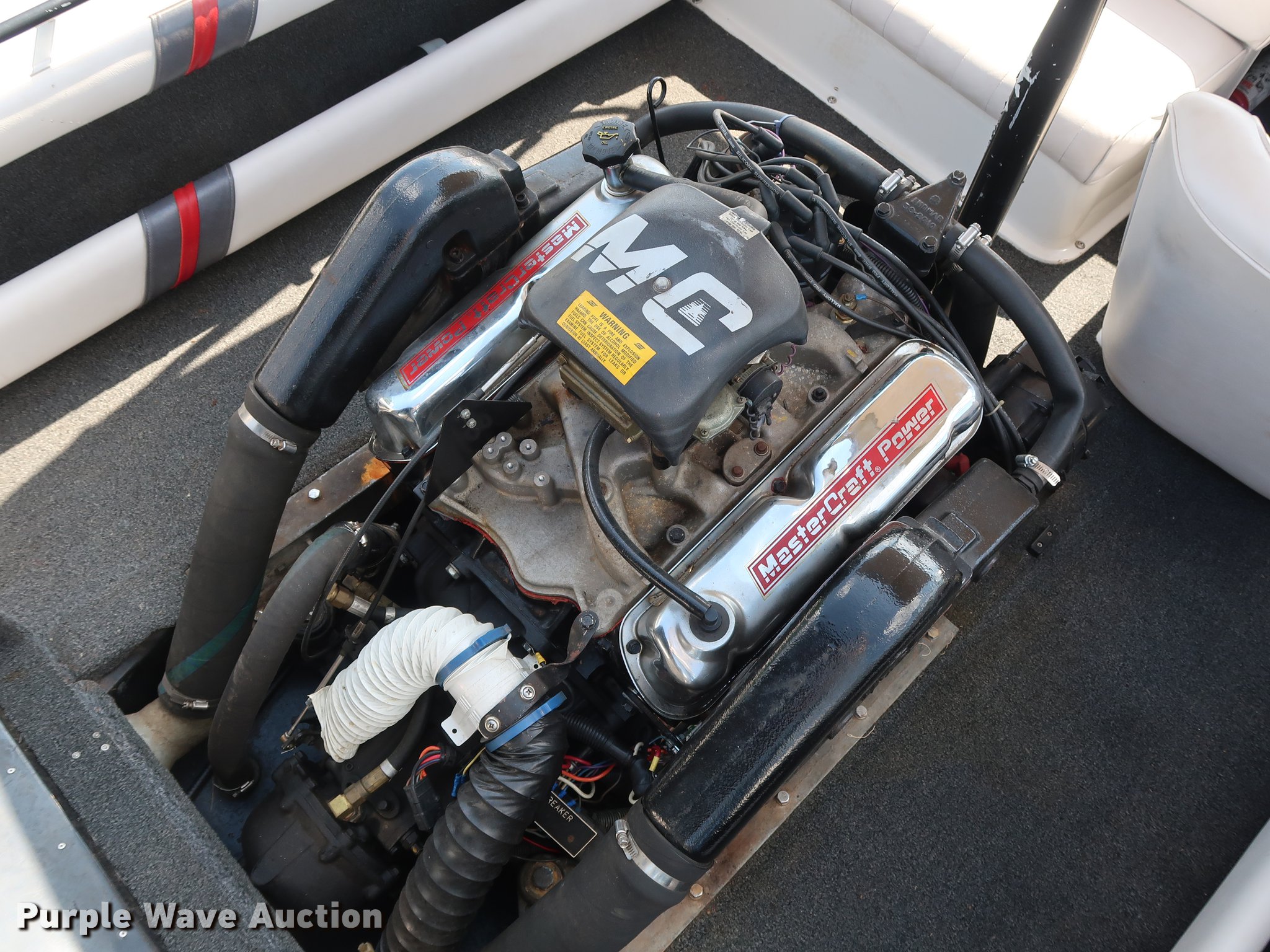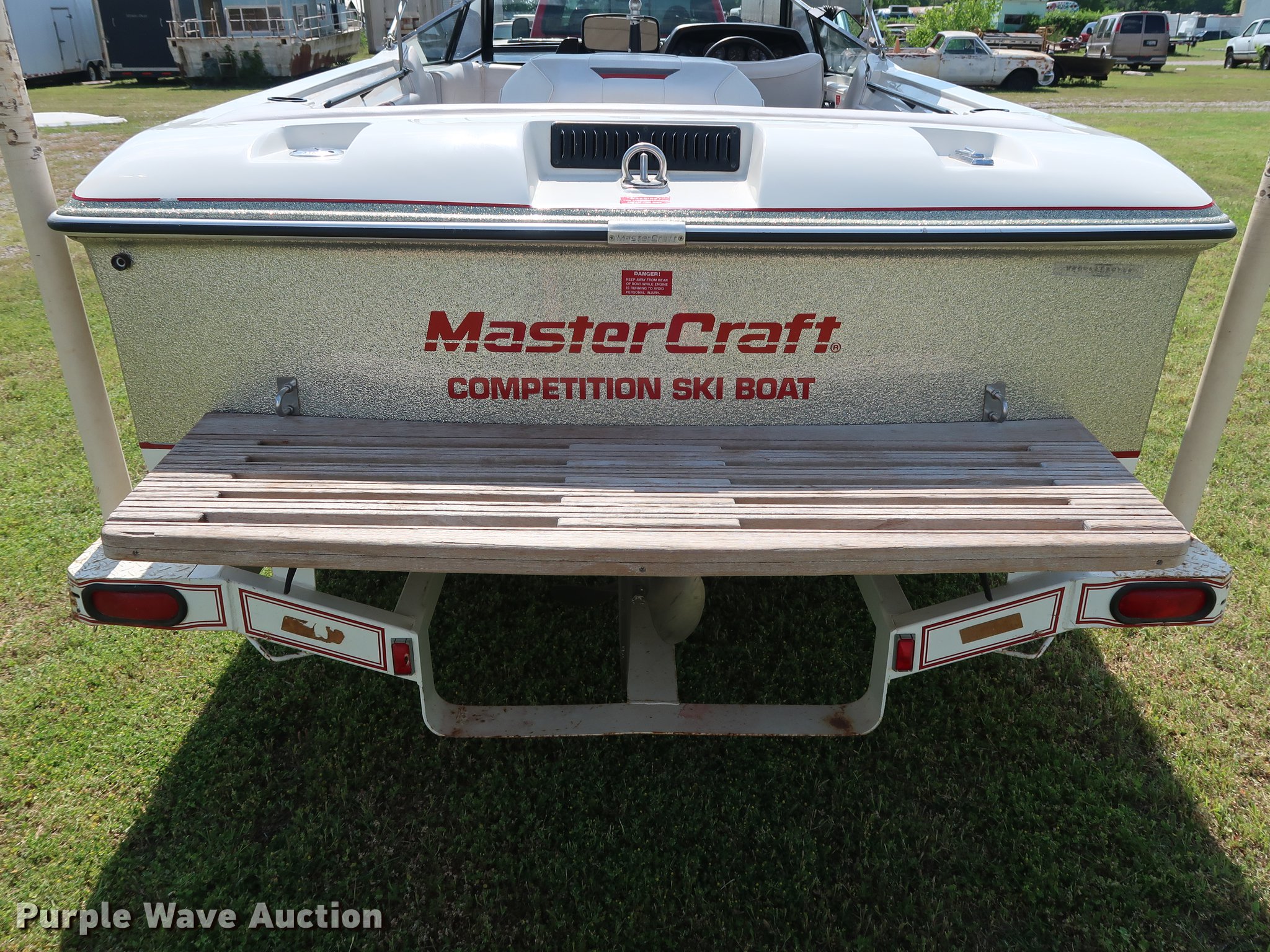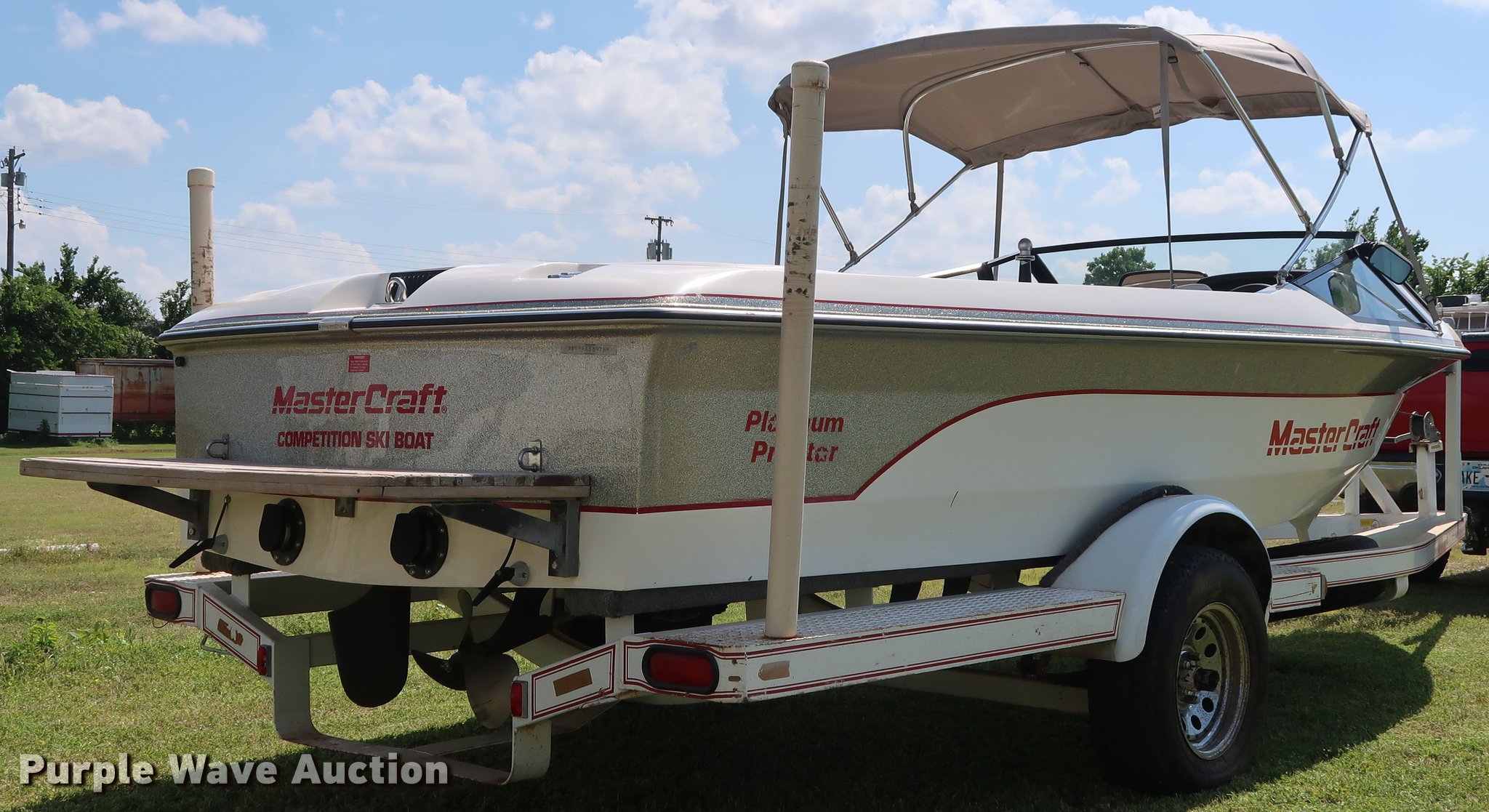 Purple Wave is selling a used Boat in Oklahoma. This item is a 1988 Mastercraft Platinum Prostar 190 20th Anniversary boat with the following: 349 hours on meter, Indmar 351 eight cylinder gas engine, 300 HP, Serial 1F-871962, 19'L, Eight person or 1,085 lbs capacity, Anchor, Sony 5.1 audio system, Sony Xplod AM/FM/CD, Bazooka tube subwoofer, Rear swim platform, Bimini top, Cover, Unit# 004 of 200 manufactured, Hull ID MBCPAAE5G788, Trailer, 21'L, 2" ball hitch, Jack stand, Winch, Single axle, Hercules ST205/75R14 tires
