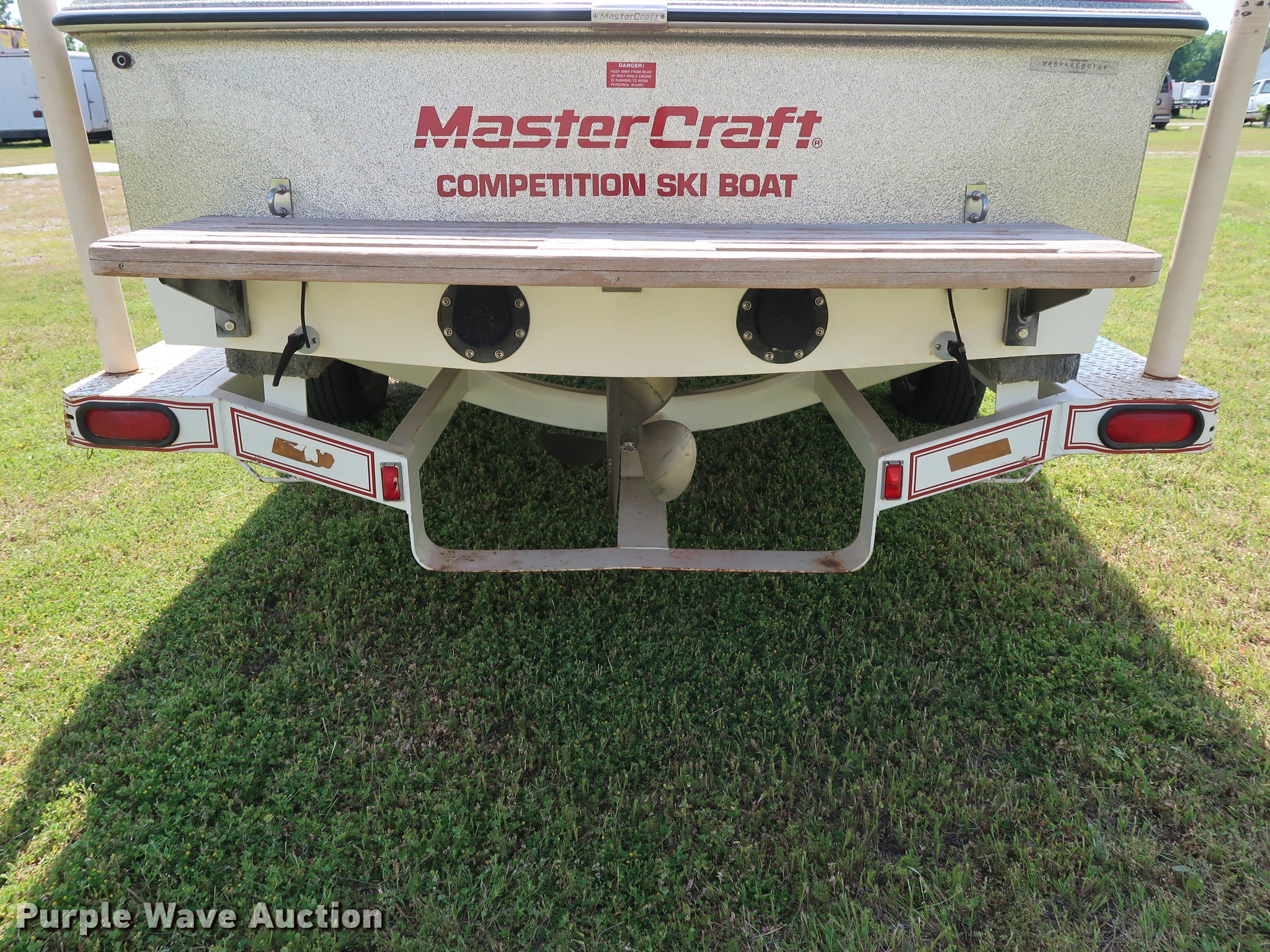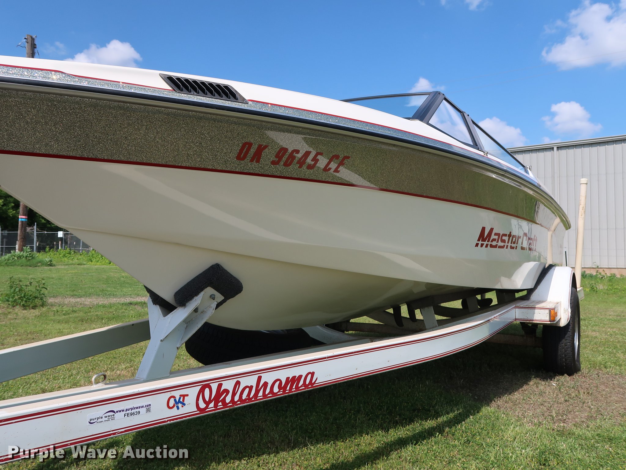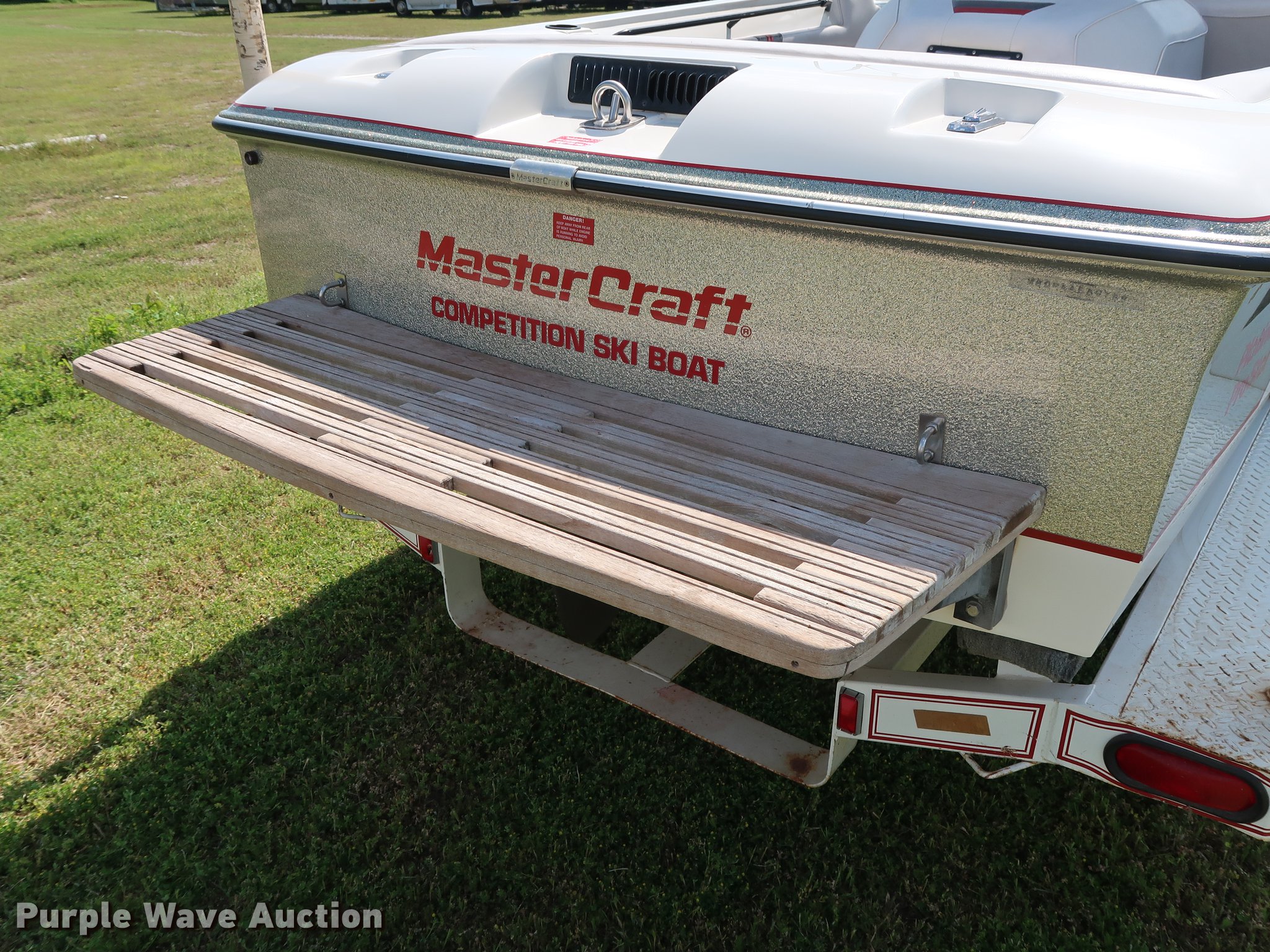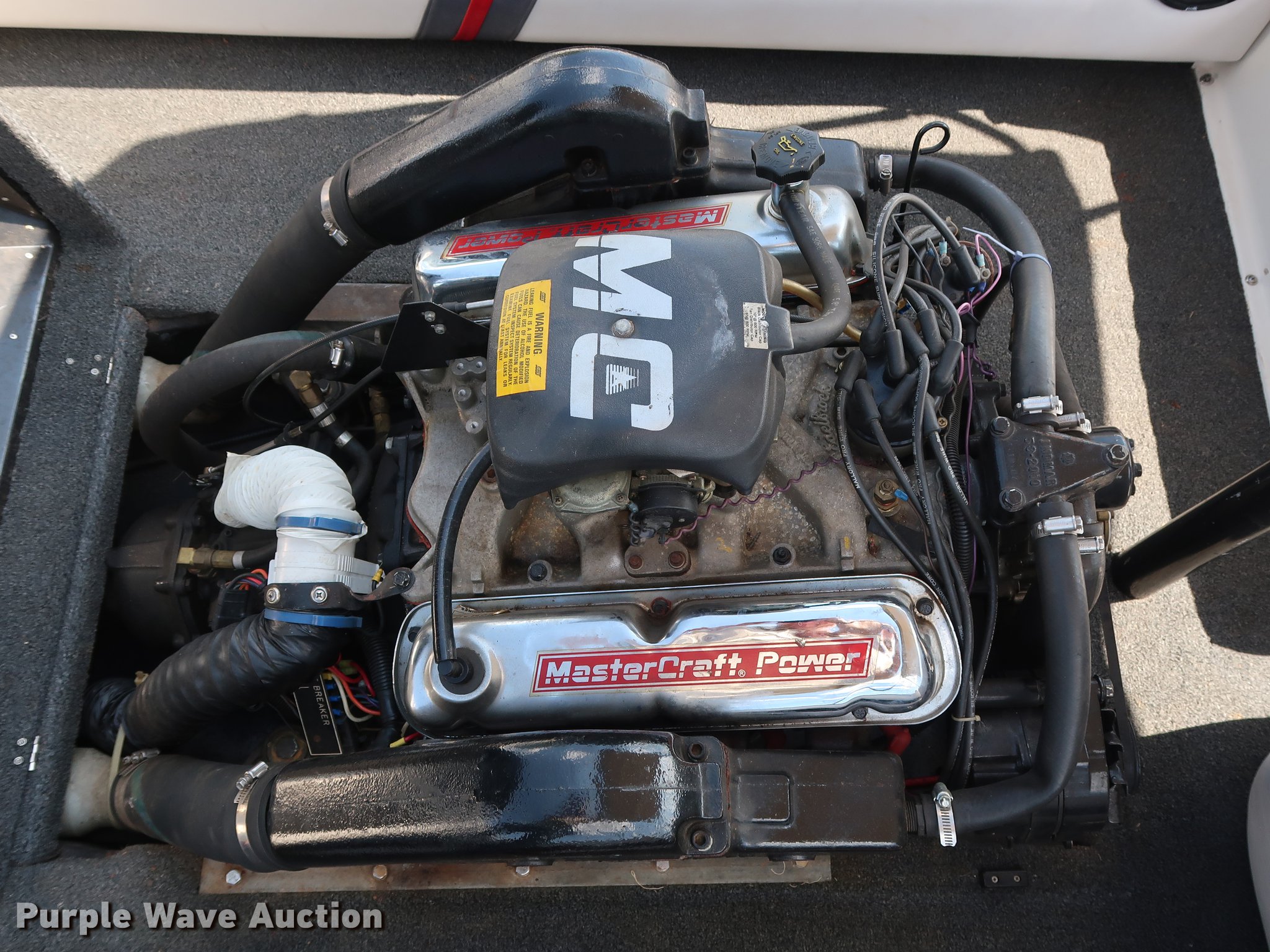 Purple Wave is selling a used Boat in Oklahoma. This item is a 1988 Mastercraft Platinum Prostar 190 20th Anniversary boat with the following: 349 hours on meter, Indmar 351 eight cylinder gas engine, 300 HP, Serial 1F-871962, 19'L, Eight person or 1,085 lbs capacity, Anchor, Sony 5.1 audio system, Sony Xplod AM/FM/CD, Bazooka tube subwoofer, Rear swim platform, Bimini top, Cover, Unit# 004 of 200 manufactured, Hull ID MBCPAAE5G788, Trailer, 21'L, 2" ball hitch, Jack stand, Winch, Single axle, Hercules ST205/75R14 tires
