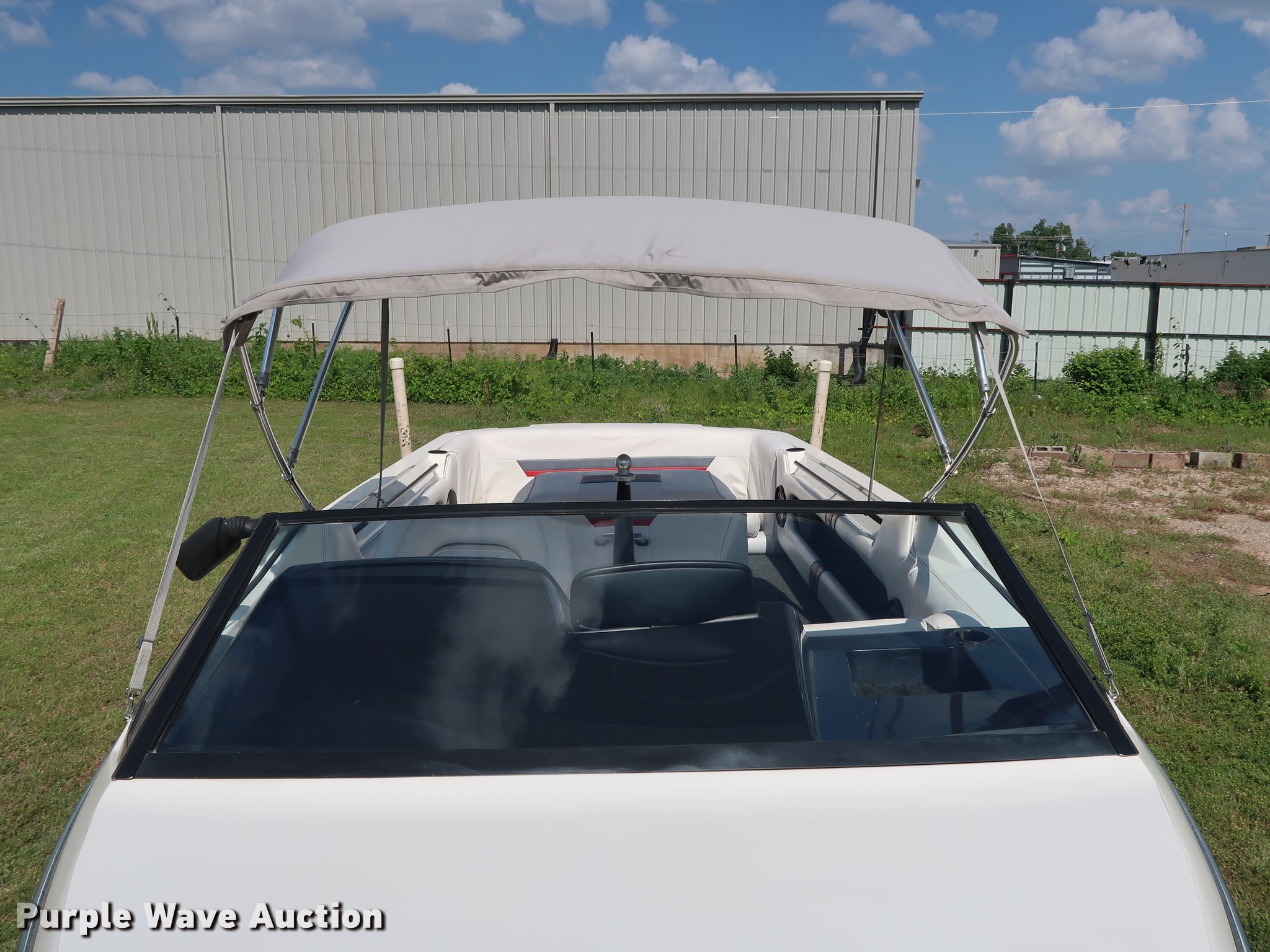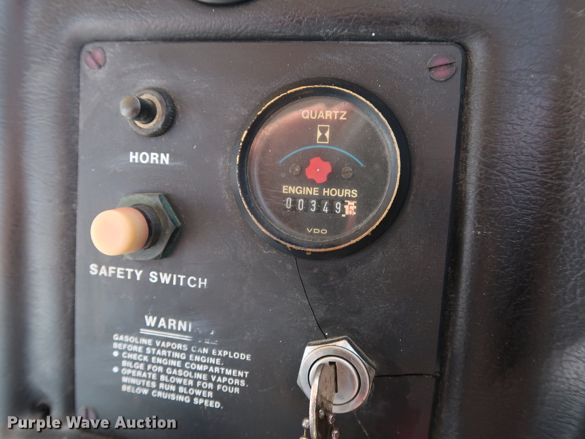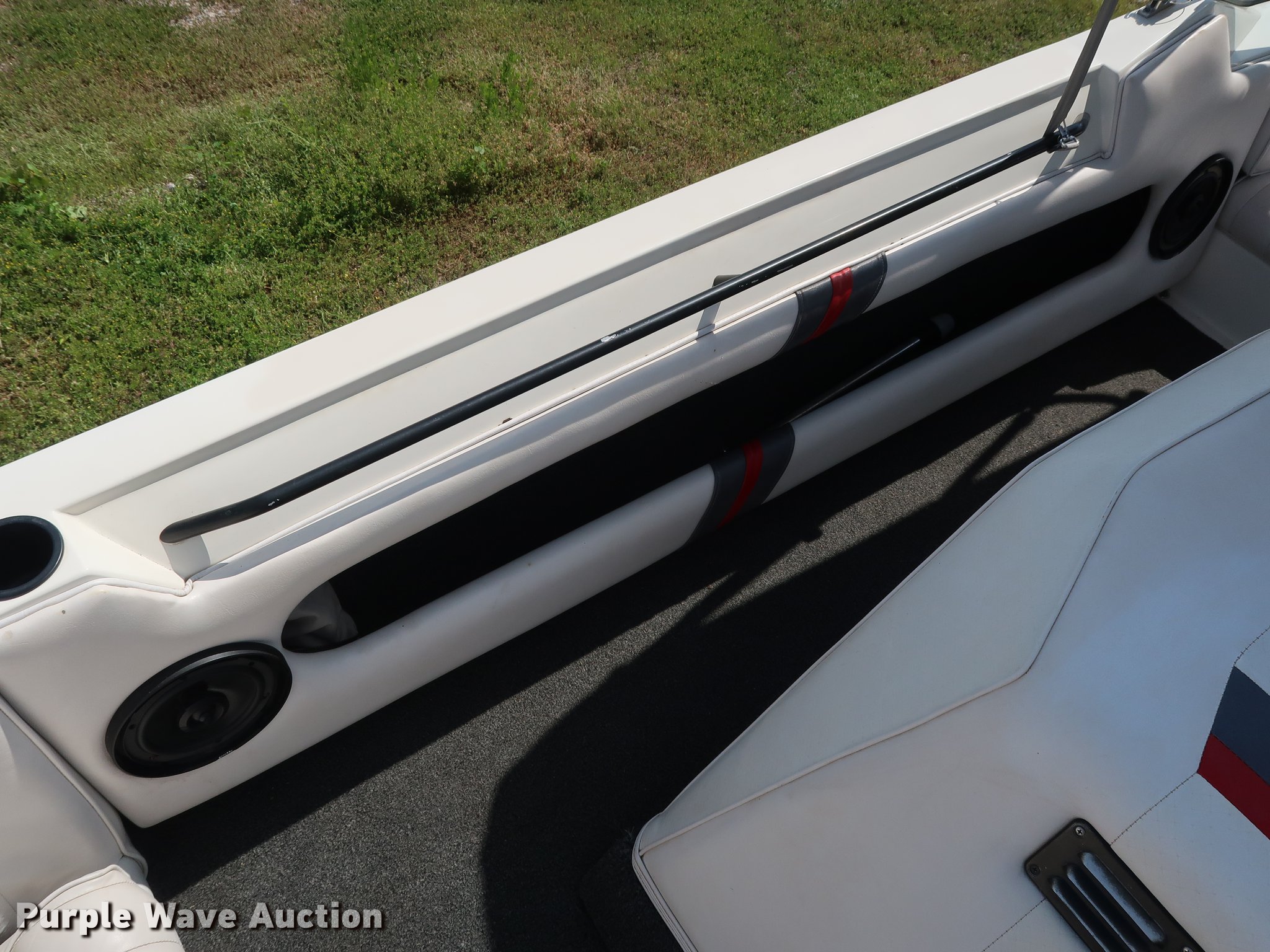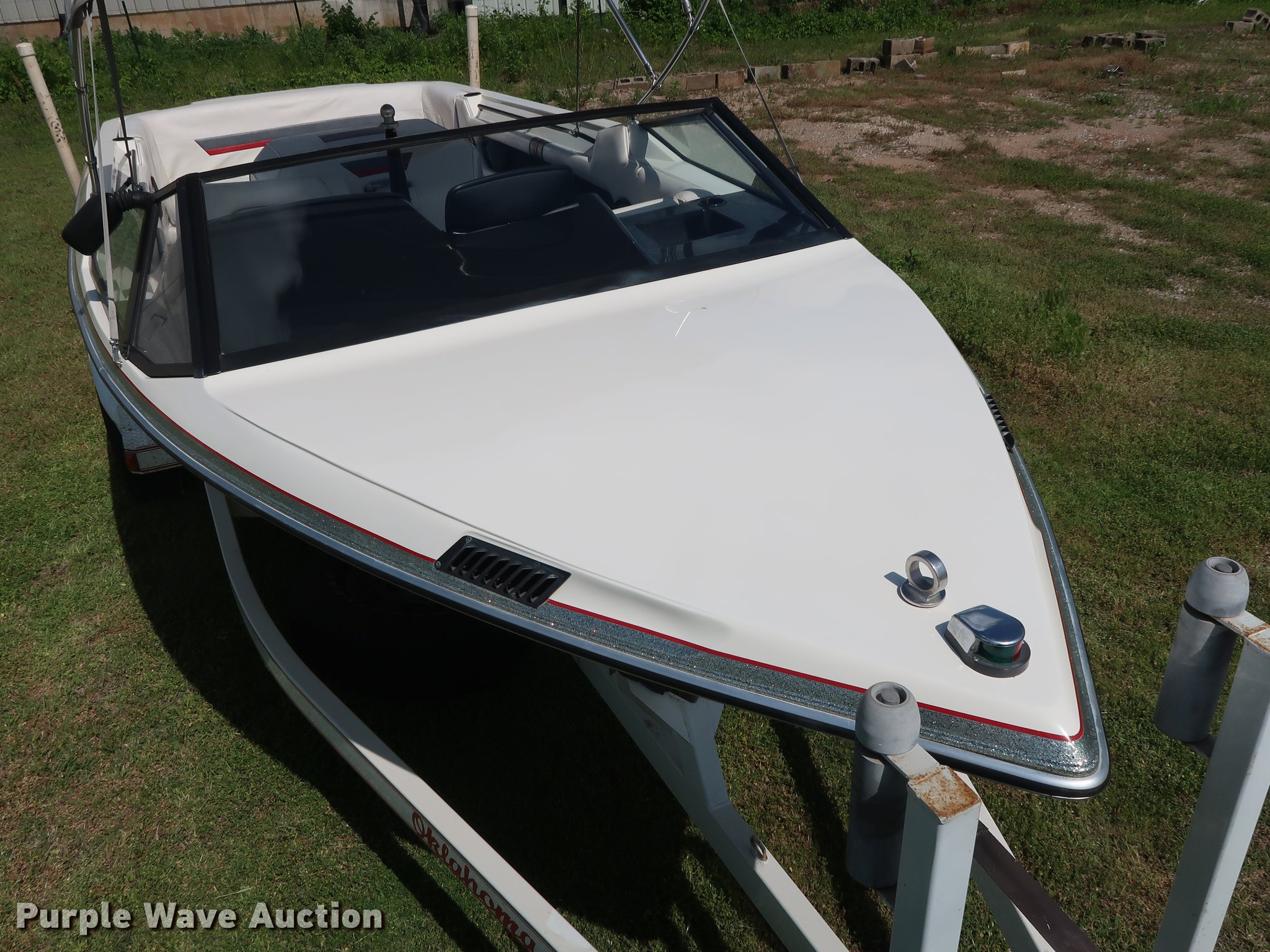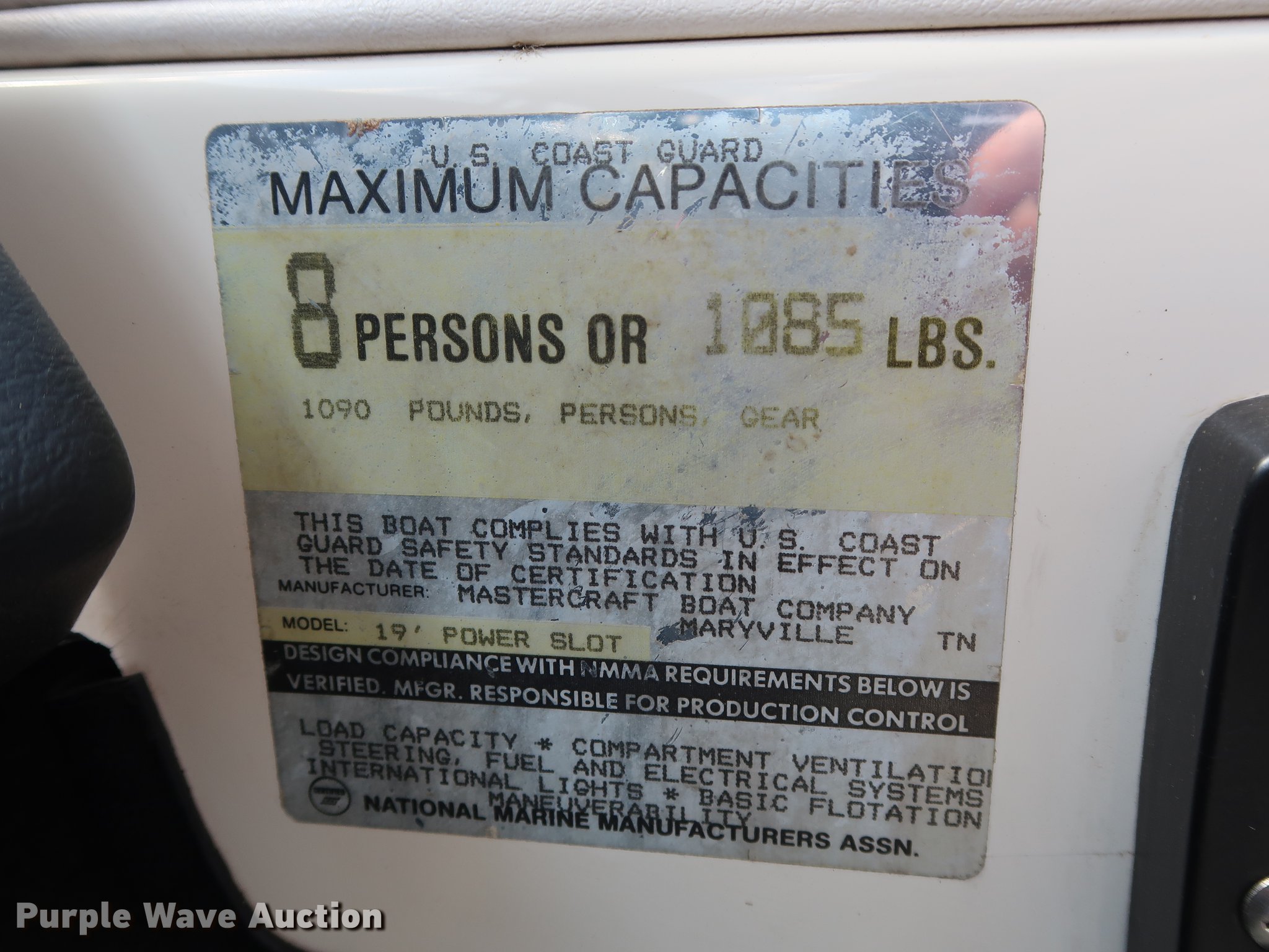 Purple Wave is selling a used Boat in Oklahoma. This item is a 1988 Mastercraft Platinum Prostar 190 20th Anniversary boat with the following: 349 hours on meter, Indmar 351 eight cylinder gas engine, 300 HP, Serial 1F-871962, 19'L, Eight person or 1,085 lbs capacity, Anchor, Sony 5.1 audio system, Sony Xplod AM/FM/CD, Bazooka tube subwoofer, Rear swim platform, Bimini top, Cover, Unit# 004 of 200 manufactured, Hull ID MBCPAAE5G788, Trailer, 21'L, 2" ball hitch, Jack stand, Winch, Single axle, Hercules ST205/75R14 tires