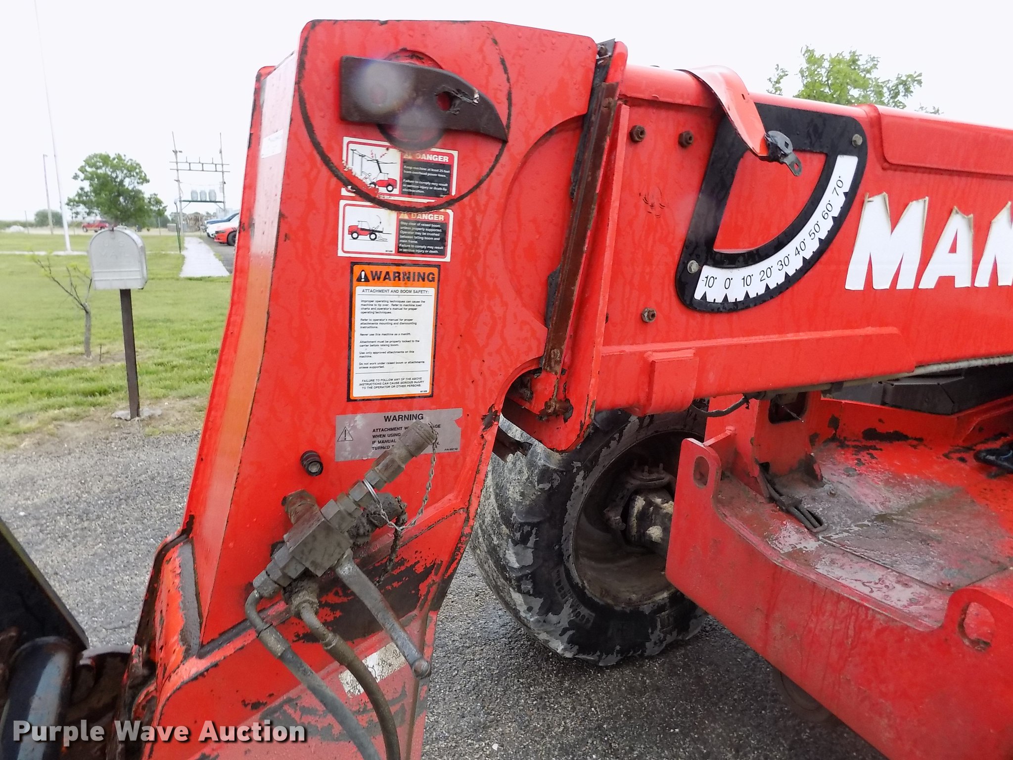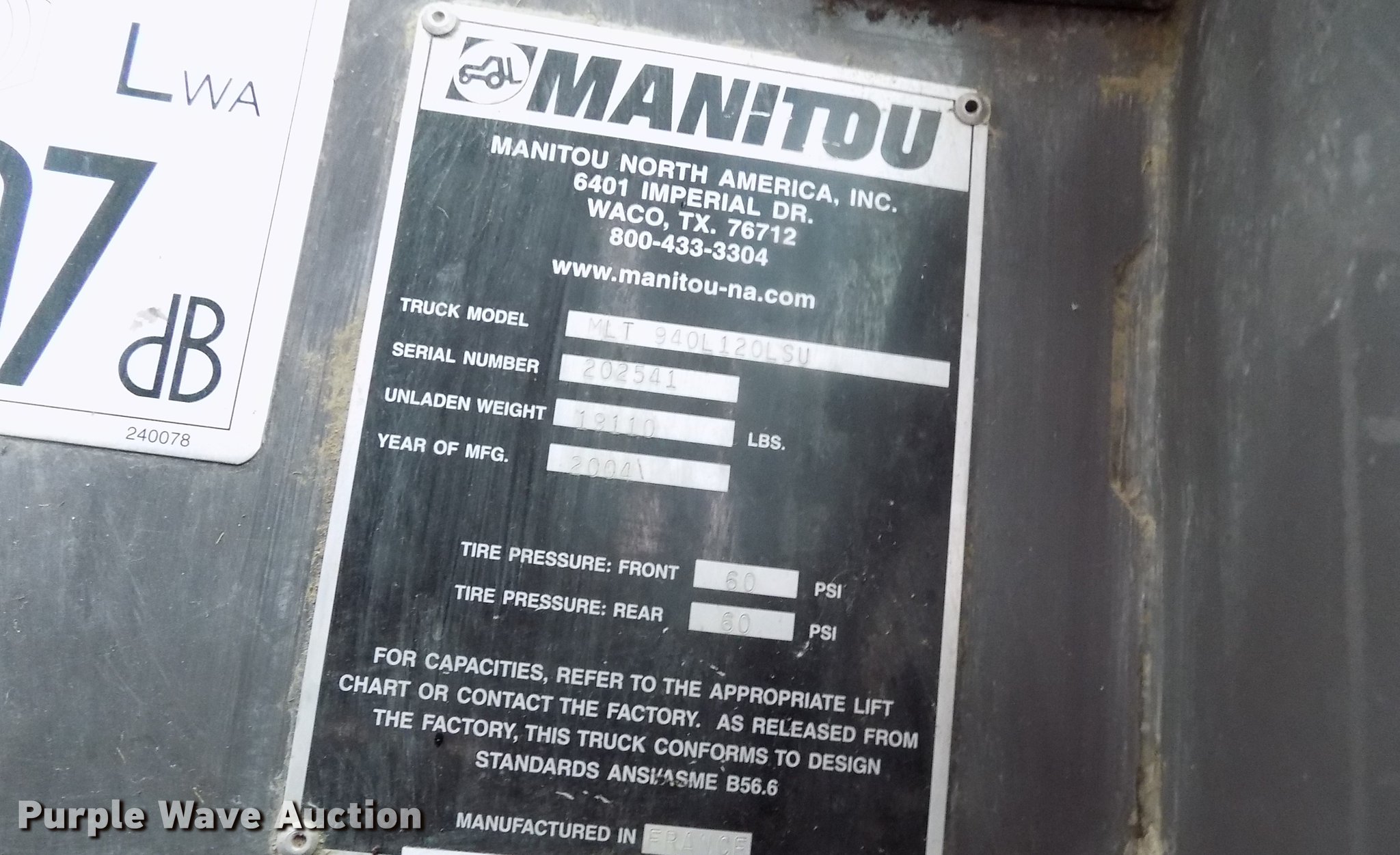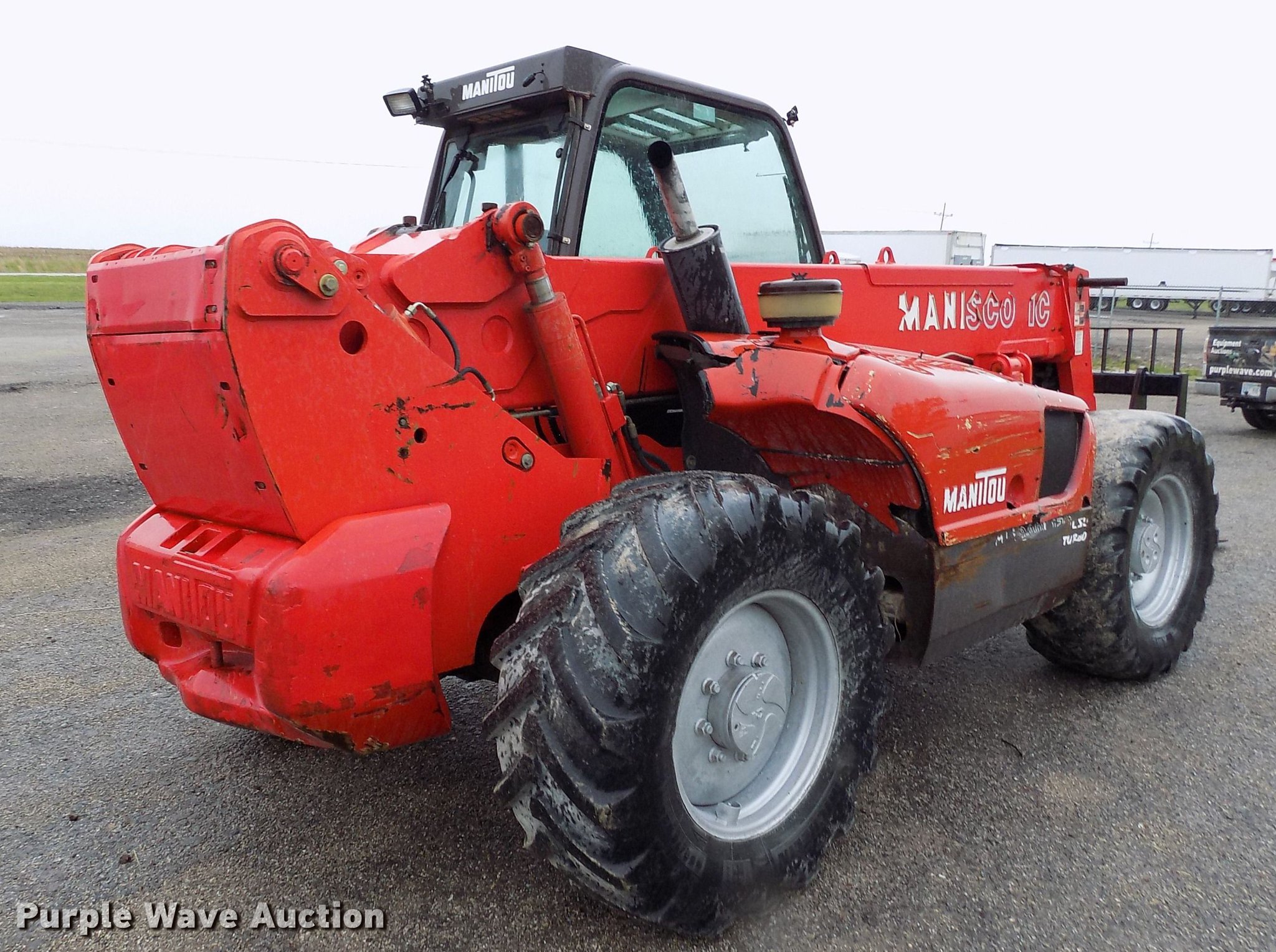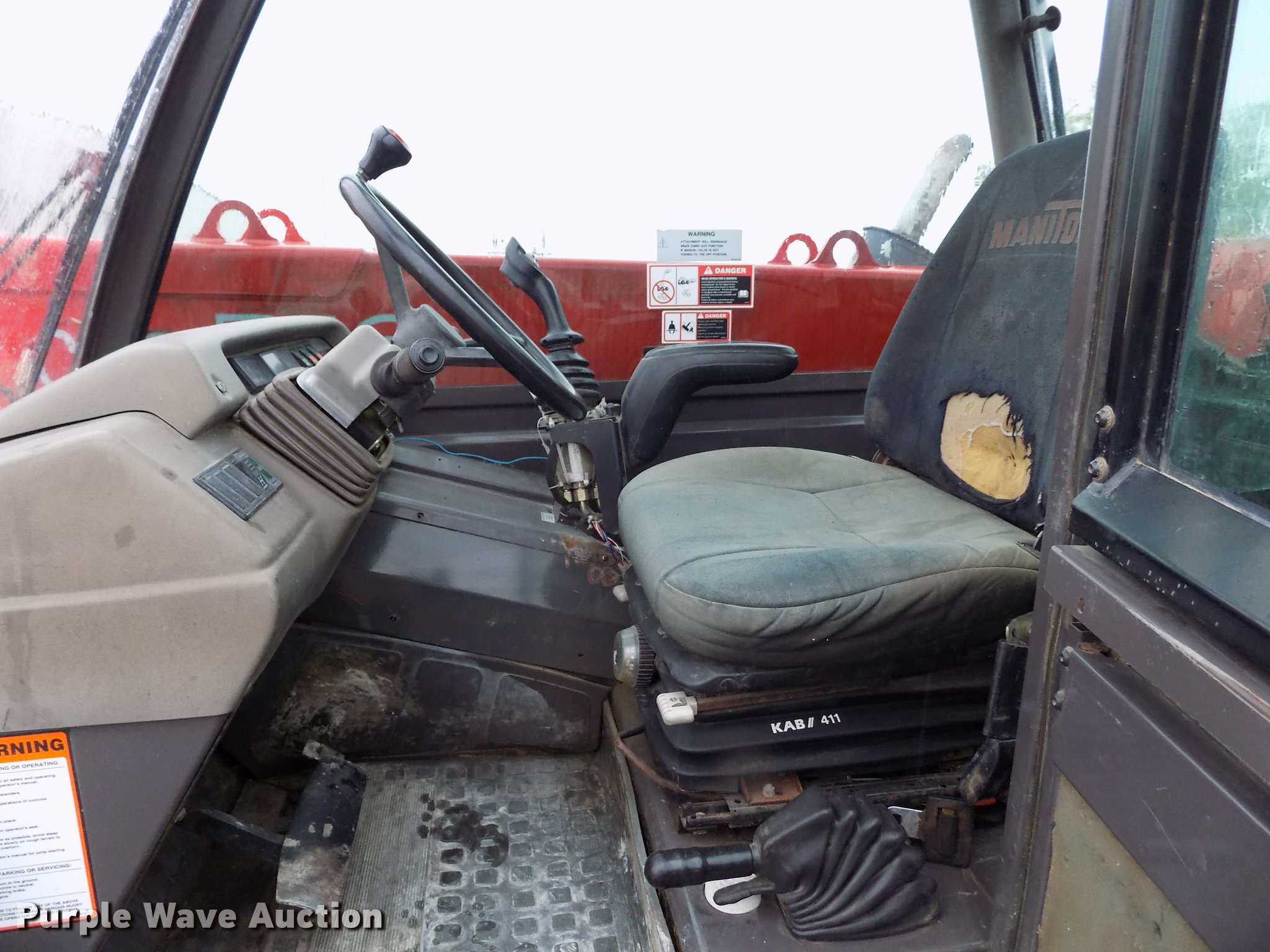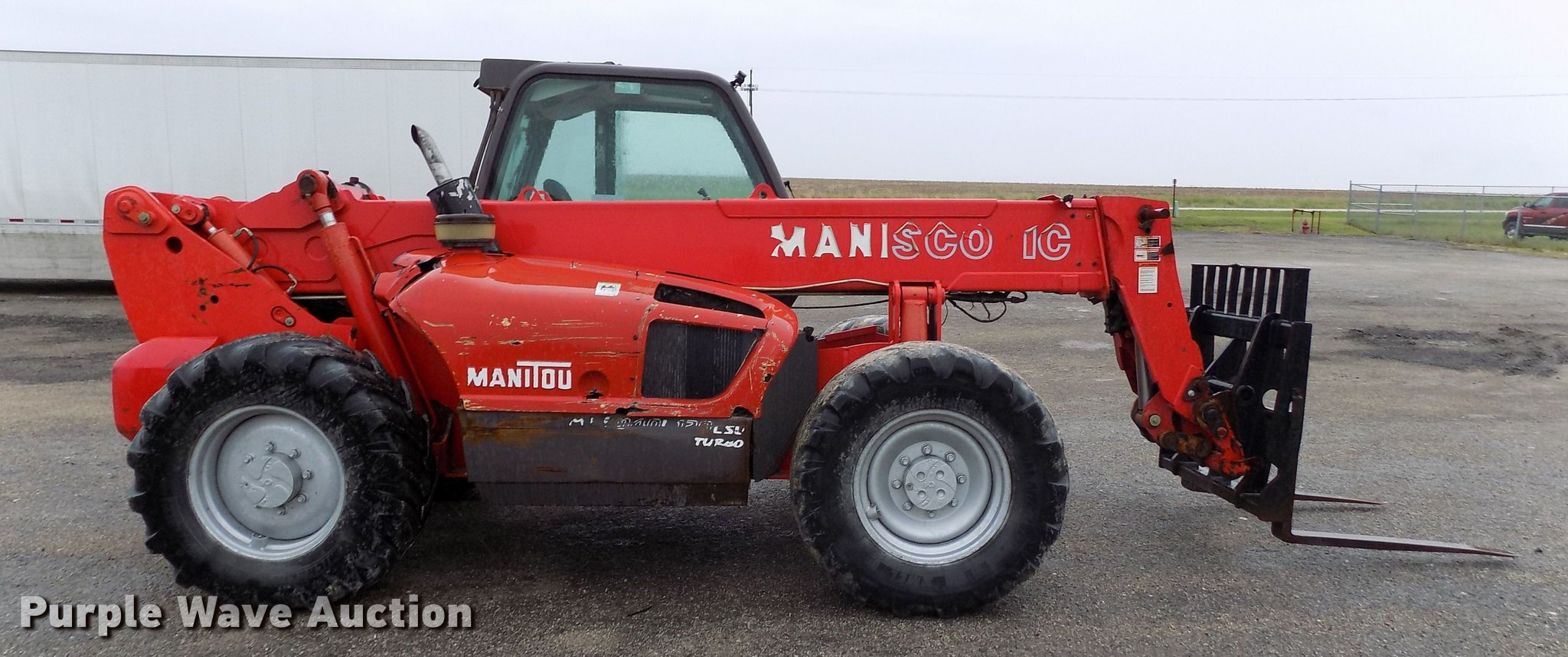 Purple Wave is selling a used Telehandler in Kansas. This item is a 2004 Manitou MLT940L120LSU telehandler with the following: 3,913 hours on meter, Perkins four cylinder diesel engine, Manual transmission, 4F-4R gears, Four wheel drive, Crab steering, Four wheel steering, Enclosed cab, AC and heat, AM/FM, 8,818 lbs max lift capacity, 29.5' max lift height, Three stage boom, 48"L forks, 98.5"W bucket, Hydraulic quick attach, 460/70R24 tires, Tilt carriage disabled, Serial 202541