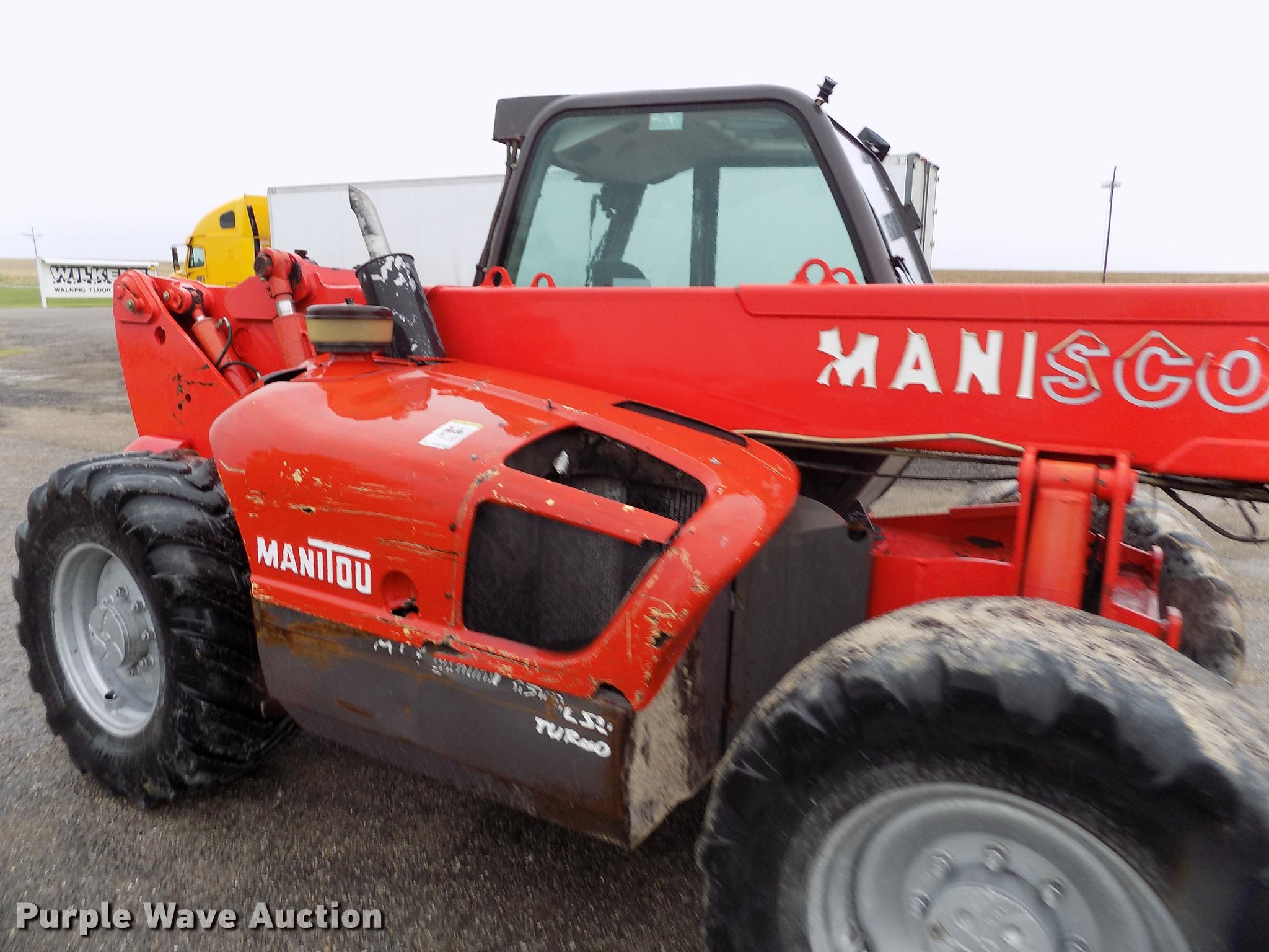 2004 Manitou MLT940L120LSU telehandler. 3,913 hours on meter, Perkins four cylinder diesel engine, Manual transmission 4F-4R gears, Four wheel drive, Crab steering, Four wheel steering, Enclosed cab AC and heat, AM/FM, 8,818 lbs max lift capacity, 29.5' max lift height, Three stage boom, 48"L forks, 98.5"W bucket, Hydraulic quick attach, 460/70R24 tires, Tilt carriage disabled, Serial 202541. Wilkens Mfg. Inc.. 1480 US-183. Stockton, KS 67669