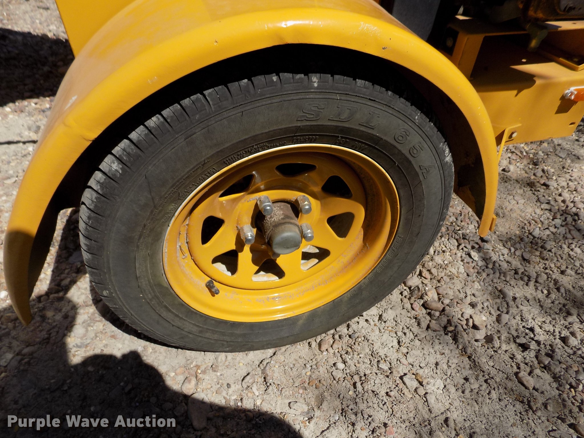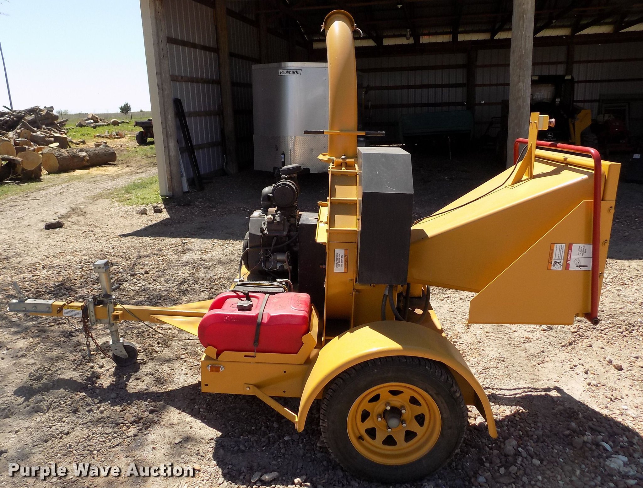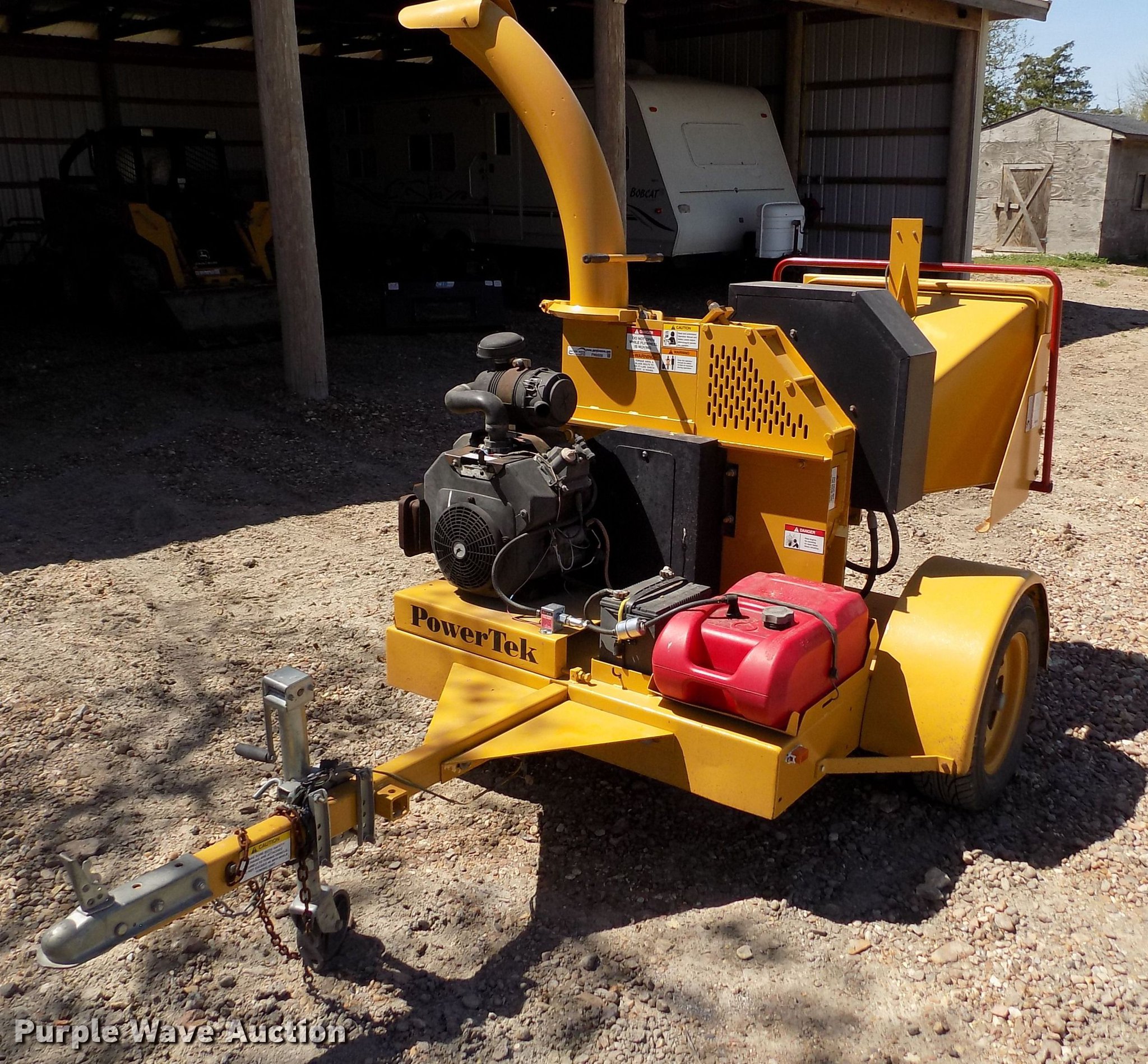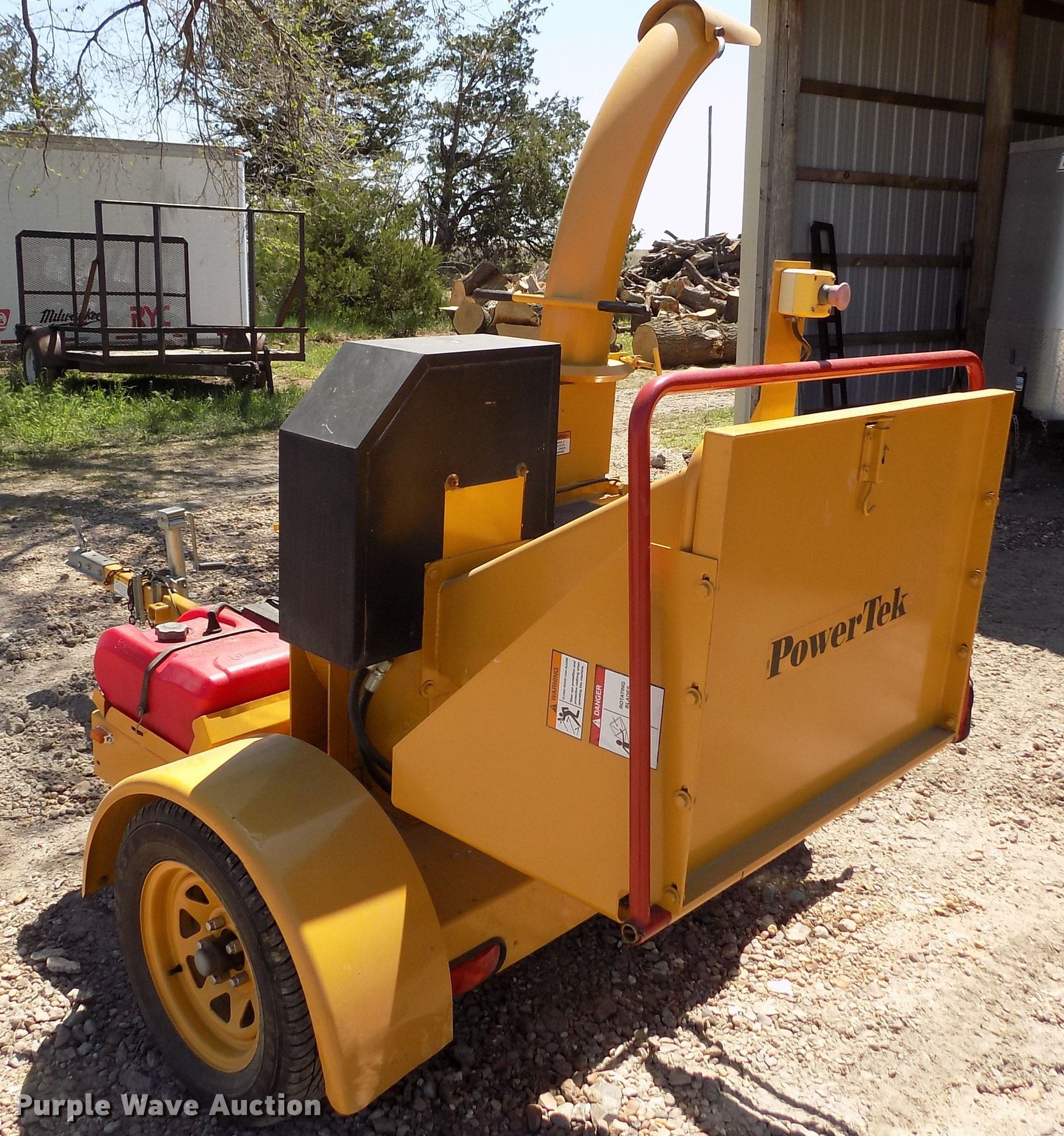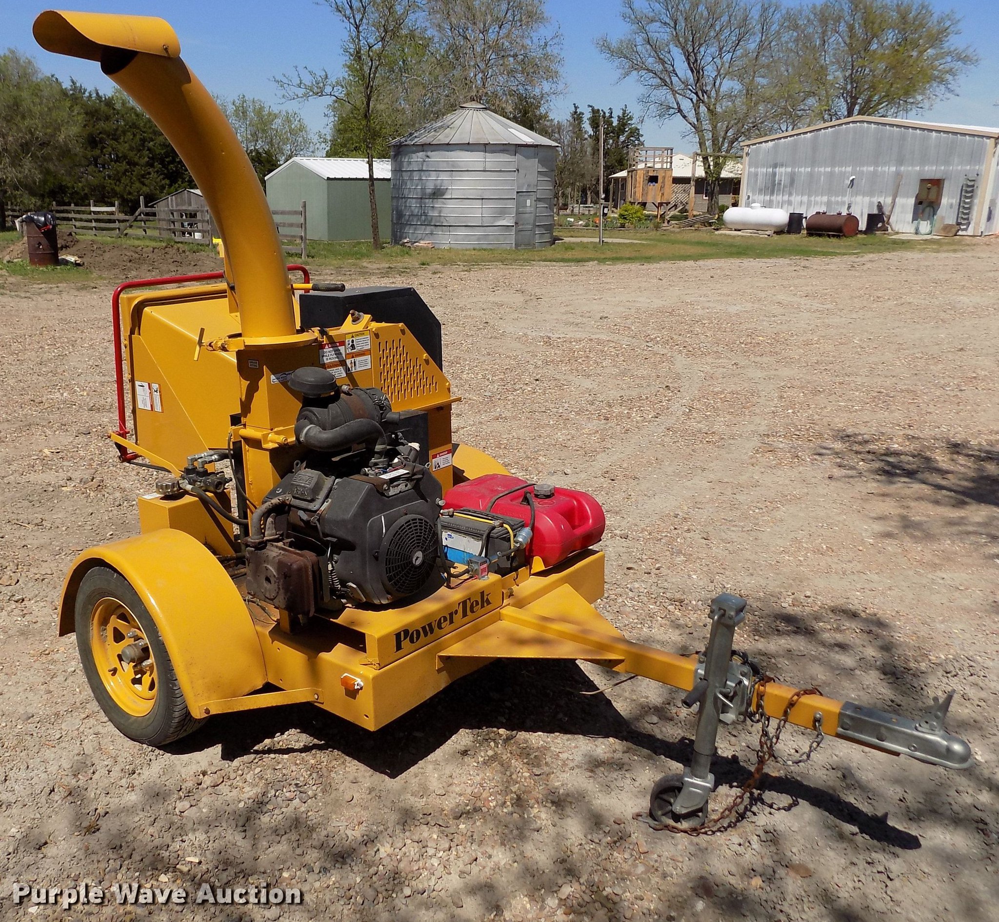 Purple Wave is selling a used Wood Chipper or Stump Grinder in Kansas. This item is a Powertek 727 wood chipper with the following: Unknown hours on meter, Hours meter inoperable, Kohler gas engine, 25 HP, 7" diameter capacity, Forward and reverse feed, Adjustable chute angle, Jack stand, 2" ball hitch, 205/75R14 tires