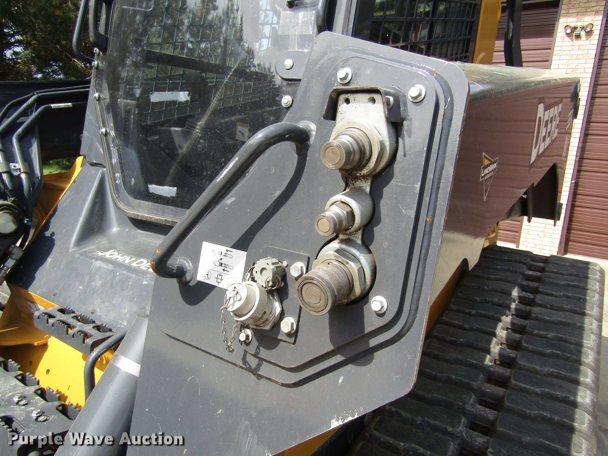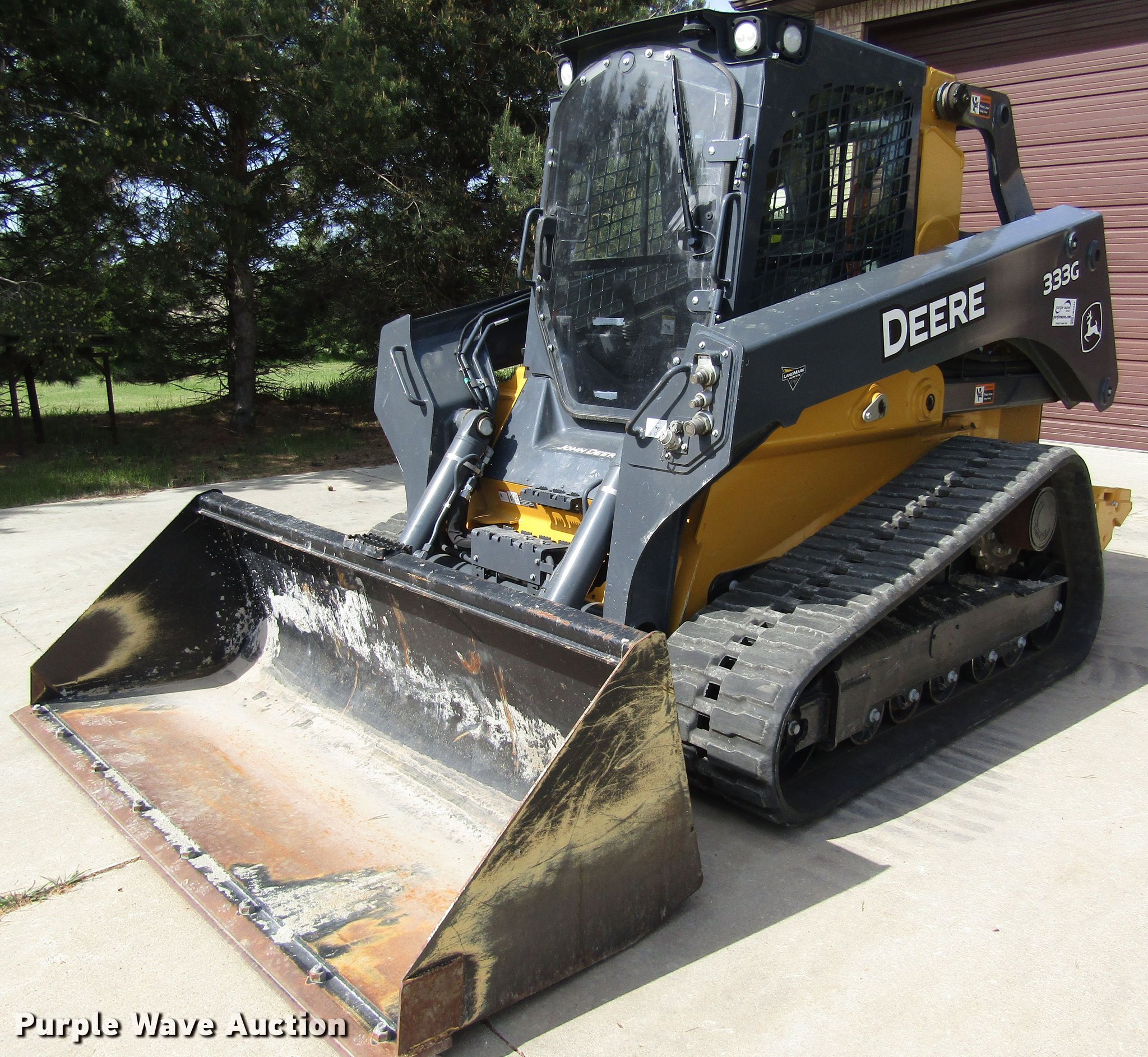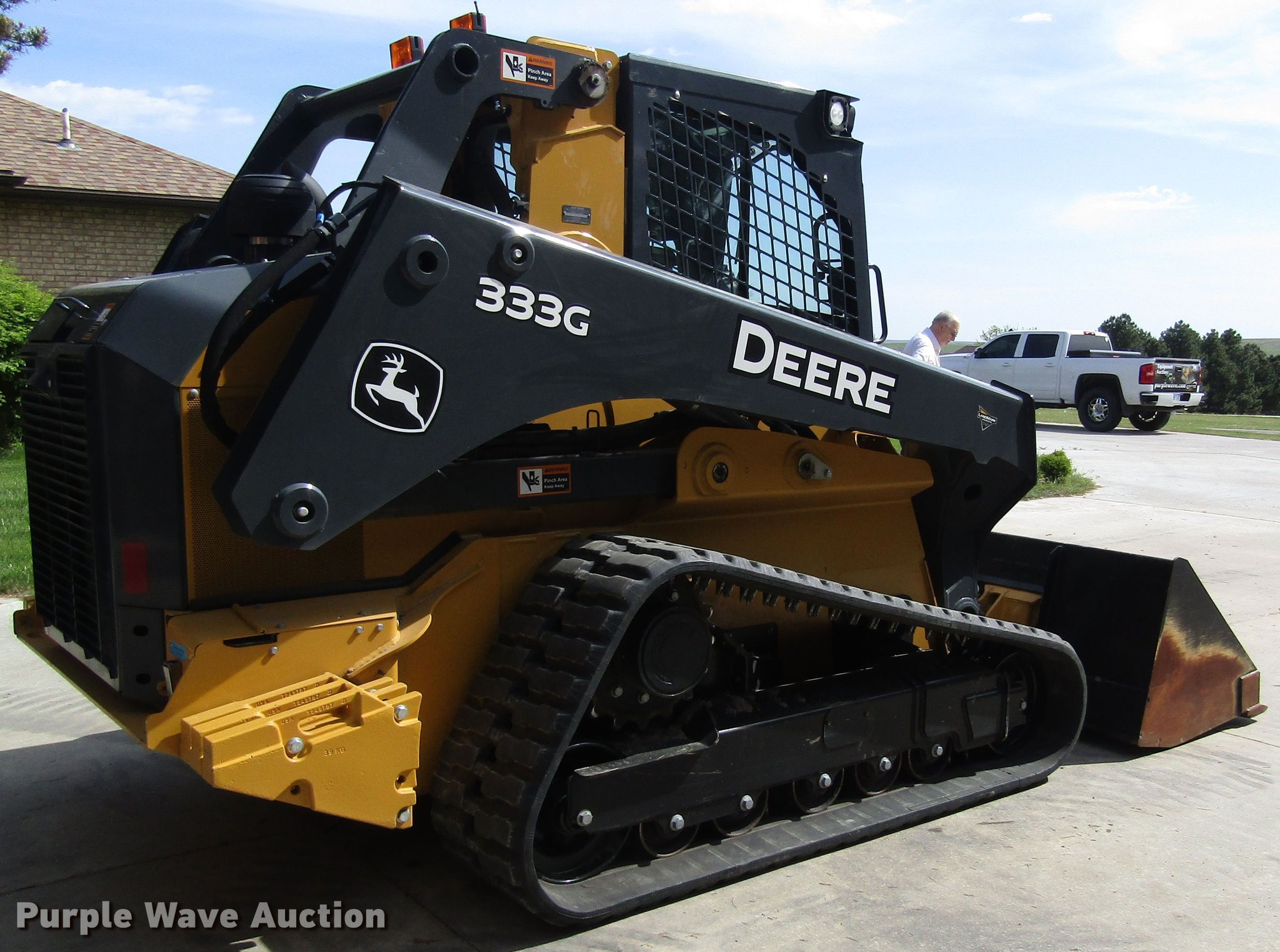 Purple Wave is selling a used Tracked Skid Steer Loader in Kansas. This item is a 2017 John Deere 333G skid steer with the following: 173 hours on meter, Yanmar four cylinder diesel engine, 100 HP, Two speed hydrostatic transmission, Enclosed cab, AC and heat, Foot bucket controls, Three mode pattern changer, Heated air suspension seat, Front and rear work lights, Backup camera, Backup alarm, Ride control, Auxiliary hydraulics, Hydraulic quick coupler, John Deere U84 bucket, 84"W, Bolt-on cutting edge, 27 cu. ft. capacity, Self-leveling, Diesel exhaust fluid, Bobcat attachment harness adapter kit, (3) counter weight sets, Five bottom rollers, 18"W tracks, Serial 1T0333GKJHF310302