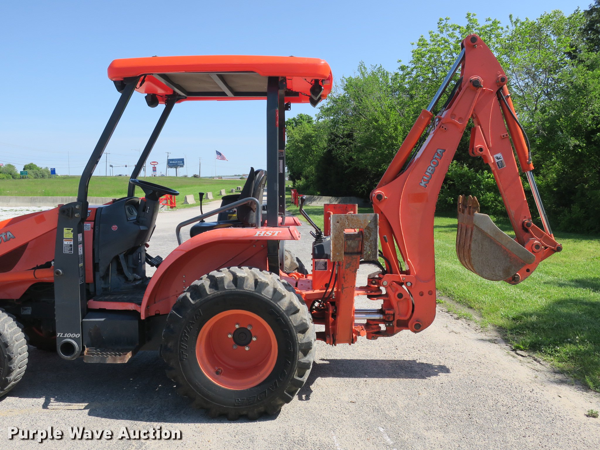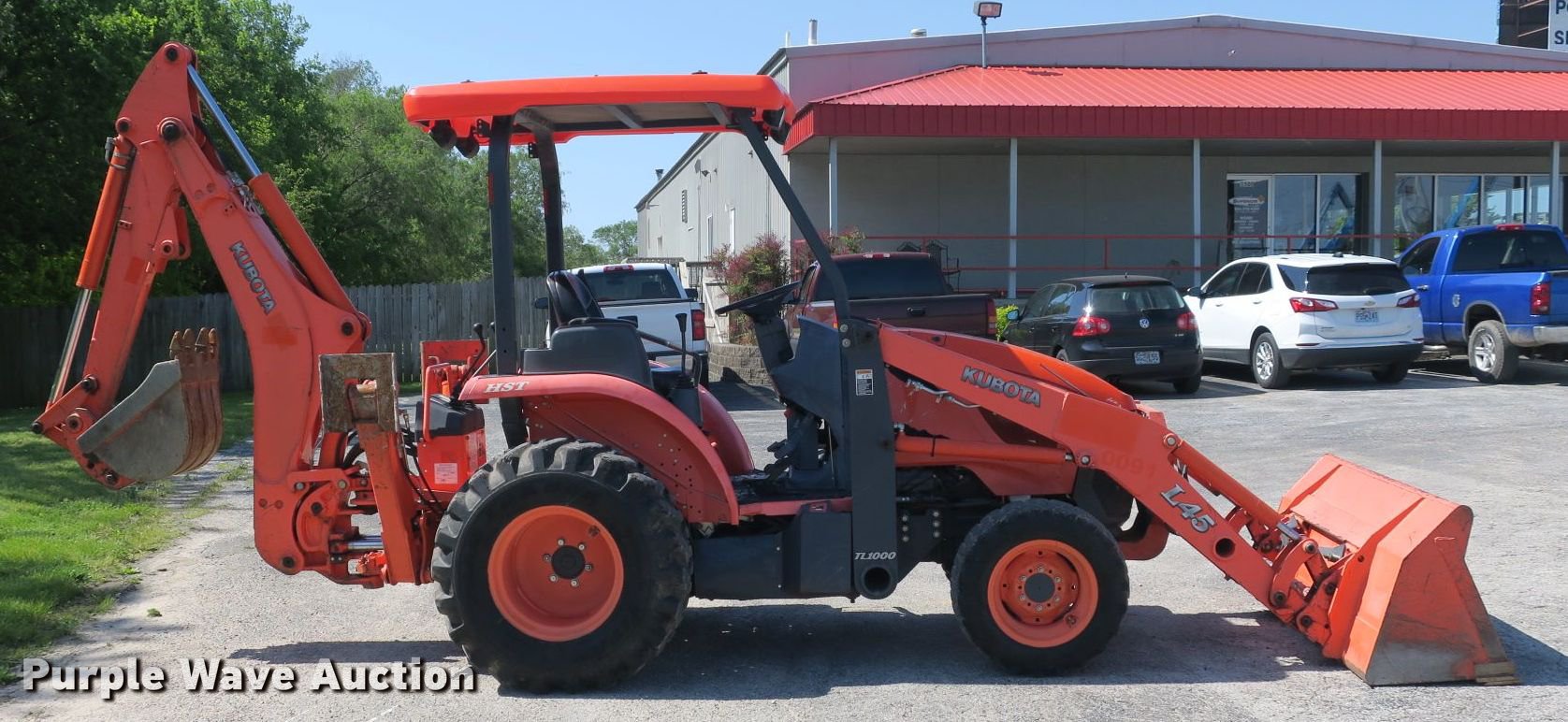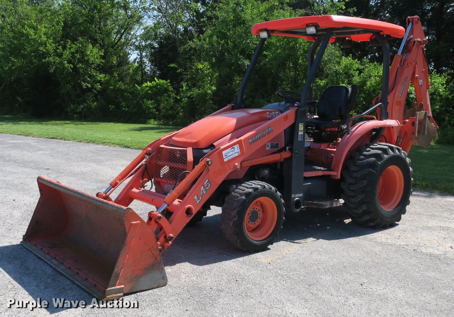 Purple Wave is selling a used Tractor Loader Backhoe in Missouri. This item is a 2012 Kubota L45 backhoe with the following: 875 hours on meter, Kubota V2203-M-ET13 2.2L four cylinder diesel engine, 33.5 kW, Powershift transmission, 24F-24R gears, Four wheel drive, Differential lock, OROPS, Serial A0173, Suspension seat, Wobble stick backhoe controls, Front and rear work lights, Manual quick coupler, TL1000 loader, 71"W loader bucket, Bolt-on cutting edge,, Kubota backhoe bucket, 17"W, Weld-on cutting edge, (4) teeth, 27x10.5-15 front tires, 15x19.5 rear tires, Serial 50091