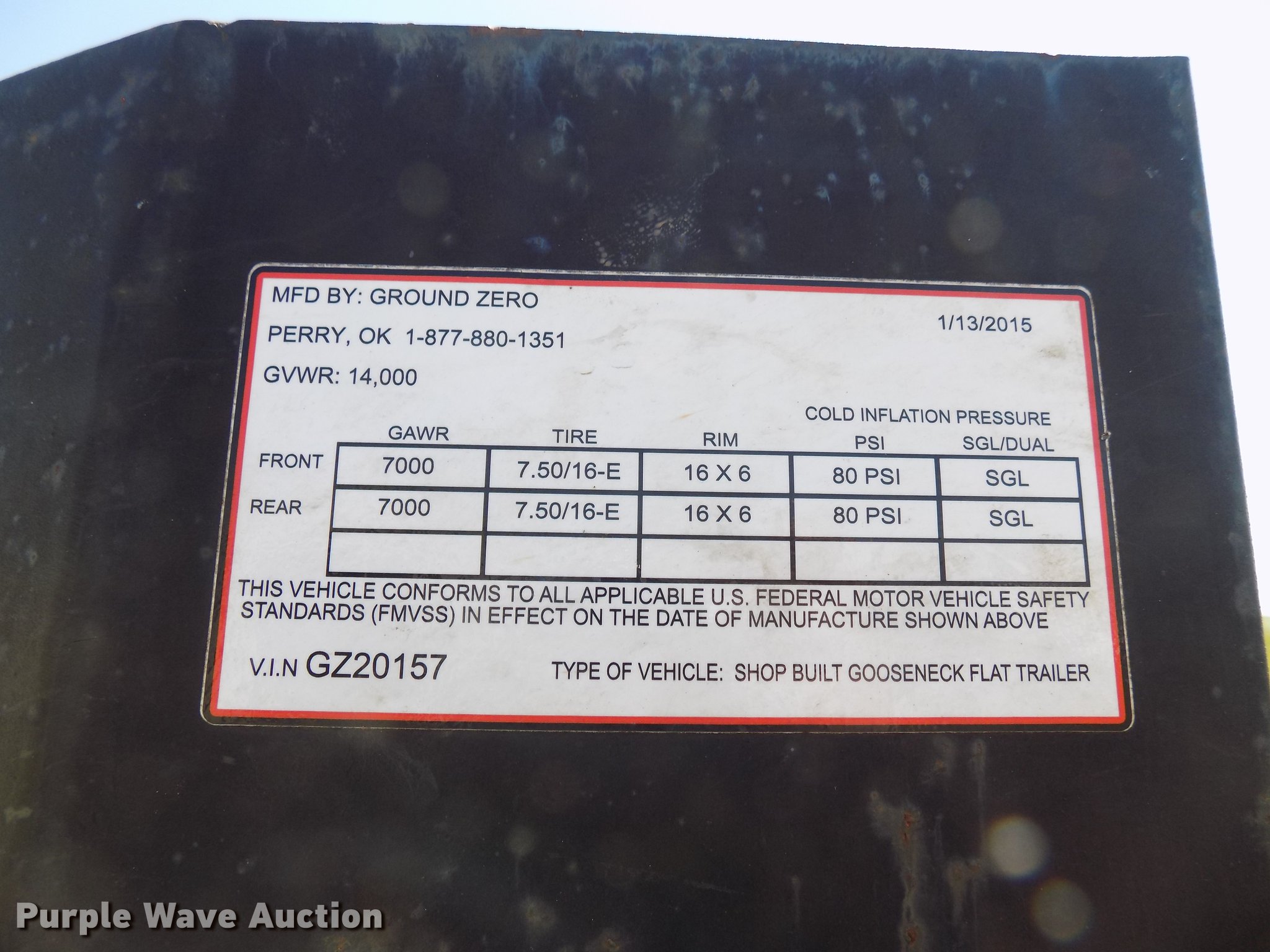 Purple Wave is selling a used Equip. Trailer in Oklahoma. This item is a 2015 Ground Zero equipment trailer with the following: 34' overall length, 25'L x 96"W steel deck, Single leg landing gear, Electric brakes, Tandem axle, 7.50R16 tires, GVWR 14,000 lbs