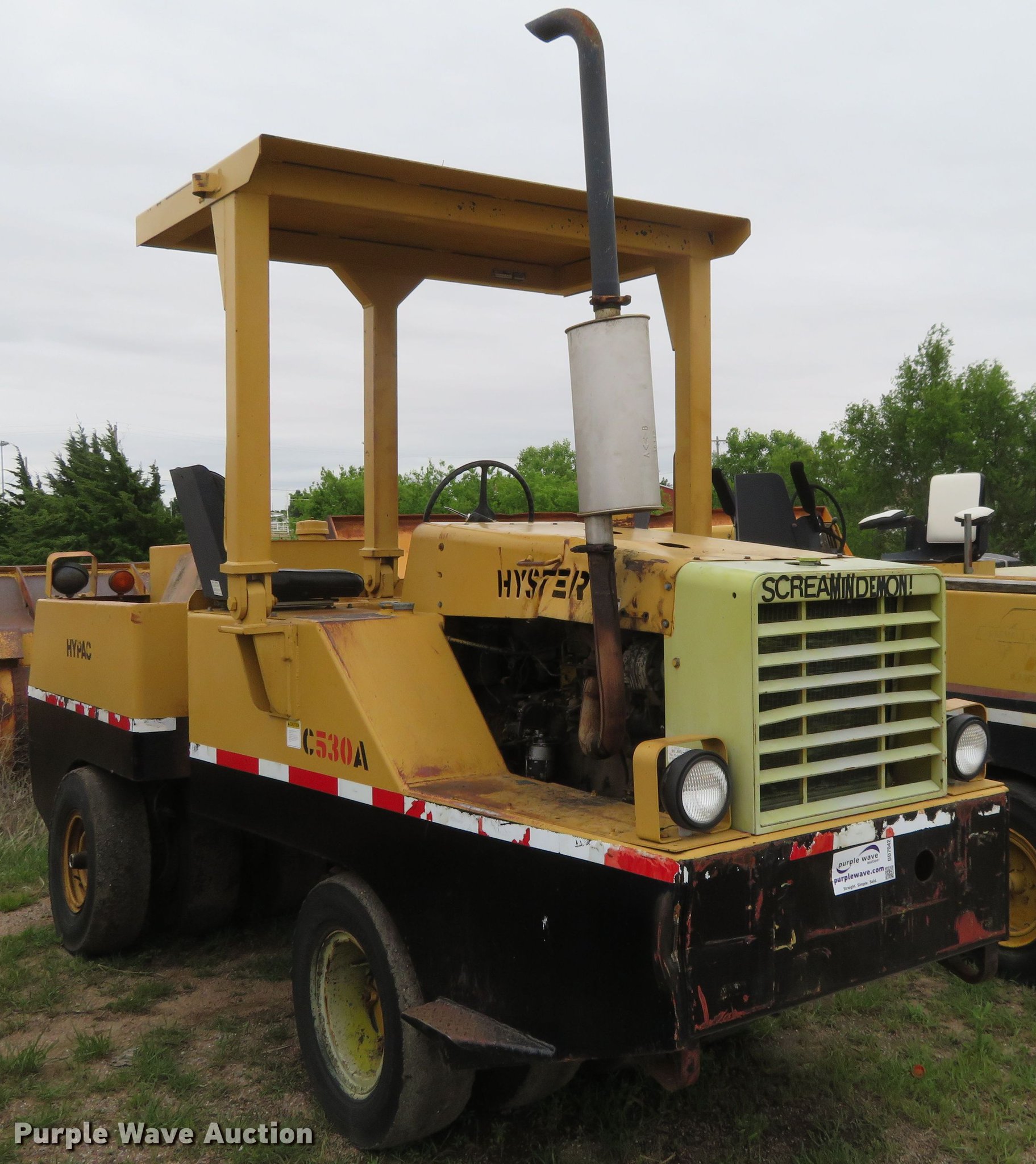 Purple Wave is selling a used Pneumatic Roller in Kansas. This item is a Hyster C530A pneumatic roller with the following: 1,606 hours on meter, Four cylinder diesel engine, Three speed manual transmission, 7.50-15 tires